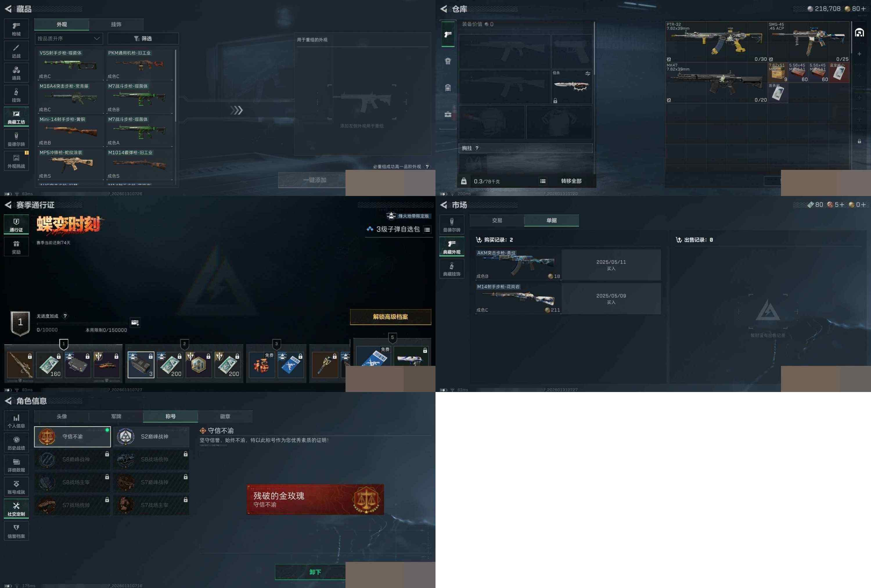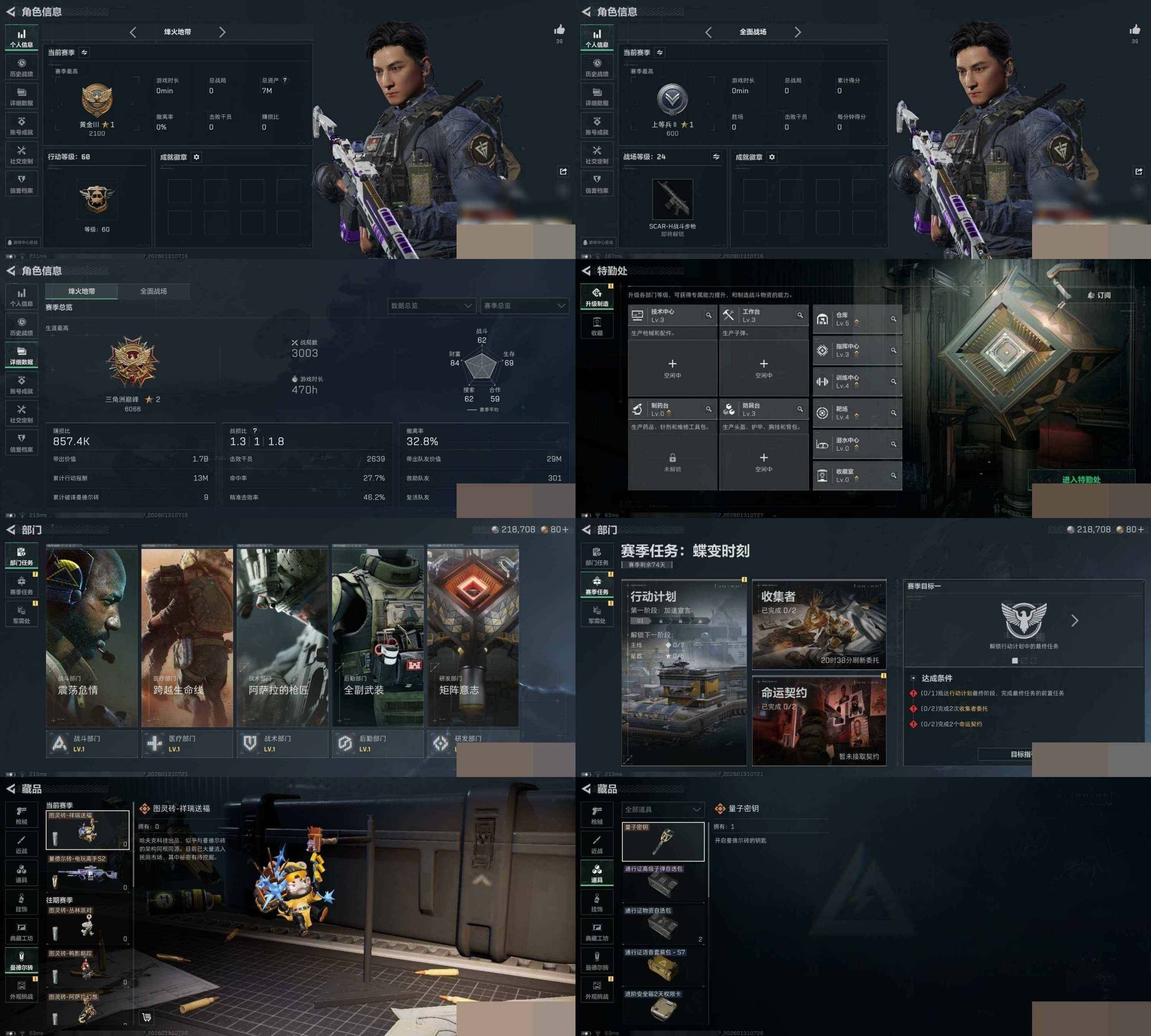 总资产6m 红狼 彦祖 信条 黑海 烽火地带段位: 黄金 全面战场段位: 上等兵 总资产: 6000000 哈夫币: 218000