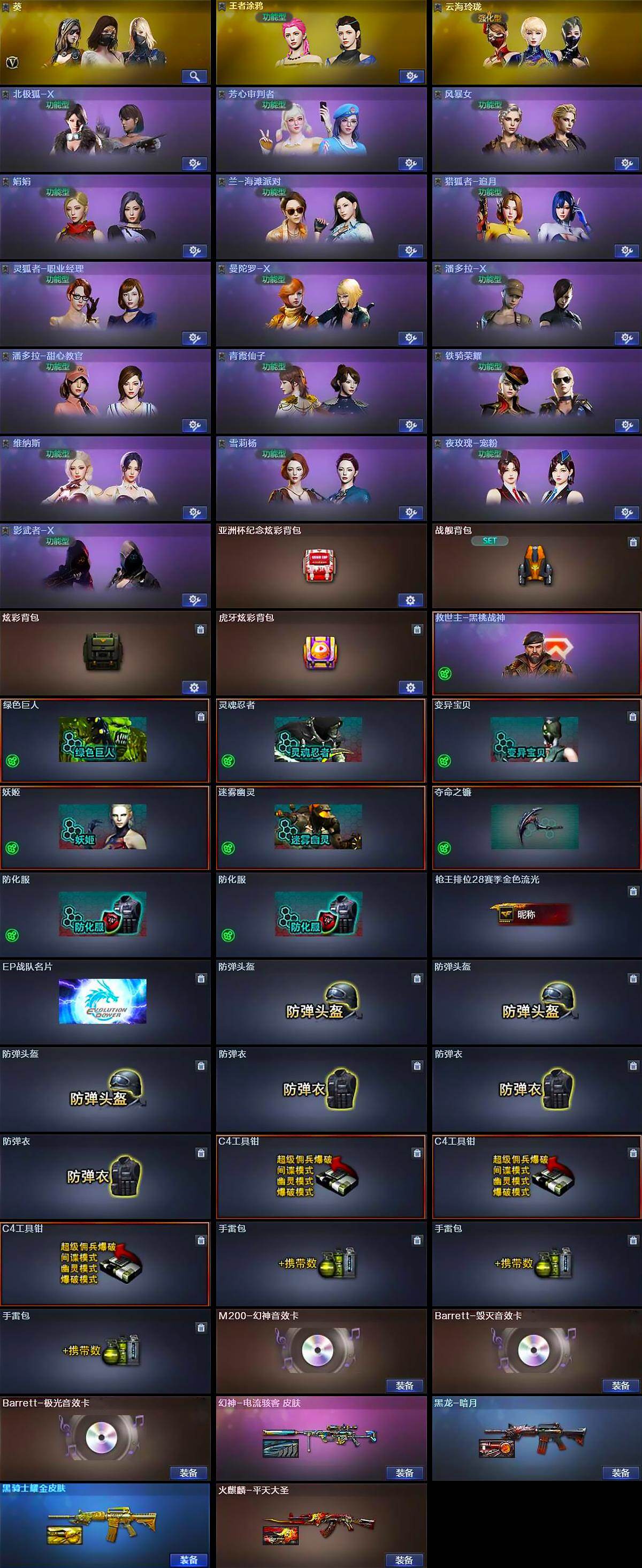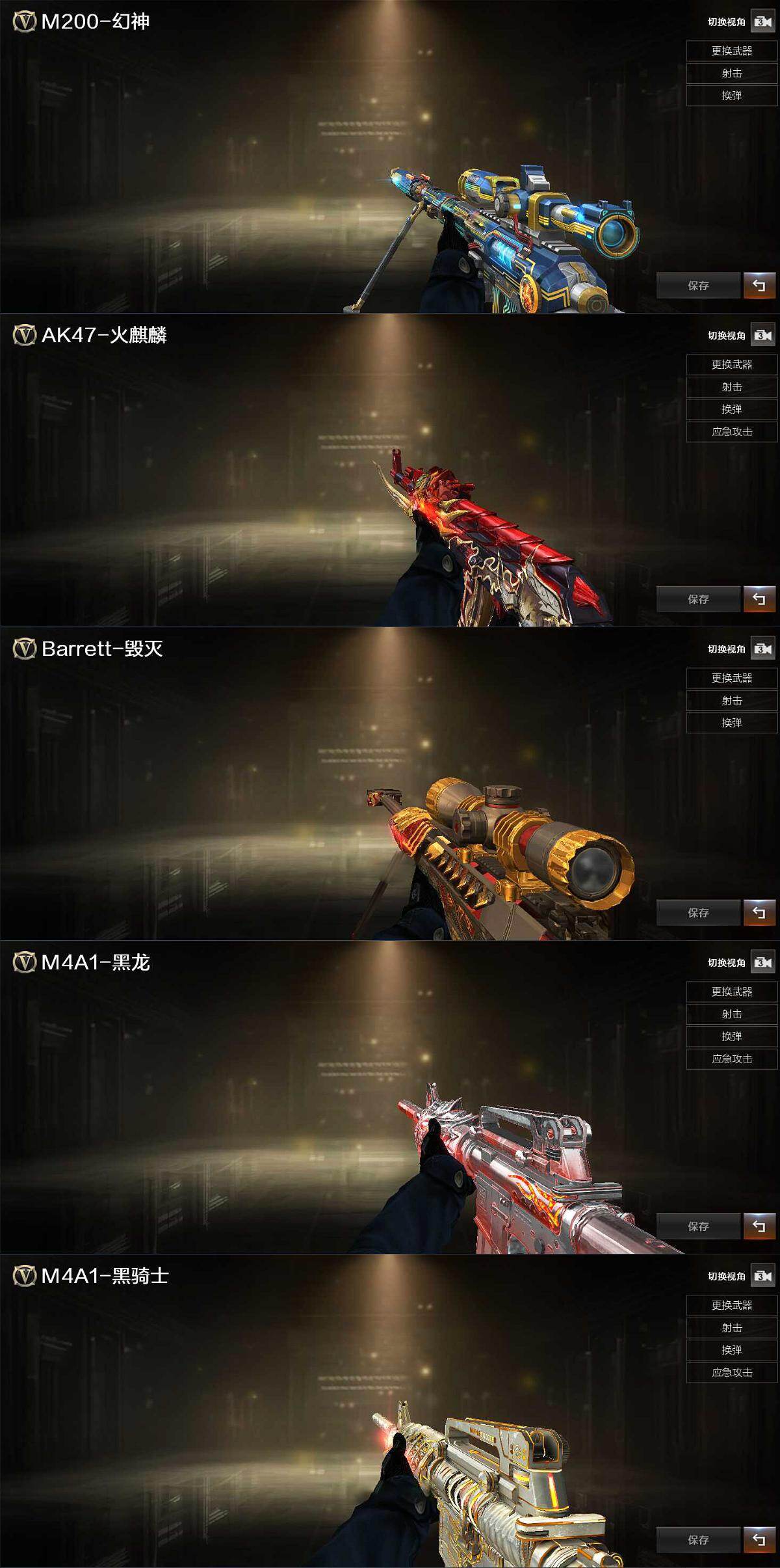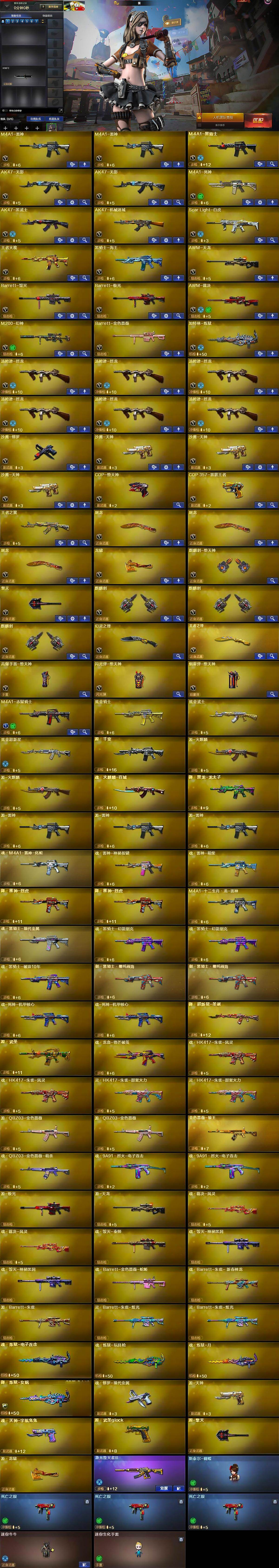 【热门武器】:Scar Light-白虎,M200-幻神,死亡之眼*3,M4A1-黑骑士,汤姆逊-烈龙*6,加特林-炼狱,斯泰尔-蝴蝶,COP-堕天神,沙鹰-修罗,金刚伞