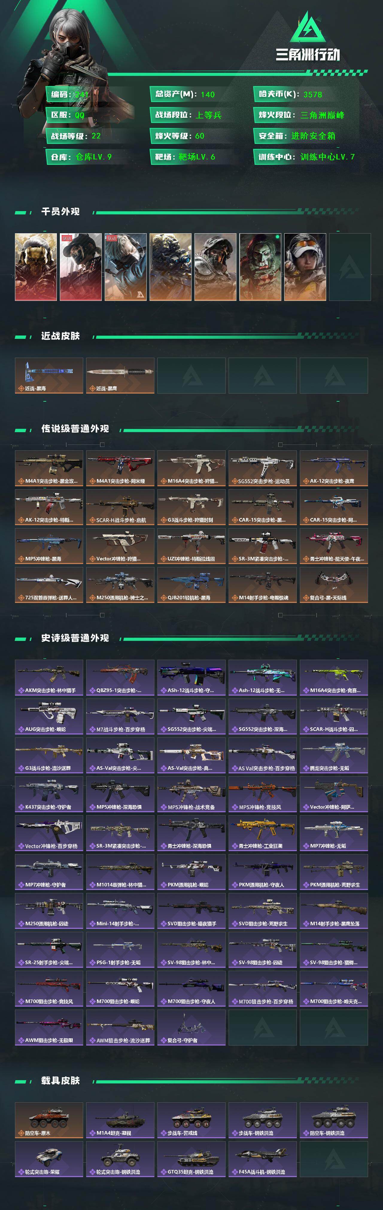 【精氪男神号·7干员皮·蚀金玫瑰·露娜·近战黑海·20传说枪皮·140m·9级仓库·满级体力·5级指挥中心】