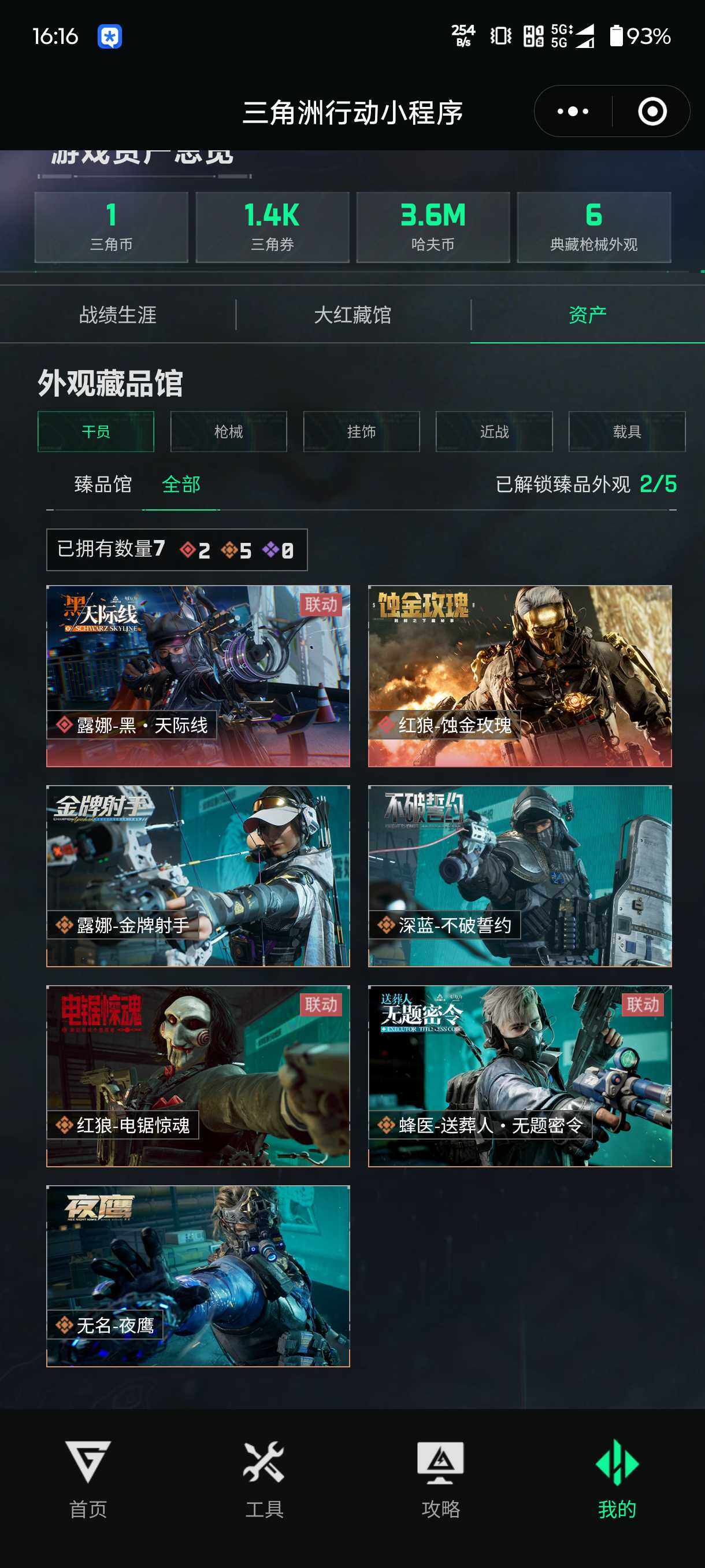 【精氪男神号·7干员皮·蚀金玫瑰·露娜·近战黑海·20传说枪皮·140m·9级