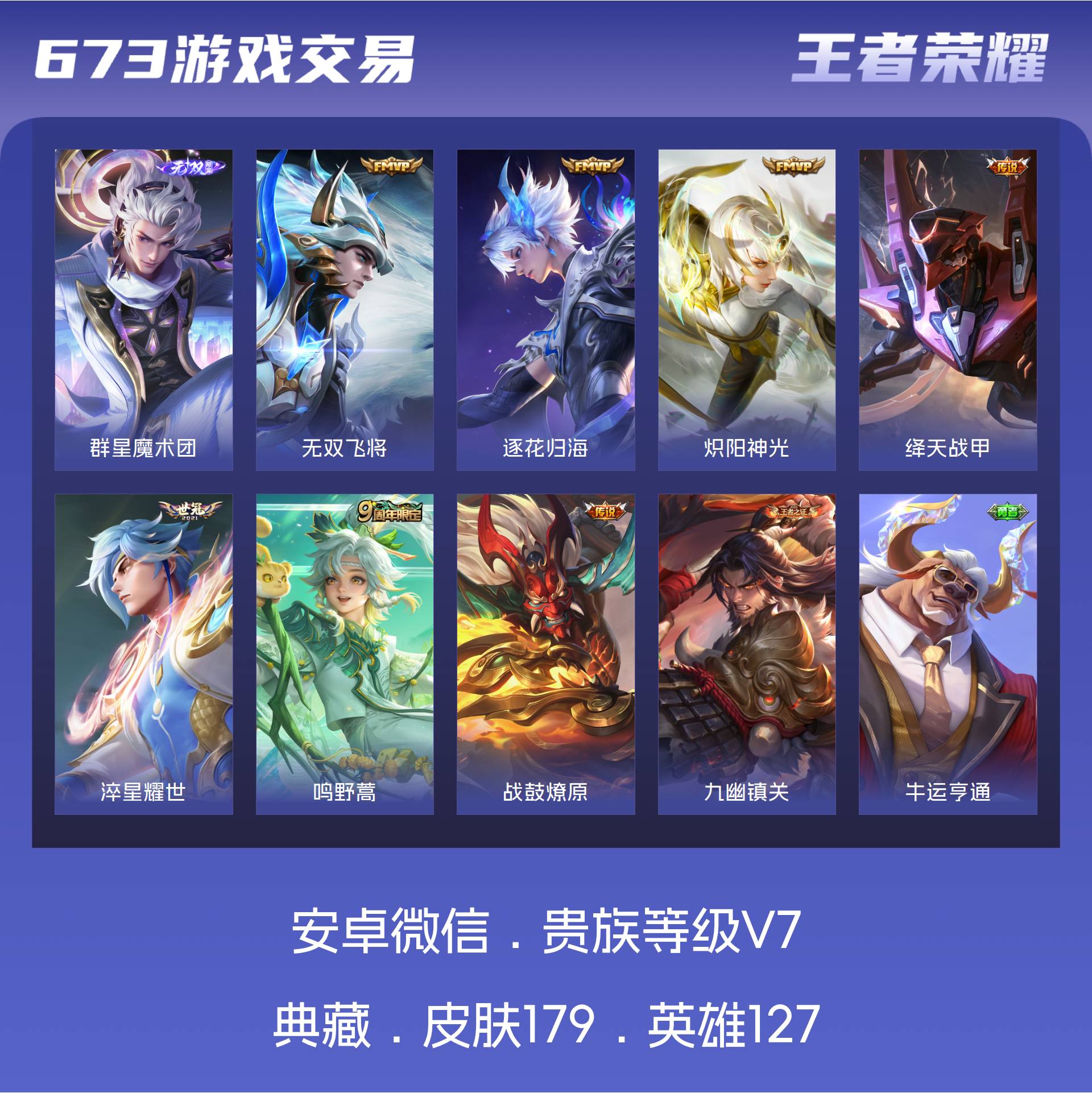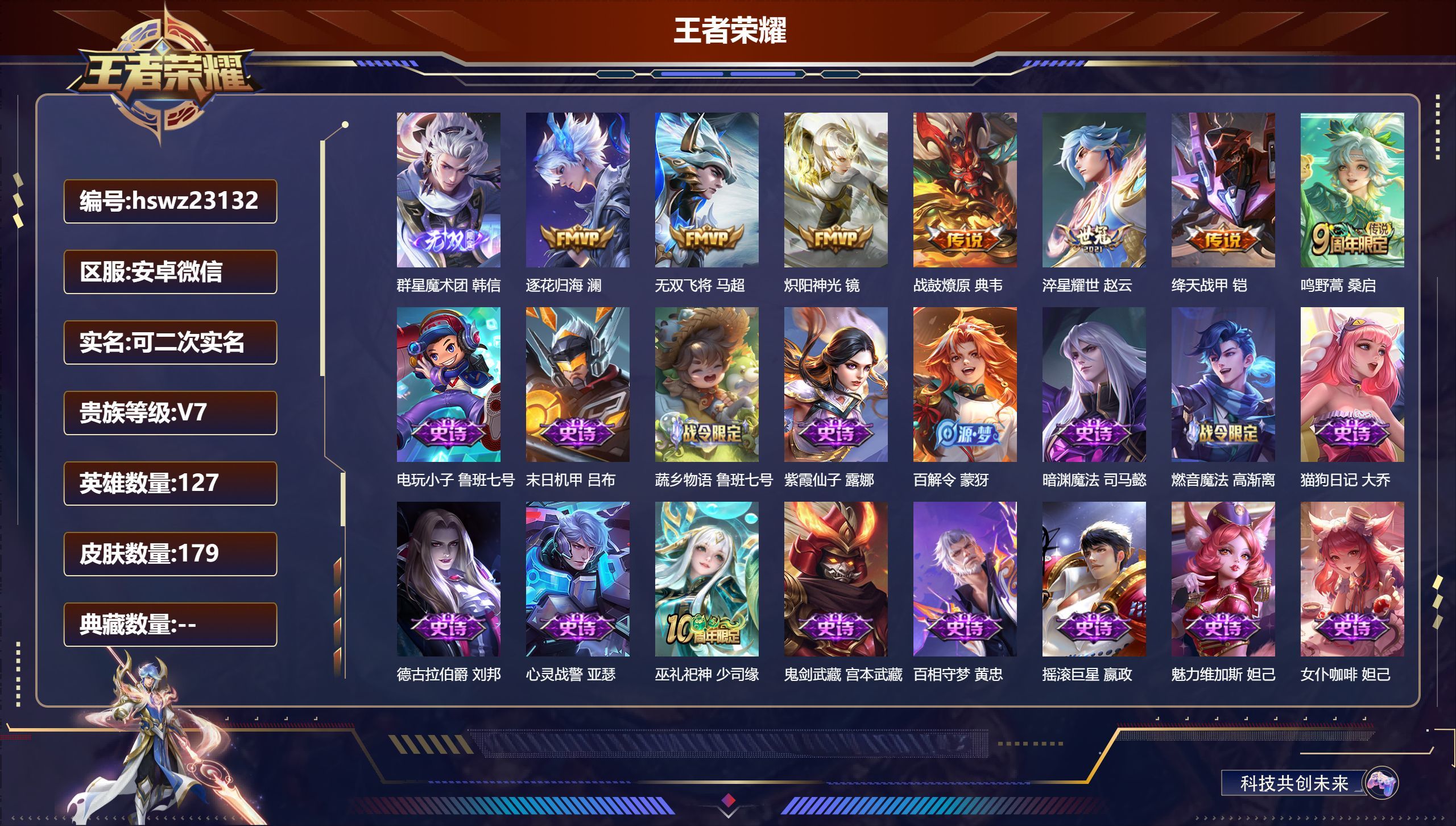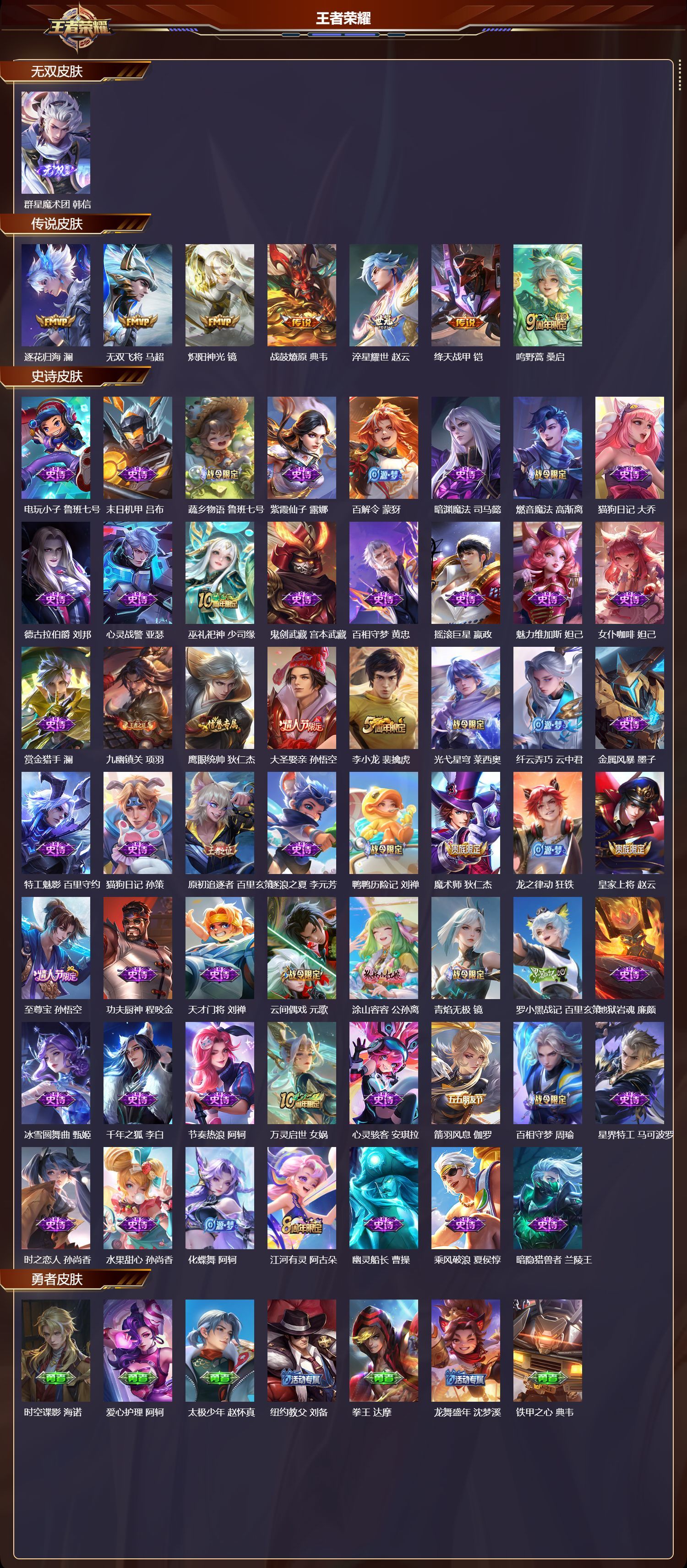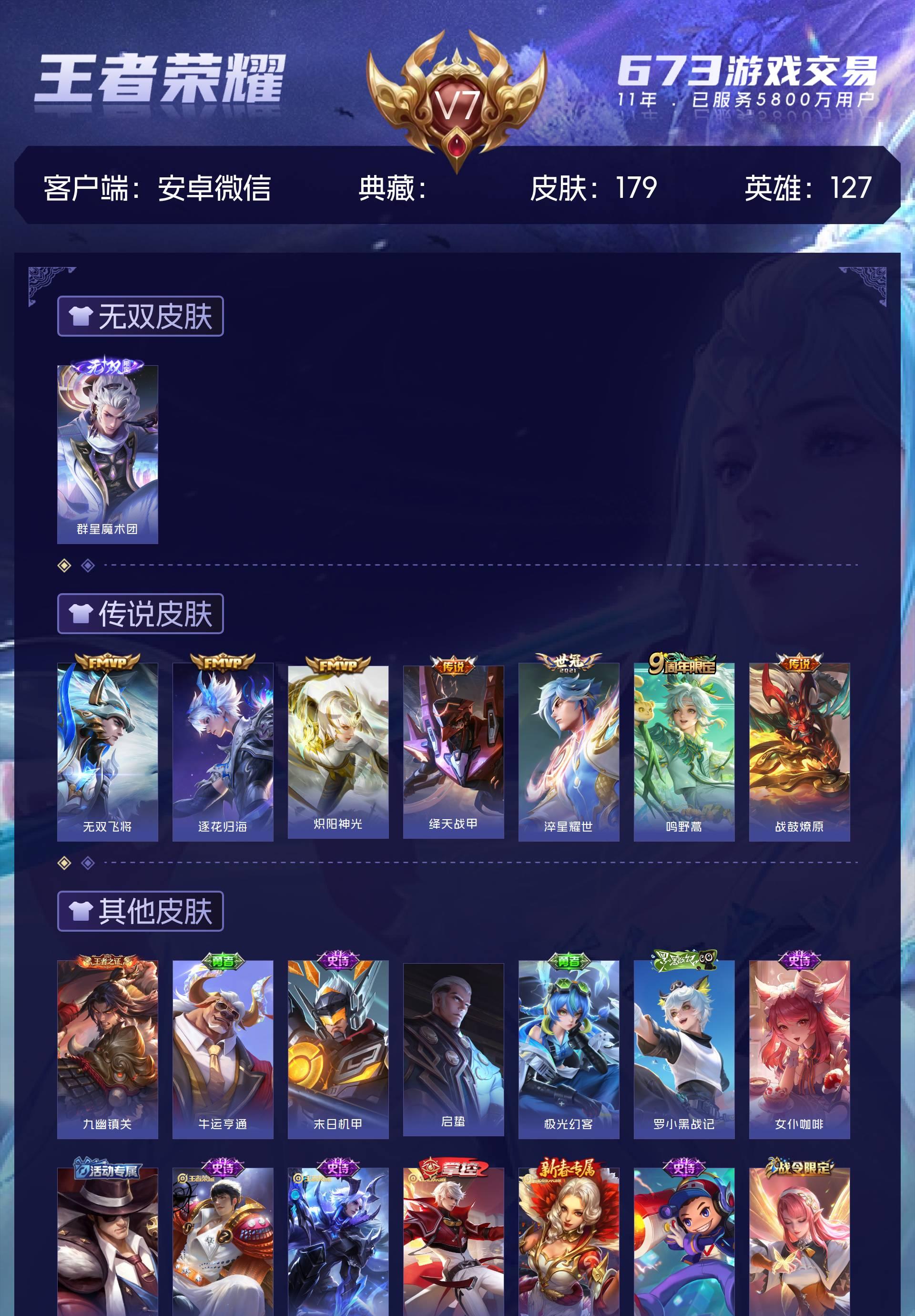 安卓微/永恒钻石/179皮肤/127英雄/0典藏/0珍品无双/1无双/0珍品传说/7传说/55史诗