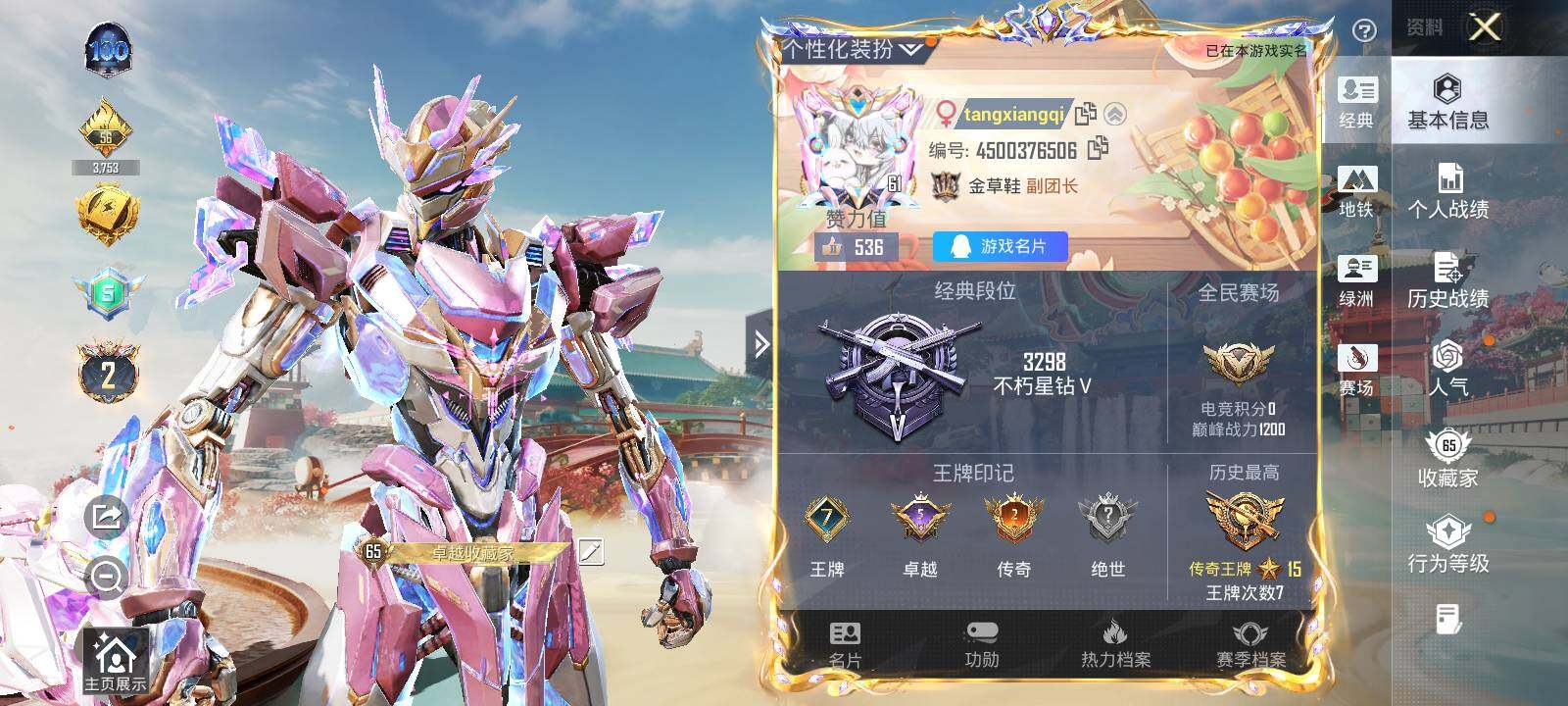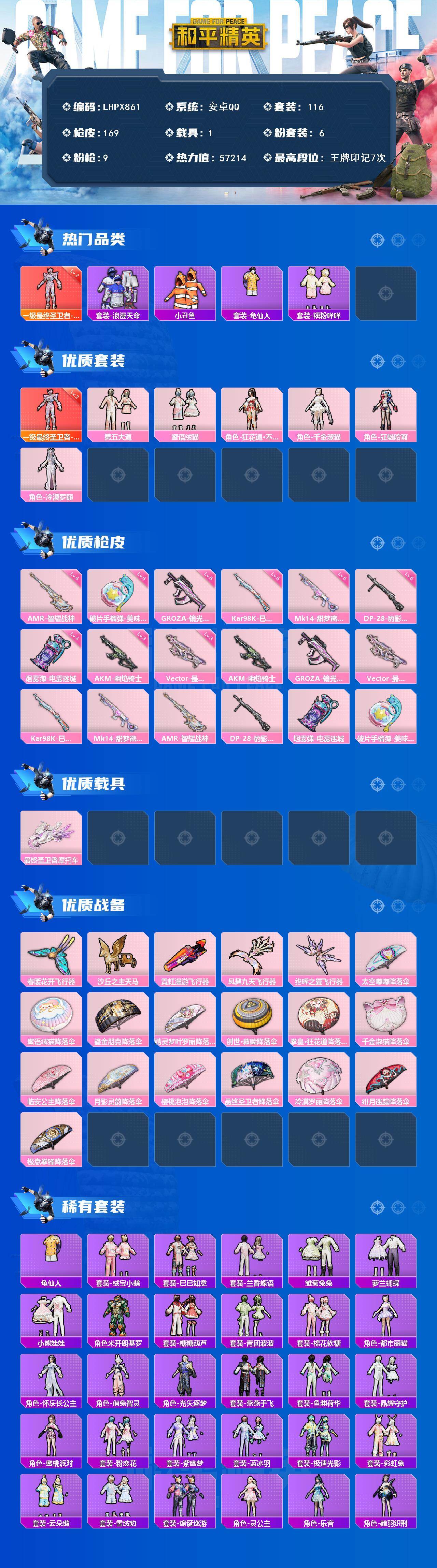 【特价出售/店主推荐】安卓 手Q-1神装-6粉装-9特效枪-1载具-6粉色飞行器-57214热力值-7王牌印记-116套装-169枪皮