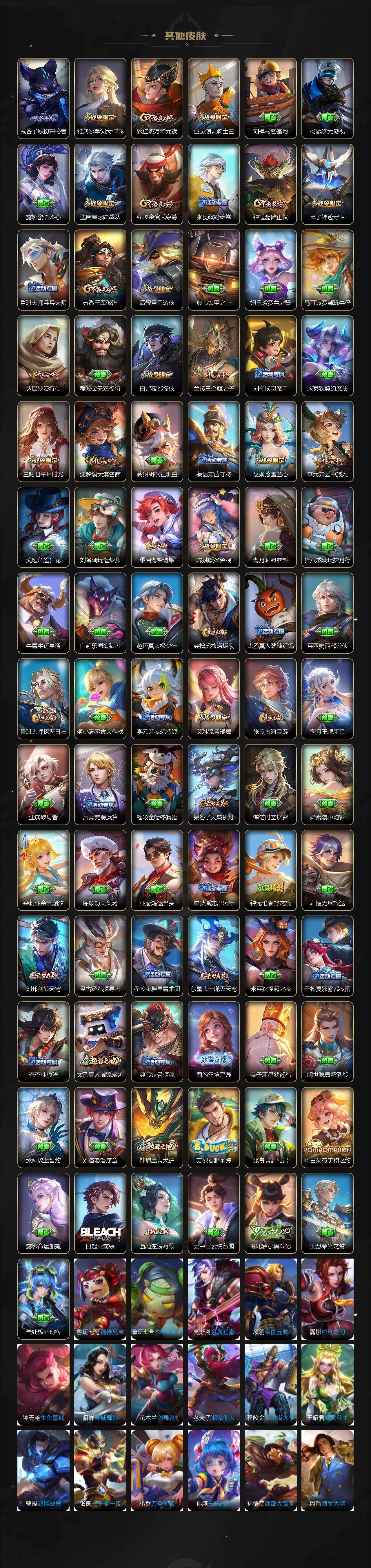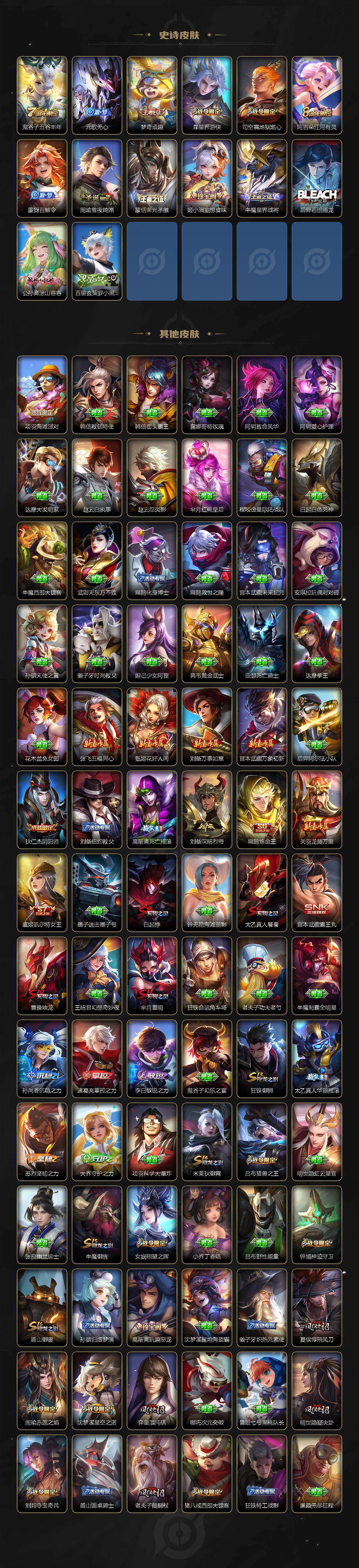 【传说皮肤】:桑启鸣野蒿,孙策乘龙淬吴钩,孙策末日机甲,曜李逍遥 ,铠绛天战甲,虞姬启明星使,曜云鹰飞将,李信一念神魔,刘备时之恋人,达摩黄金狮子座,花木兰冠军飞将,杨戬永曜之星,李白凤求凰,宫本武藏地狱之眼,狄