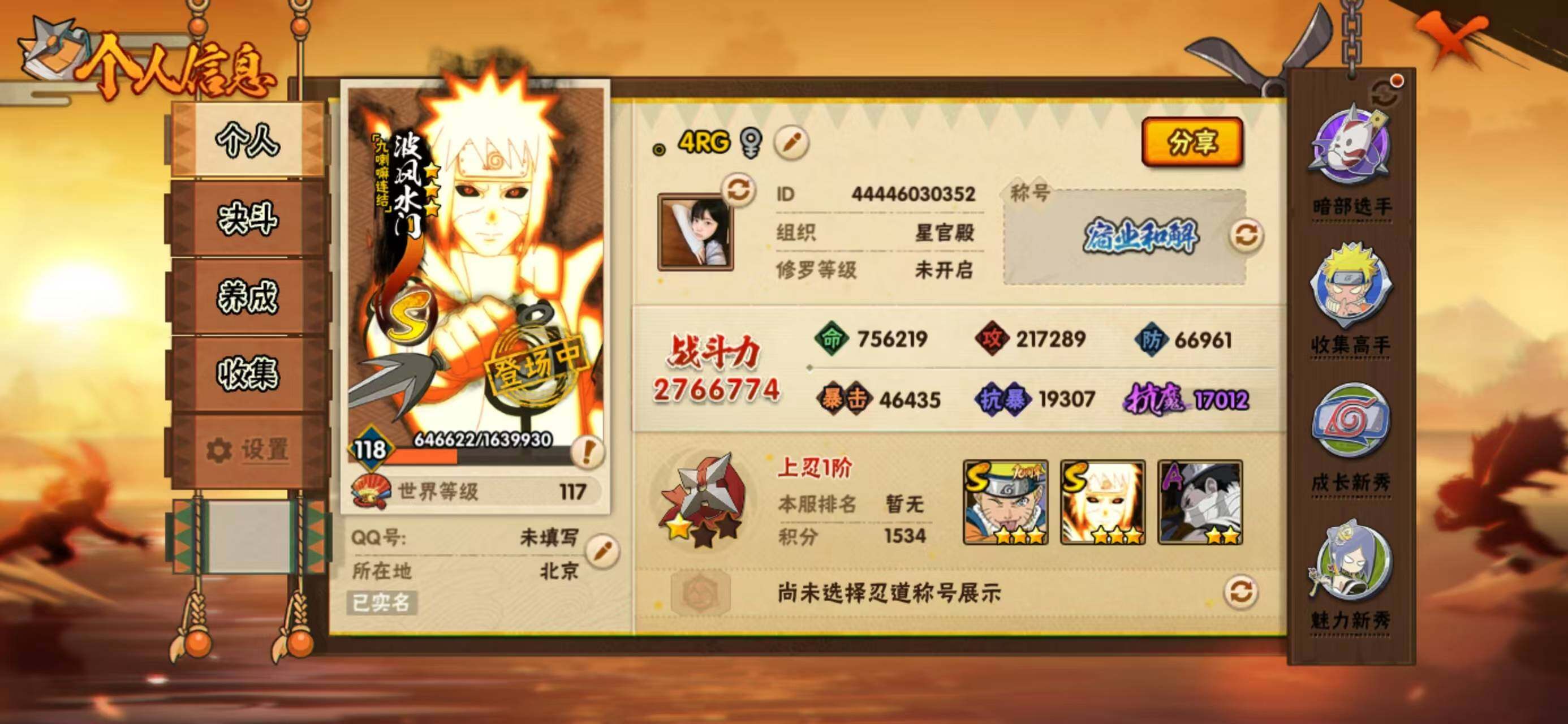 4S级忍者数-9A级忍者数【BL·276w战力4s忍9a忍v1小号·百战鼬·