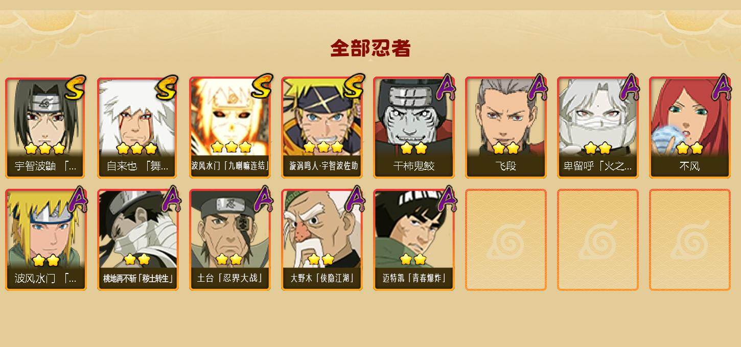 【A级忍者】:波风水门「青年」(2星),飞段(2星),干柿鬼鲛(2星),桃地再不斩「秽土转生」(2星),卑留呼「火之意志继承者」(