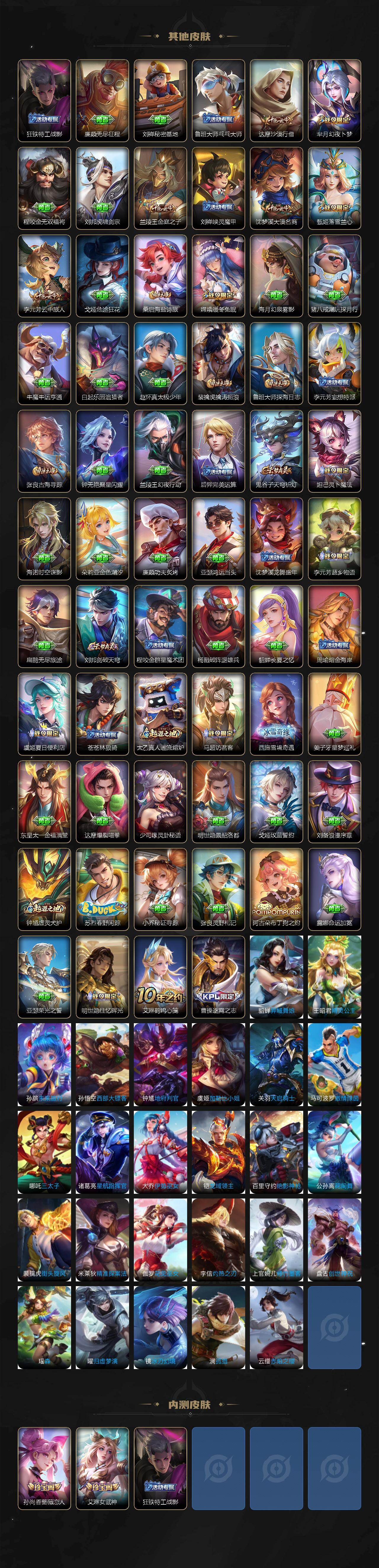 【传说皮肤】:后羿神树通天,妲己愿照众生和,澜愿照九州拓,云缨幻光神枪,干将莫邪画中仙,李白诗剑行,赵云淬星耀世,曜云鹰飞将,李信一念神魔,干将莫邪久胜战神,后羿黄金射手座,貂蝉仲夏夜之梦