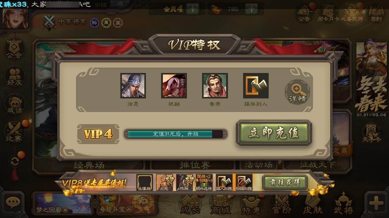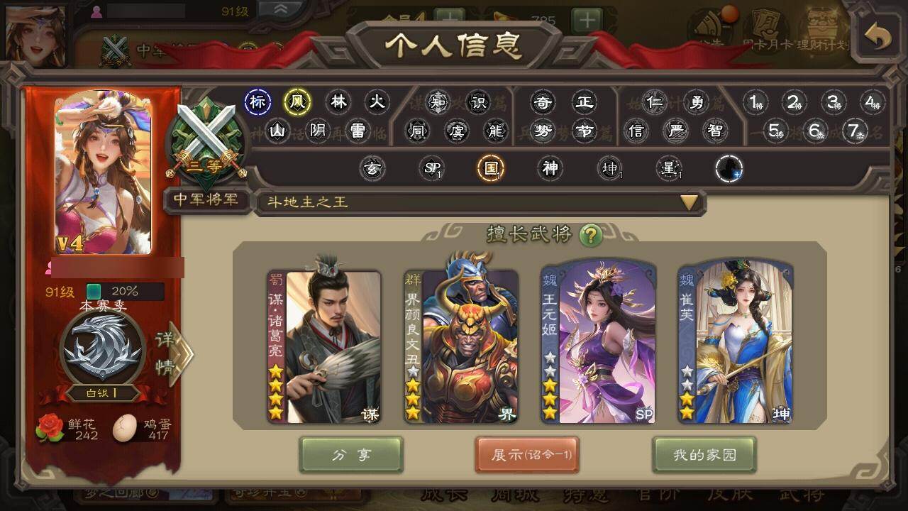 官阶:中军将军;VIP等级:VIP4;史诗武将数量:8;动态皮肤数量:3;武将