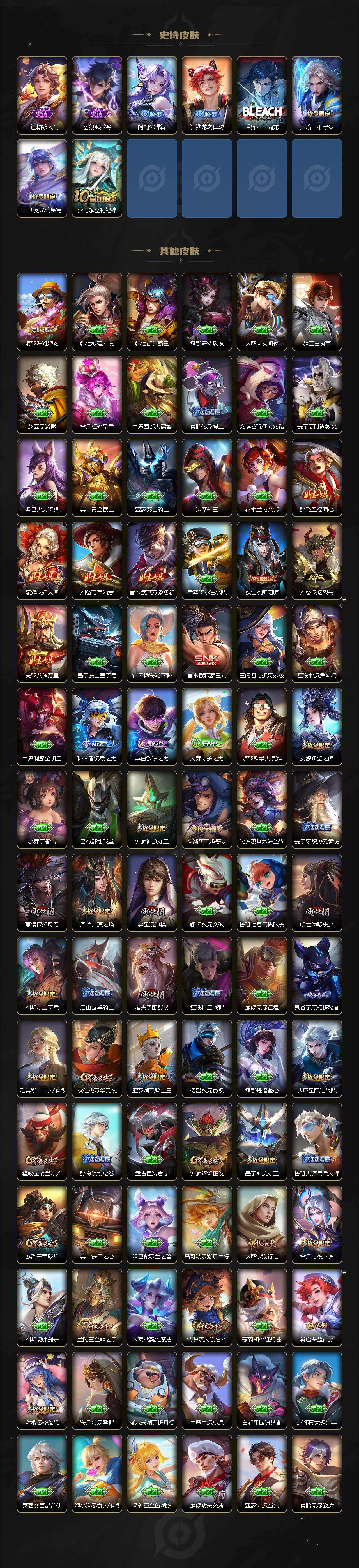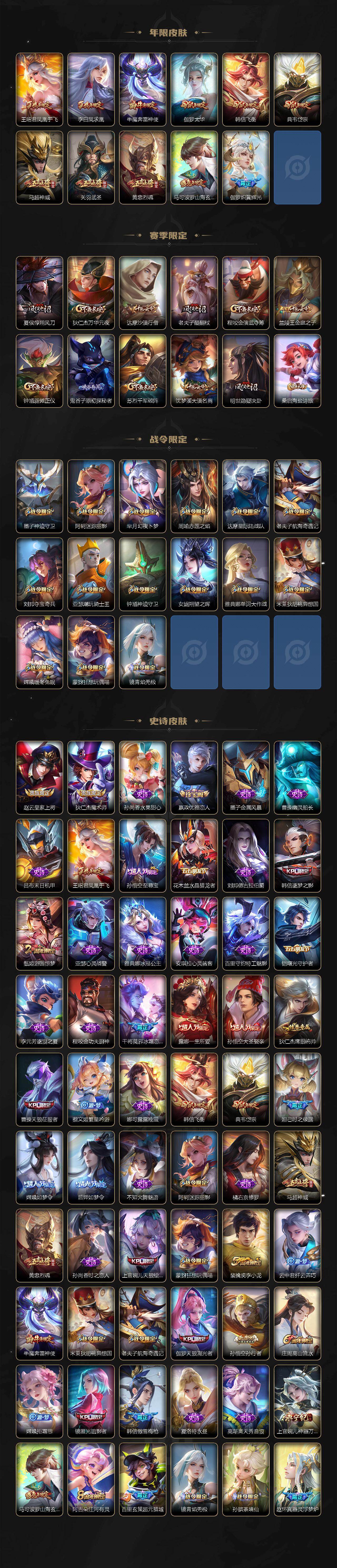 【传说皮肤】:后羿神树通天,司空震愿照山河定,澜愿照九州拓,云缨幻光神枪,裴擒虎祥瑞亨通,马超琥珀纪