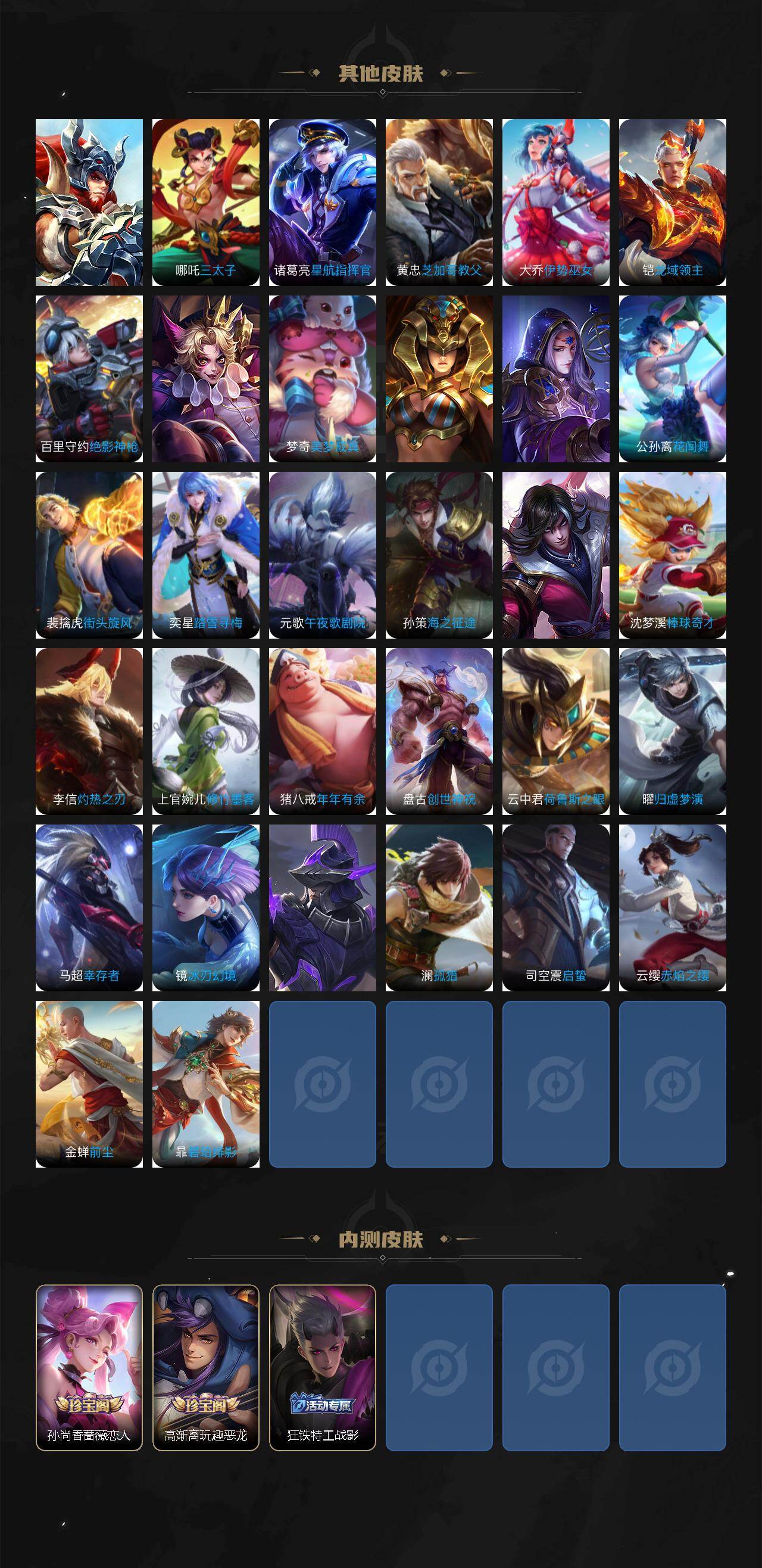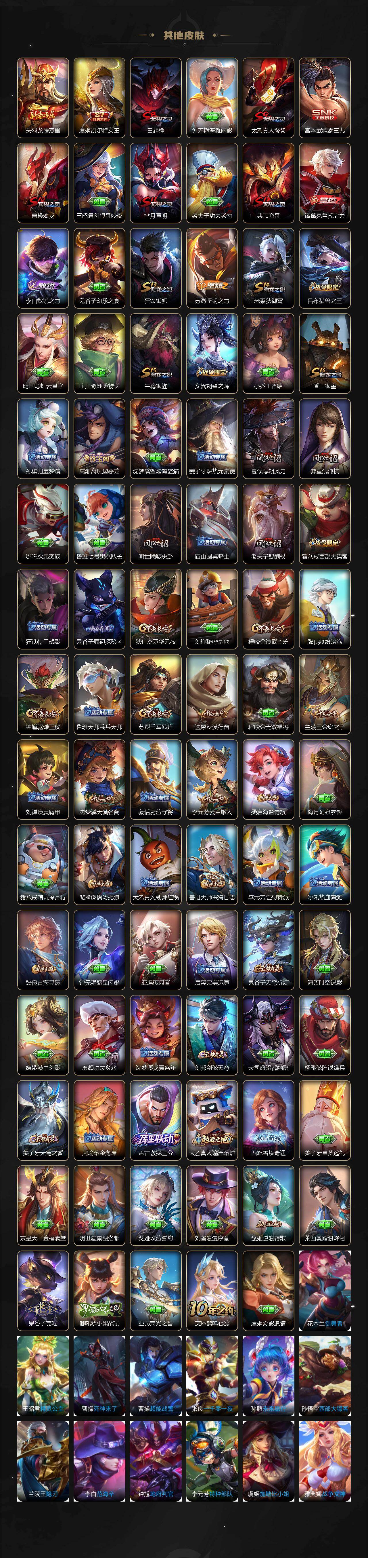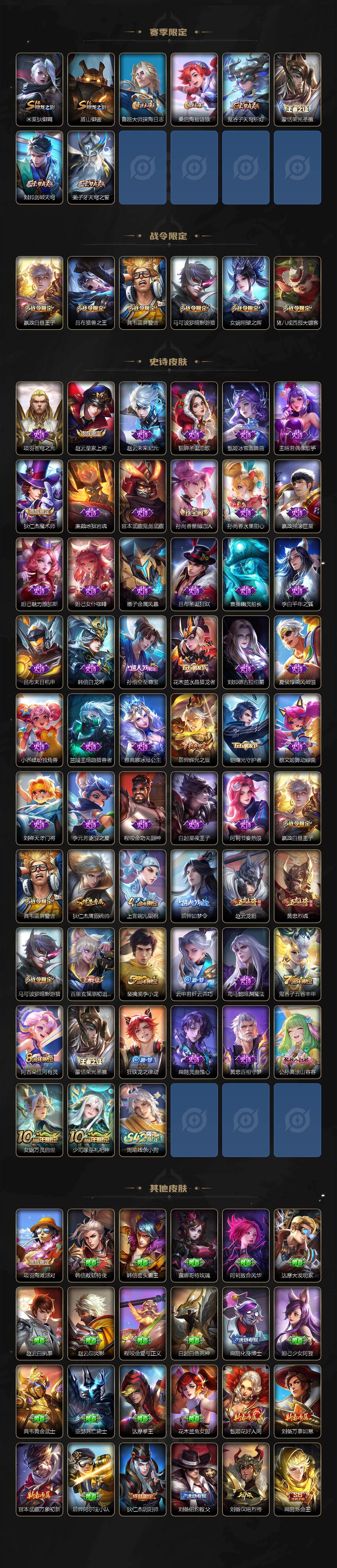 【限定皮肤】:白起狰,姜子牙天穹之誓,杨戬破阵退雄兵,狄仁杰阴阳师,虞姬凯尔特女王,赵云皇家上将,赵云龙胆,嬴政白昼王子,孙尚香蔷薇恋人,高渐离玩趣恶龙,扁鹊炼金王