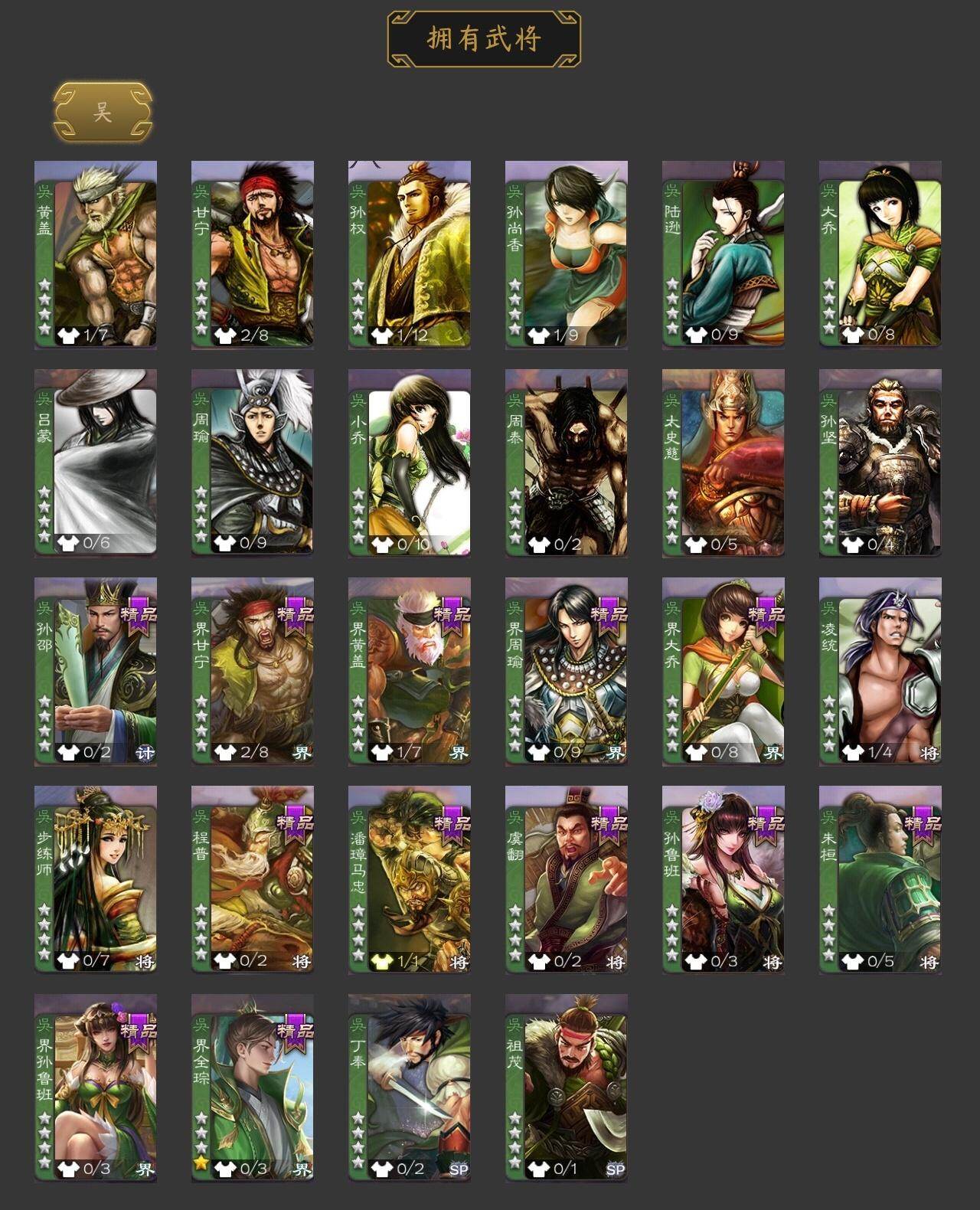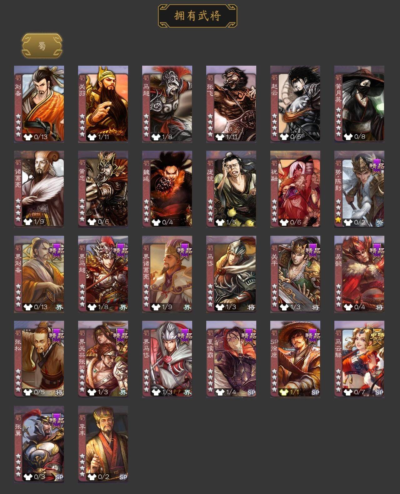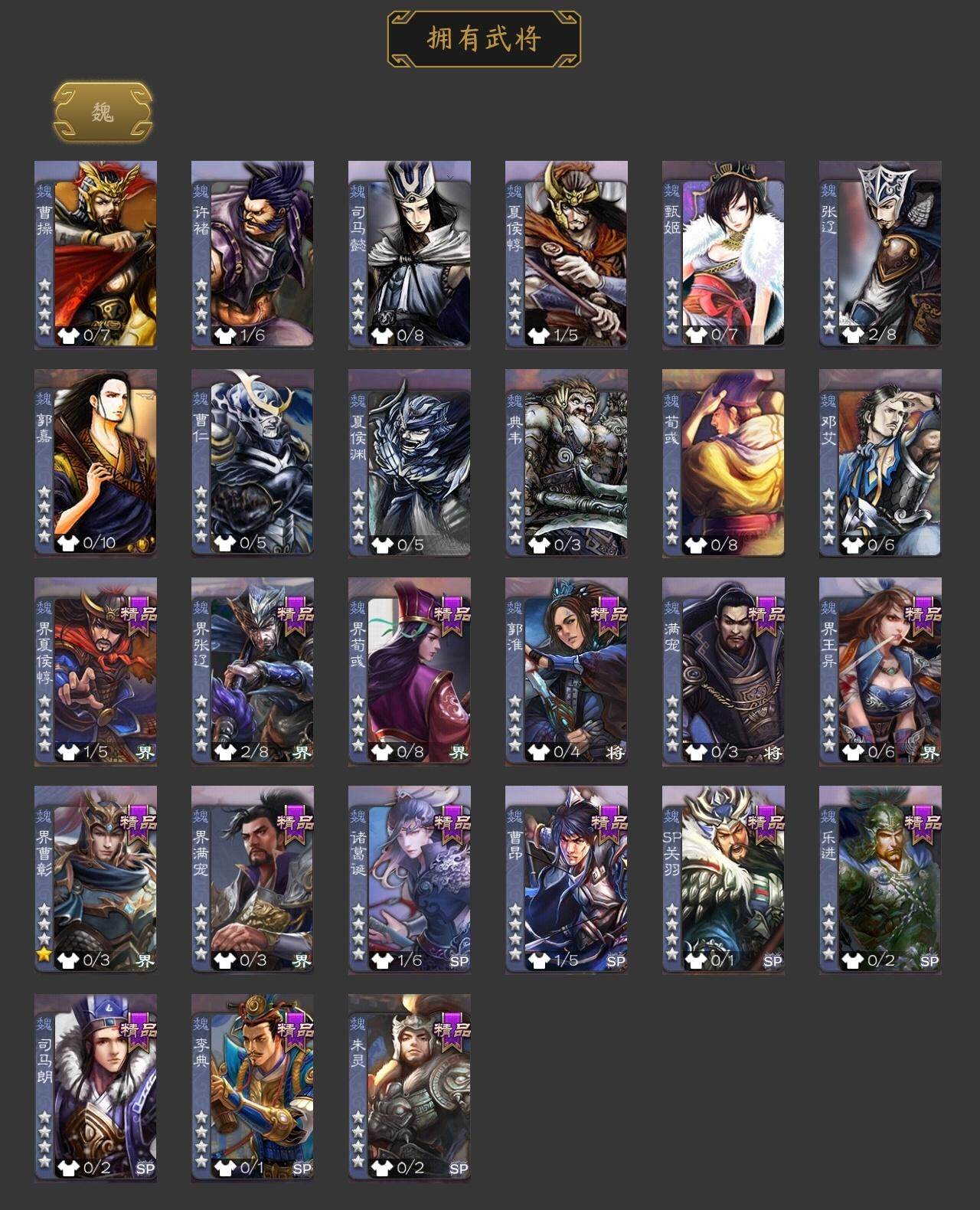 马云騄,友诸葛亮,SP关羽,乐进,曹昂,诸葛诞,朱灵,郭淮,满宠,界王异,界夏侯惇,界张辽,李典,司马朗,界荀彧,界曹彰,界满宠,势陈到,夏侯霸,界马岱,关平,界关兴张苞,界刘备,界马超,SP