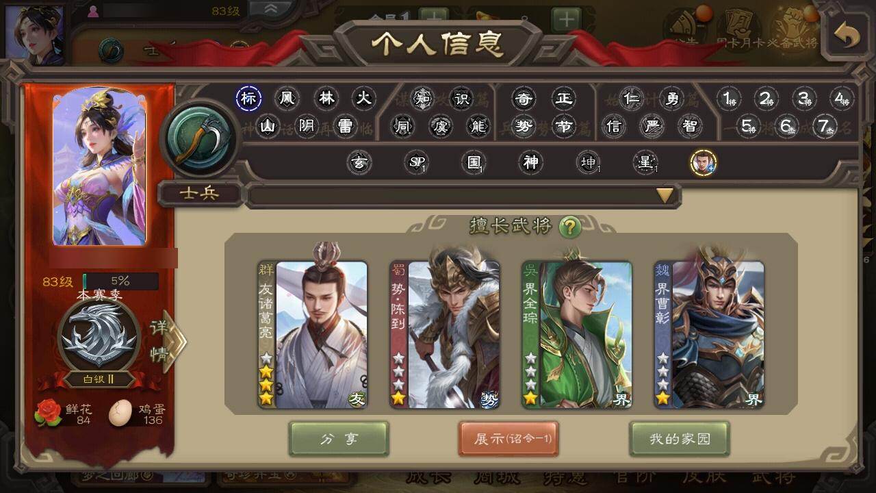 官阶:先锋将军;VIP等级:VIP1;史诗武将数量:2;动态皮肤数量:1;武将