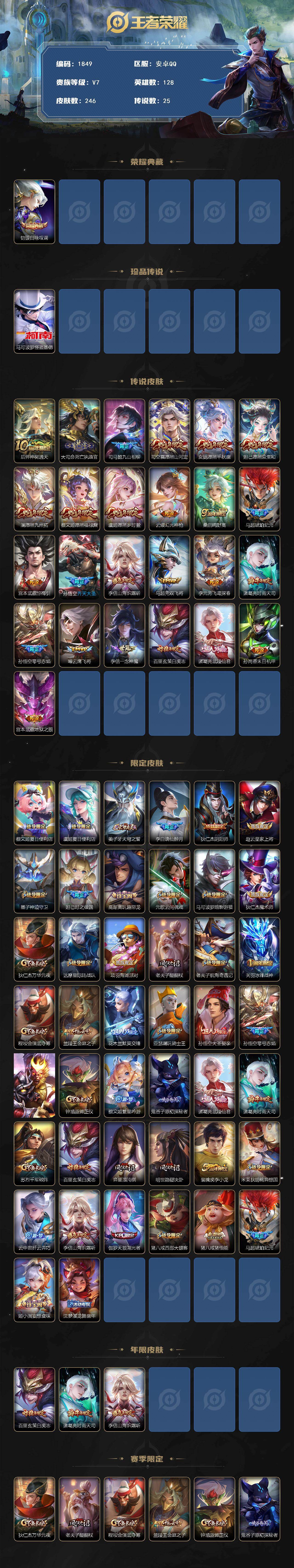 安卓Q-V7-至尊星耀III段位-128英雄-246皮肤-1典藏皮肤-1珍品传说-25传说-65史诗