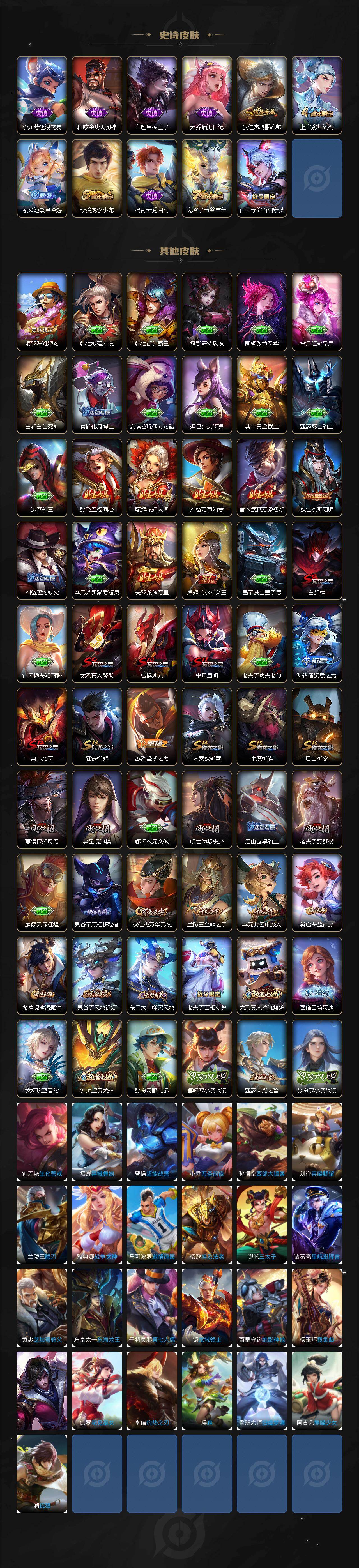 【限定皮肤】:白起狰,狄仁杰阴阳师,虞姬凯尔特女王,赵云皇家上将,赵云引擎之心,芈月重明,夏