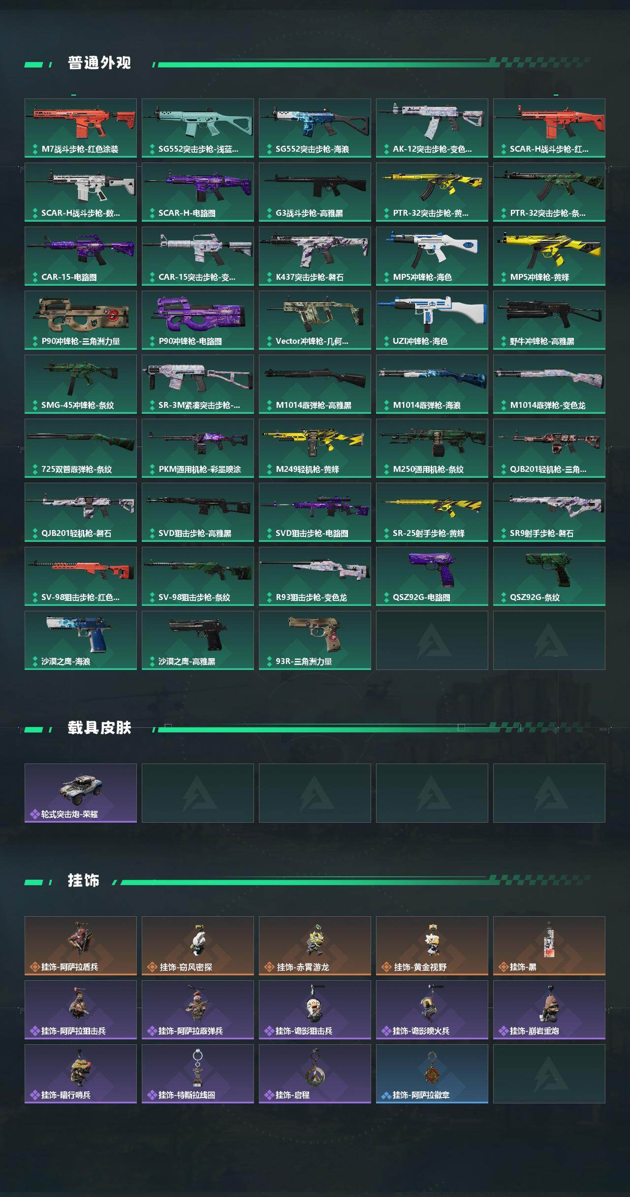 【传说外观】:M4A1突击步枪-蚀金玫瑰,M4A1突击步枪-阿米娅,ASh-12战斗步枪-鹅鸭杀,SG552突击步枪-运动员,AK-
