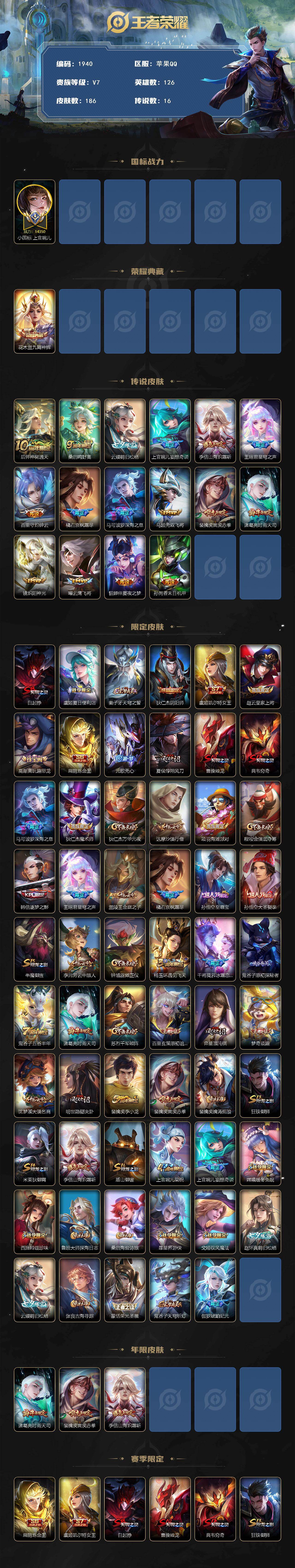 苹果Q-V7-最强王者段位-126英雄-186皮肤-1典藏皮肤-16传说-46史诗