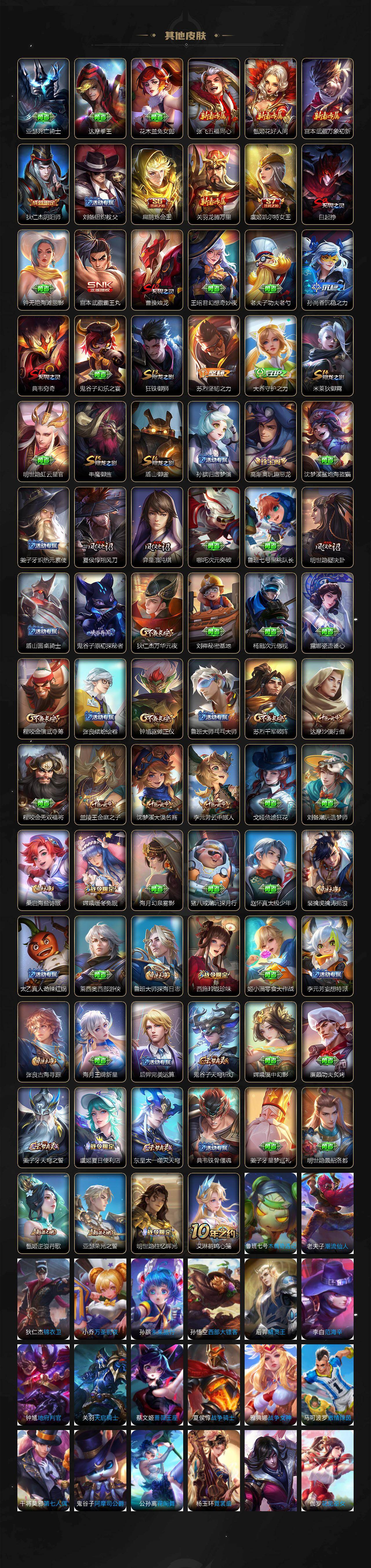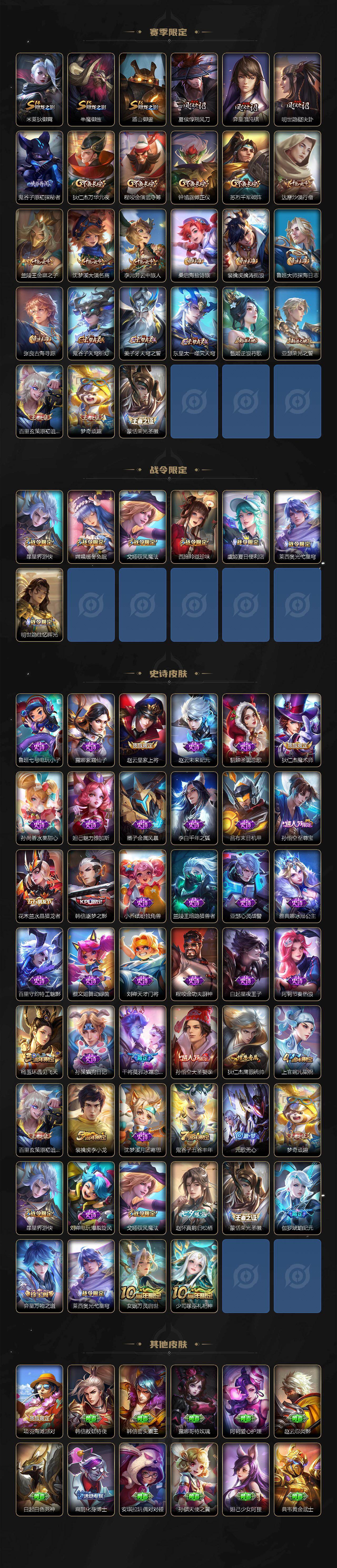 【传说皮肤】:后羿神树通天,桑启鸣野蒿,云缨鹤归松栖,上官婉儿妄想奇谈,李信山海炽霜斩,王昭君星穹之声,百里守约碎云,橘右京枫霜尽,马可波罗深海之息,马超无双飞将,裴擒虎寅虎赤拳,诸葛亮时雨天司,镜炽阳神光,曜云鹰飞将,貂蝉仲夏夜之梦,孙尚香末日机甲