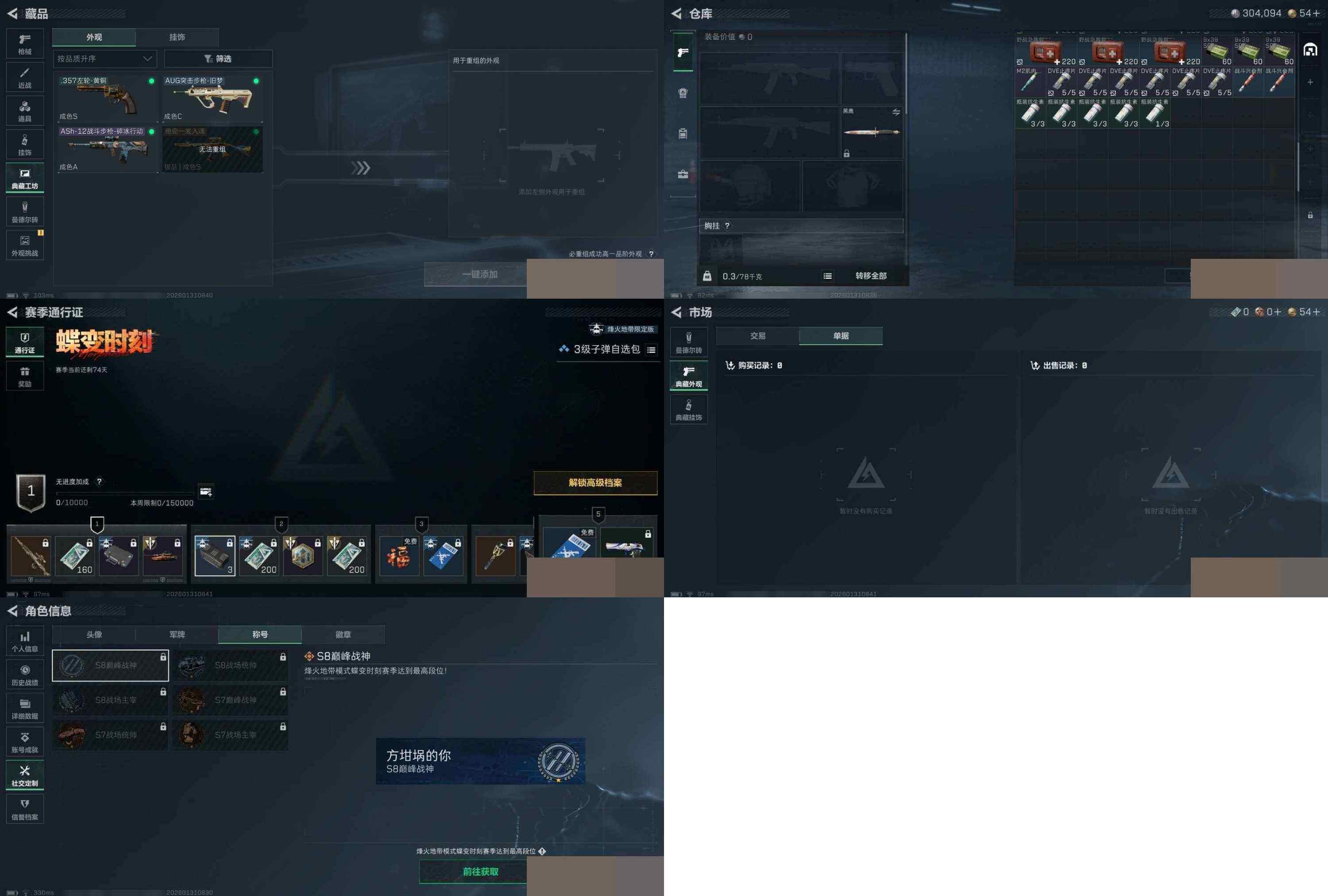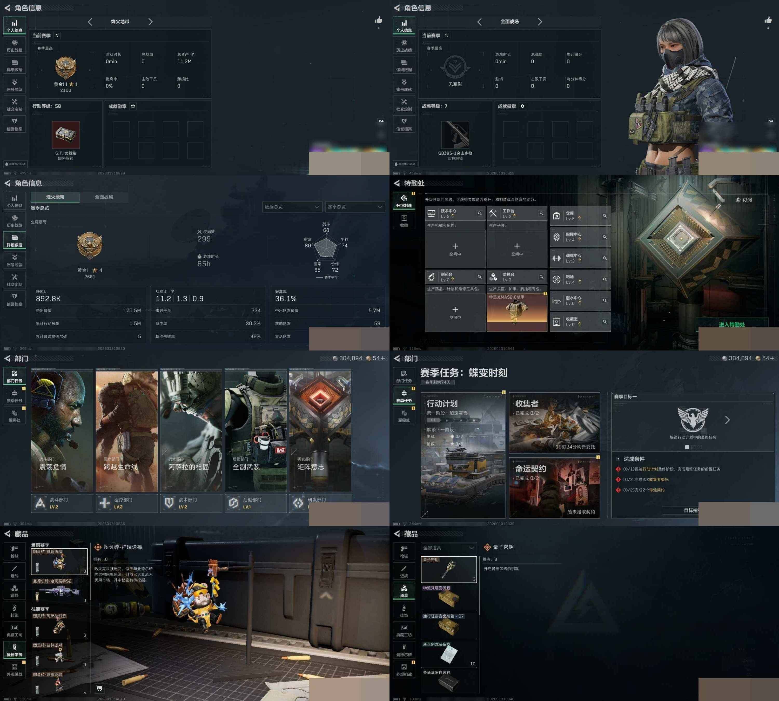 总资产11m 巨浪极品s 烽火地带段位: 黄金 全面战场段位: 列兵 总资产: 11000000 哈夫币: 304000