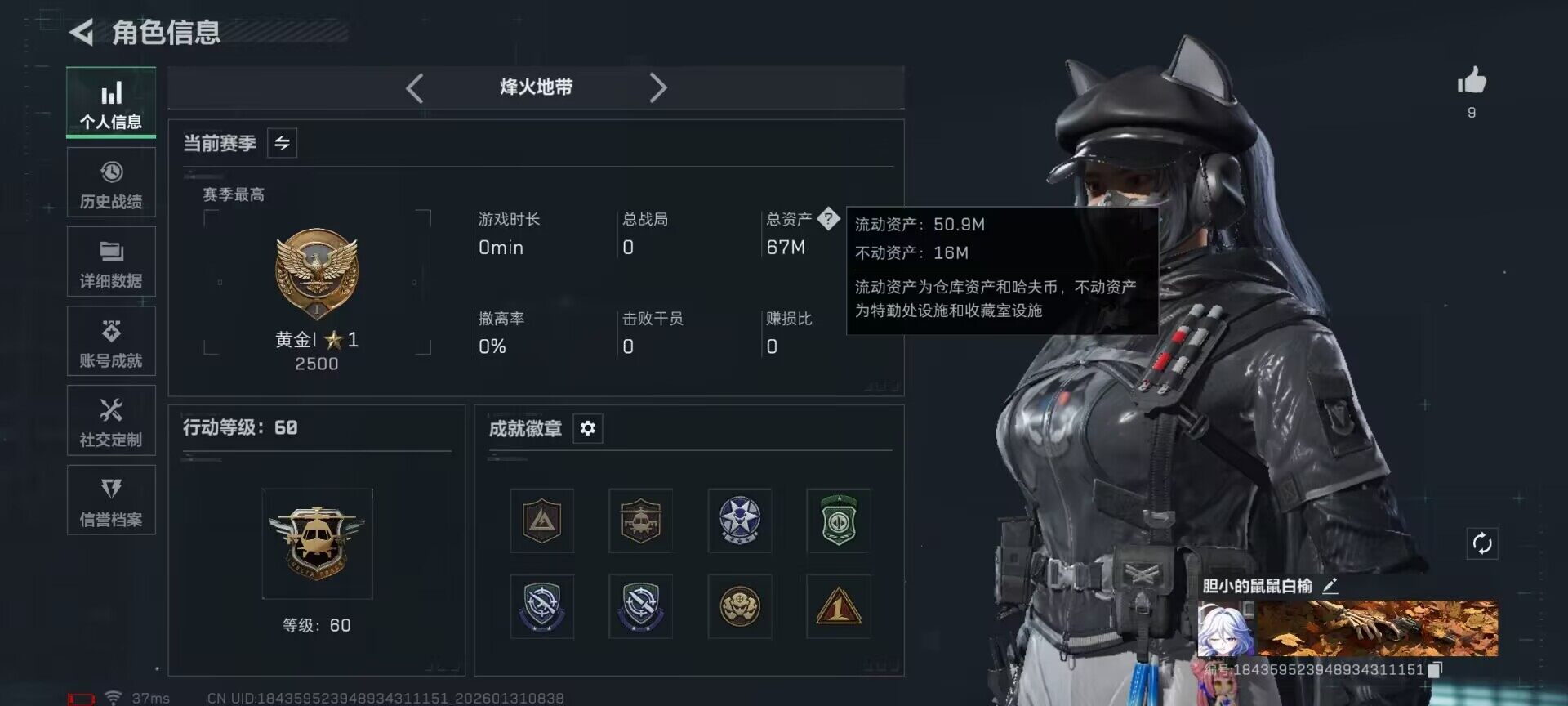 总资产(M):66M/哈夫币(K):7998K/传说枪皮数:14/全面战场等级:36_段位:上等兵/烽火地带等级:60_段位:黄金