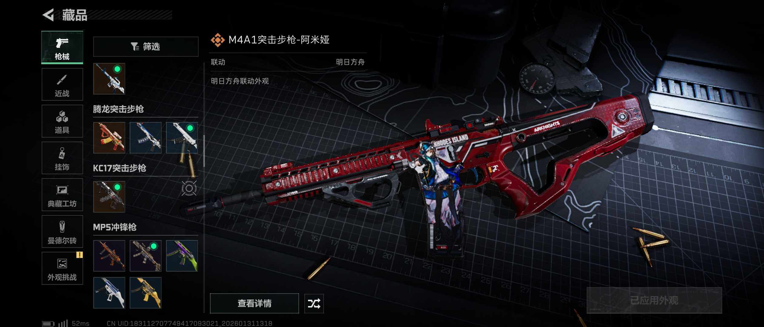 【传说外观】:M4A1突击步枪-阿米娅,ASh-12战斗步枪-鹅鸭杀,AK-12突击步枪-特斯拉线圈,SCAR-H战斗步枪-启航,G3战斗步枪-骑士,CAR-15突击步枪-阿米娅,腾龙突击步枪-捞点薯条,KC17突击步枪-电锯惊魂,UZI