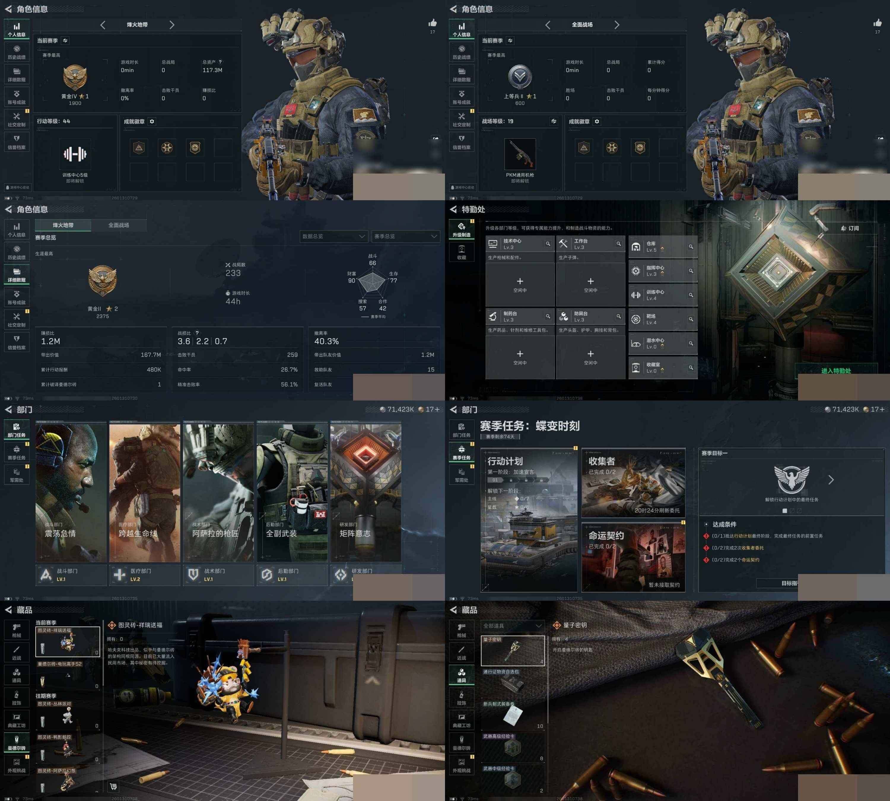 总资产117m+现金七千万+awm子弹12发+体力负重双4 精品纯绿无处罚护航号 烽火地带段位: 黄金 全面战场段位: 上等兵 总资产: 117000000 哈夫币: 71423000