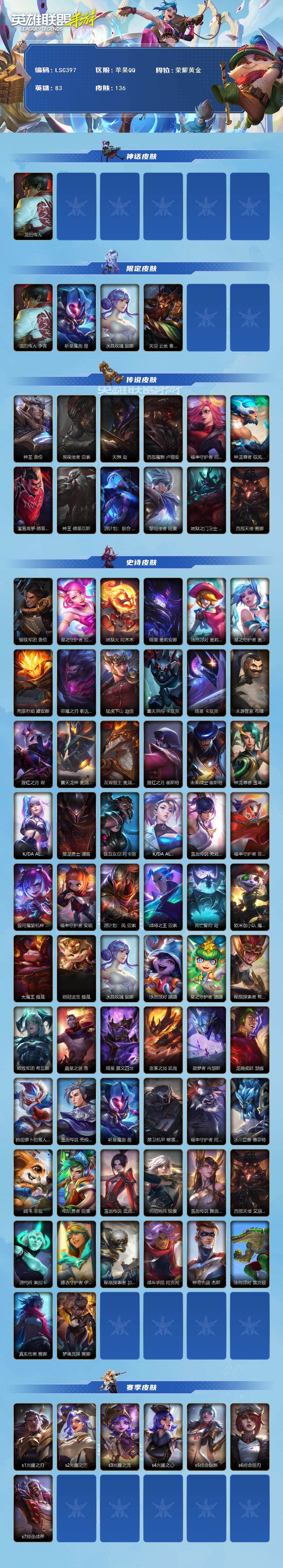 【LSC397】83英雄/136皮肤/1神话/12传说/62史诗/荣耀黄金/龙的传人 李青/斩星魔剑 易/水晶玫瑰 娑娜/关羽 云长 泰达米尔/神王 盖伦/黑夜使者 亚索/天煞 劫/西部魔影 卢锡安/福牛守护者 厄运小姐/神龙尊者 驭风啸龙 易/灌篮高手 德莱厄斯/神王 德莱厄斯/源计划:联合 艾希/黎明使者 锐雯/地狱之门卫士 加里奥/西部天使 赛娜/钢铁军团 盖伦/星之守护者 拉克丝/地狱火 阿木木/暗星 奥莉安娜/泳池派对 奥莉安娜/星之守护者 奥莉安娜/无限烈焰 黛安娜/恶魔之刃 泰达米