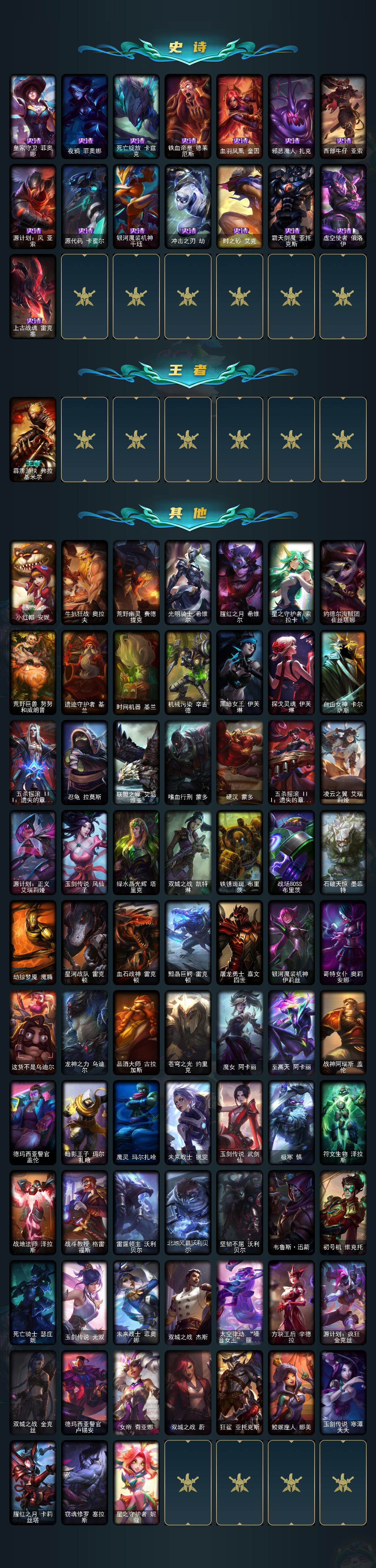 172英雄/151皮肤/10神话/13限定/2臻彩/38炫彩/11传说/43史诗/