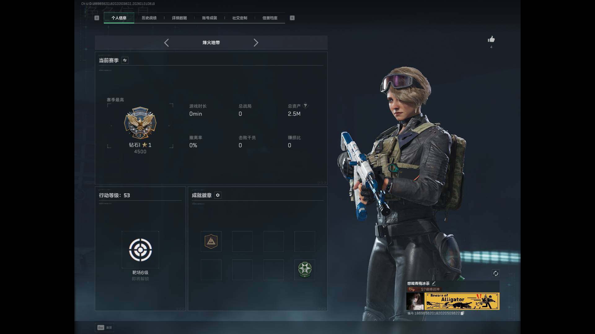 总资产(M):2M/哈夫币(K):118K/全面战场等级:23_段位:上等兵/烽火地带等级:53_段位:钻石/