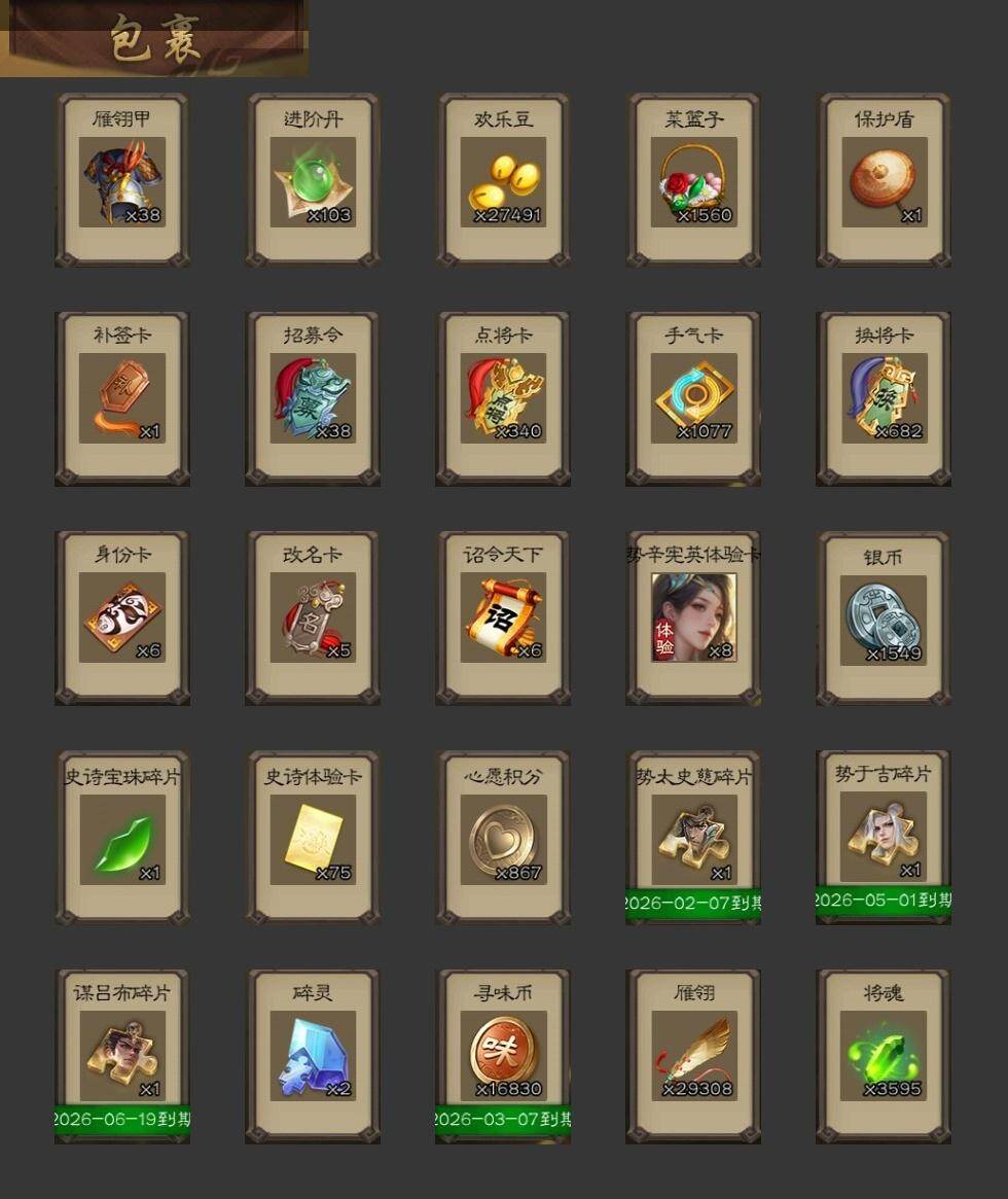 官阶:先锋将军;VIP等级:VIP1;史诗武将数量:2;动态皮肤数量:0;武将总数:67;史诗宝珠数量:0;将魂数量:3595;神将:1;魏国史诗武将:0;蜀国史诗武将:1;吴国史诗武将:0;群史诗武将:0
