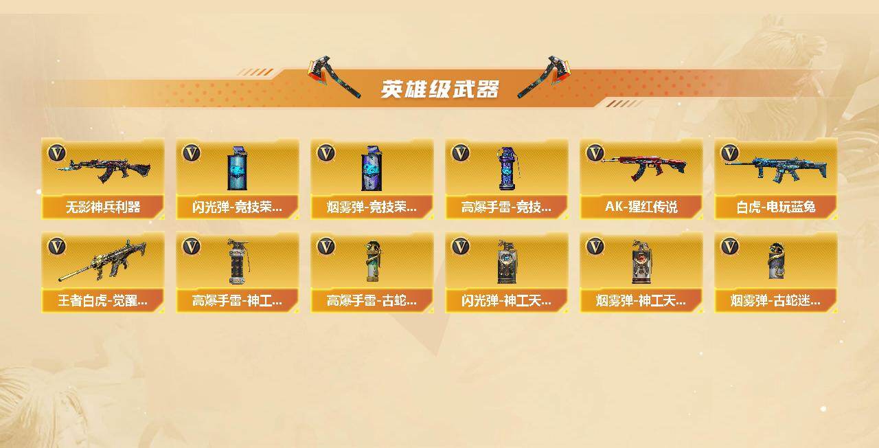 【热门武器】:传说圣灵,QBZ03-金色蔷薇,M200-幻神,金色蔷薇-古蛇迷踪,修罗-古蛇迷踪,白虎-电玩蓝兔,M4A1-黑骑士,羊驼玩偶,沙鹰-修罗*2