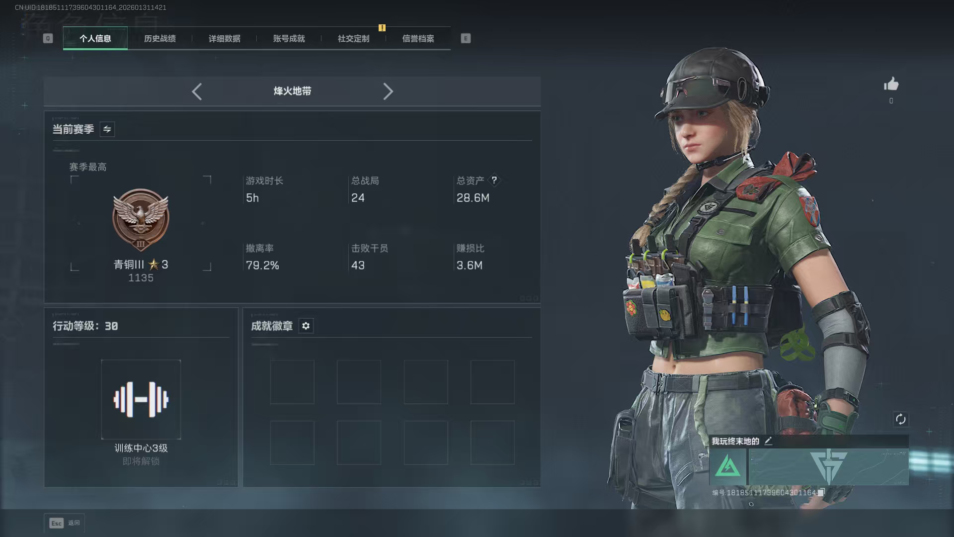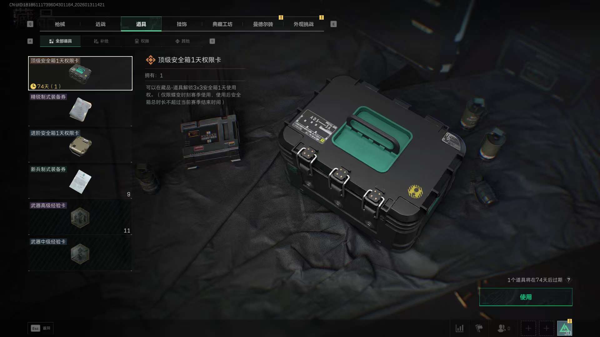 三角洲30级端游账号2400w哈弗币+蝶乌鲁鲁+20AWM+两金甲修+两红甲修+3*3体验卡一天。