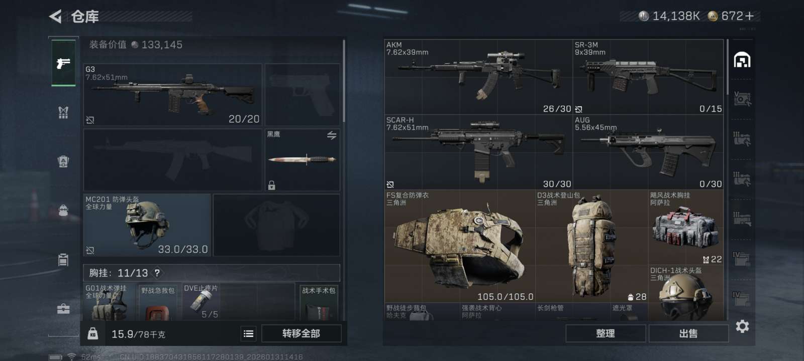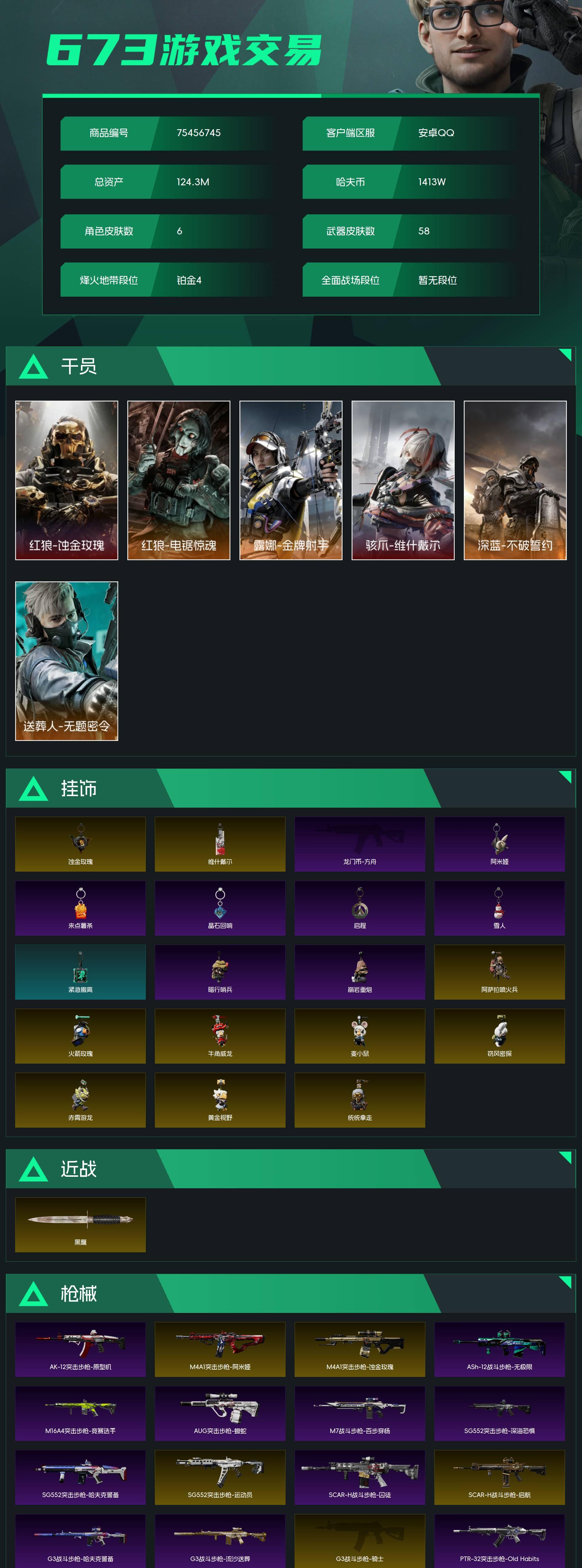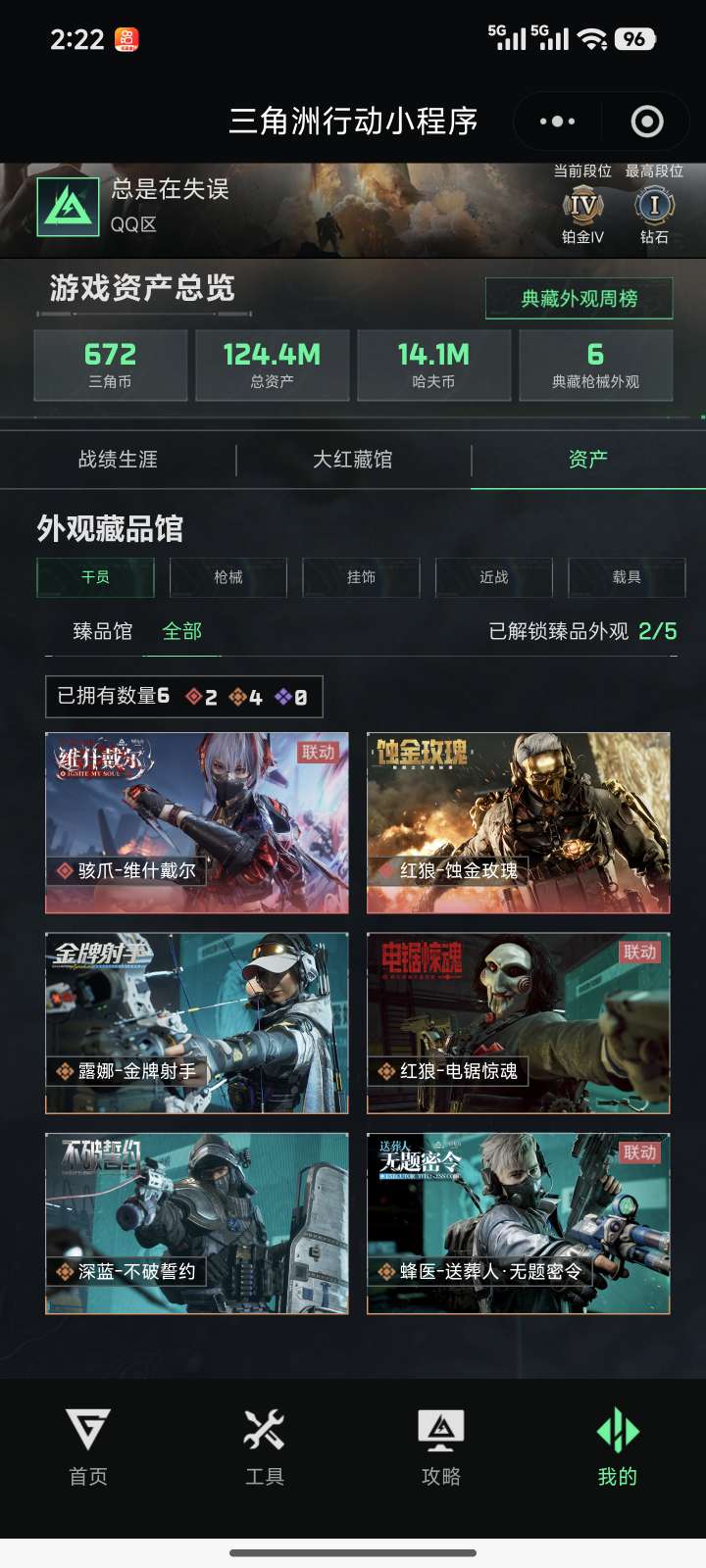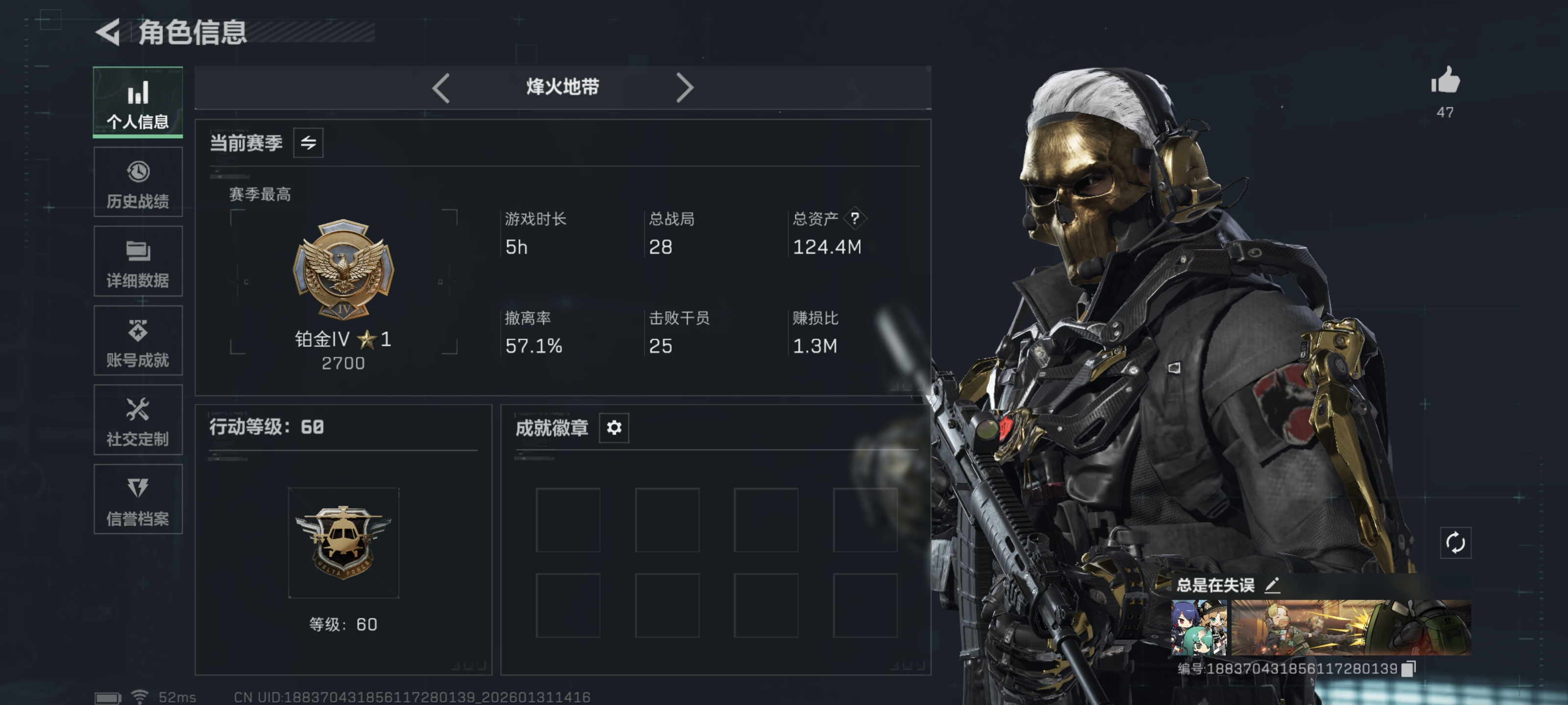 烽火段位铂金4 战场段位暂无段位 总资产124.3M 哈夫币1413W 干员6 挂饰19 近战1 枪械58 载具36