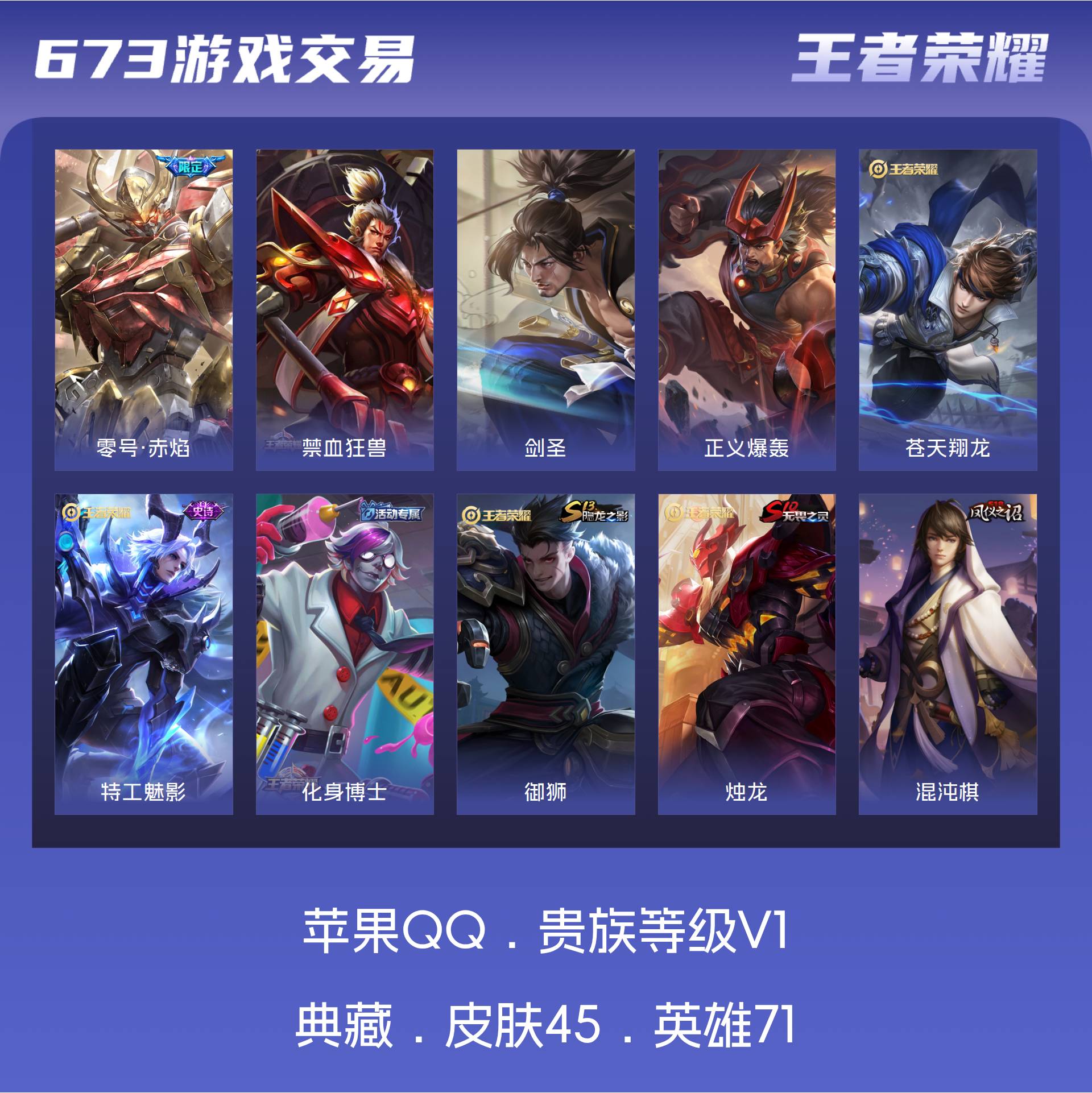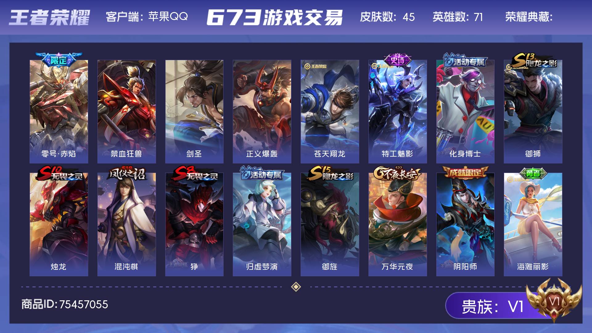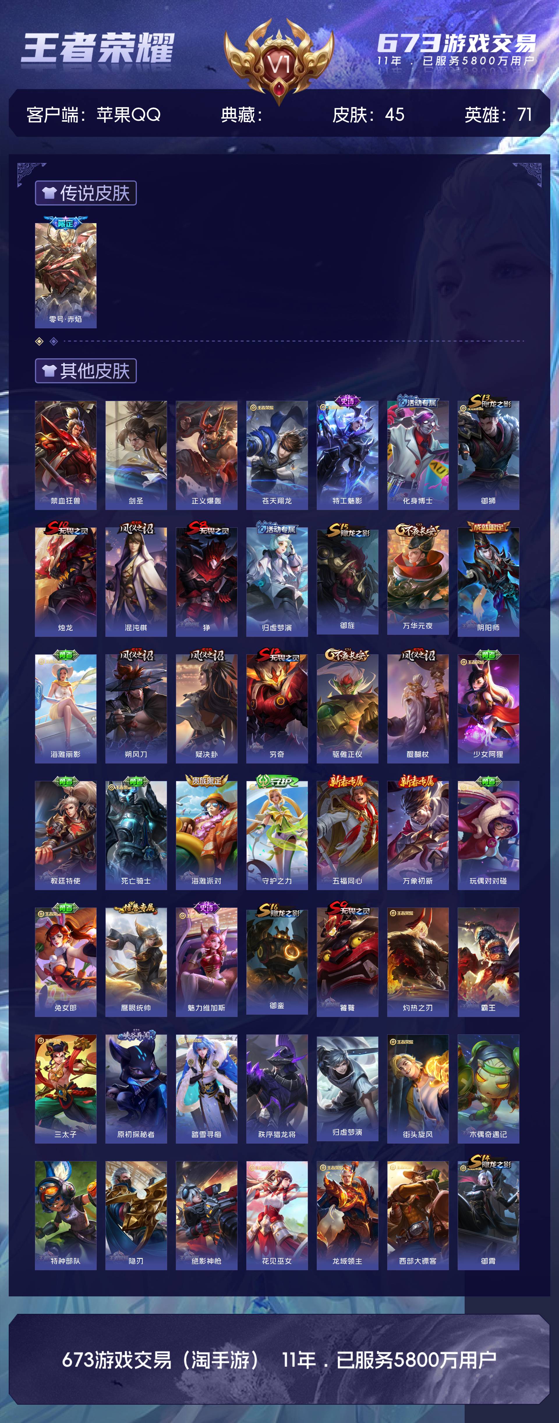 V1 皮肤45 英雄71 荣耀黄金 传说1 其他皮肤49