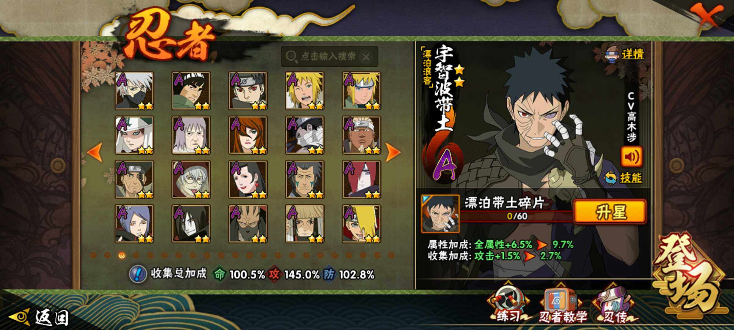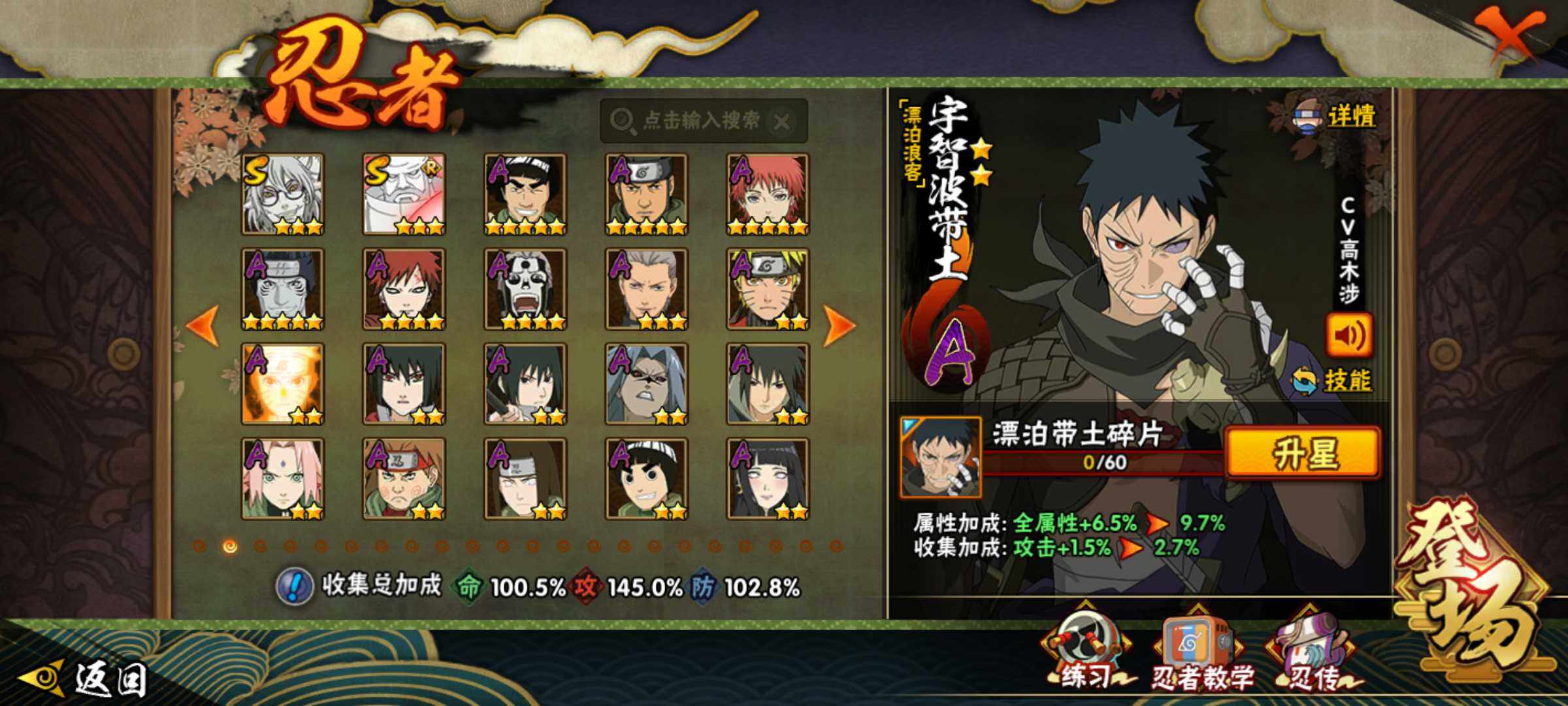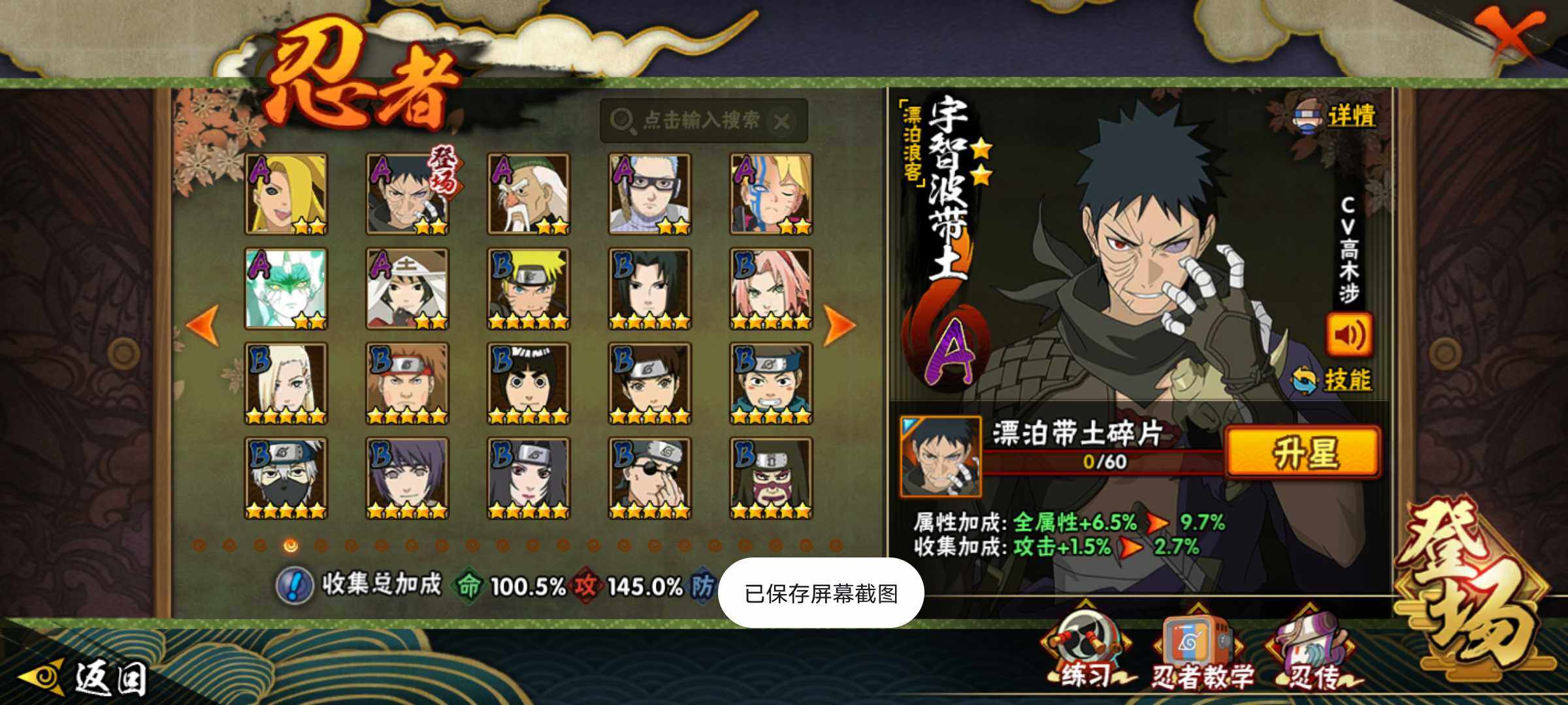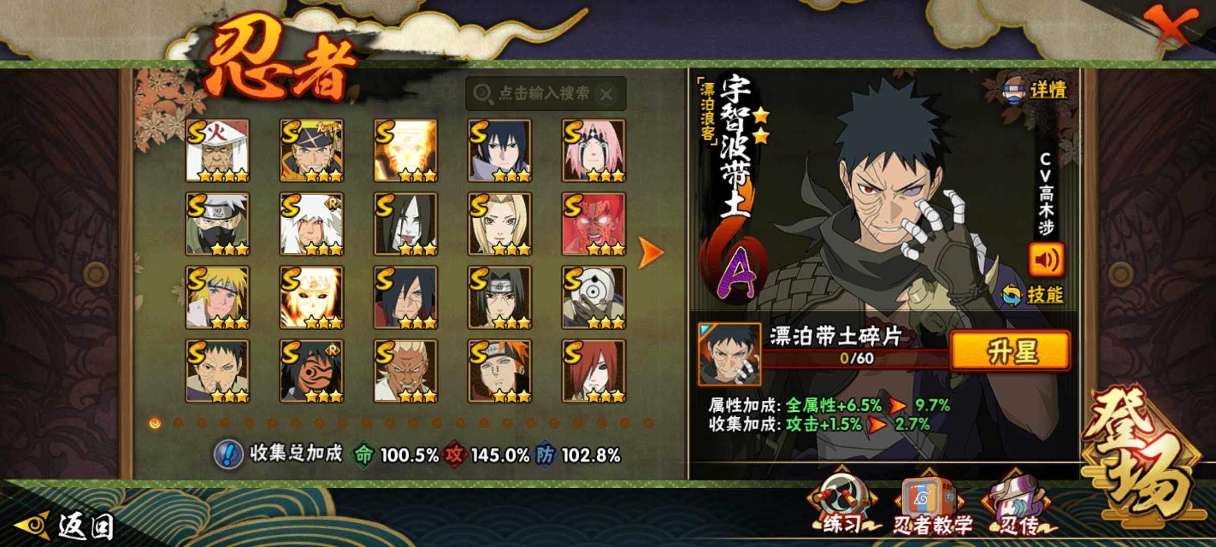 【S级忍者】:长门「秽土转生」(3星),宇智波斑「秽土转生·解」(3星),春野樱「忍界大战」(3星),宇智波带土「忍界大战」(3星),艾「忍界大战」(3星),宇智波鼬「须佐能乎」(3星),旗木卡卡西「须佐能乎」(3星),自来也「舞之豪杰」(3星),大蛇丸(3星),纲手(3星),猿飞日斩(4星),波风水门(3星),药师兜「仙人模式」(3星),神秘面具男「红夜