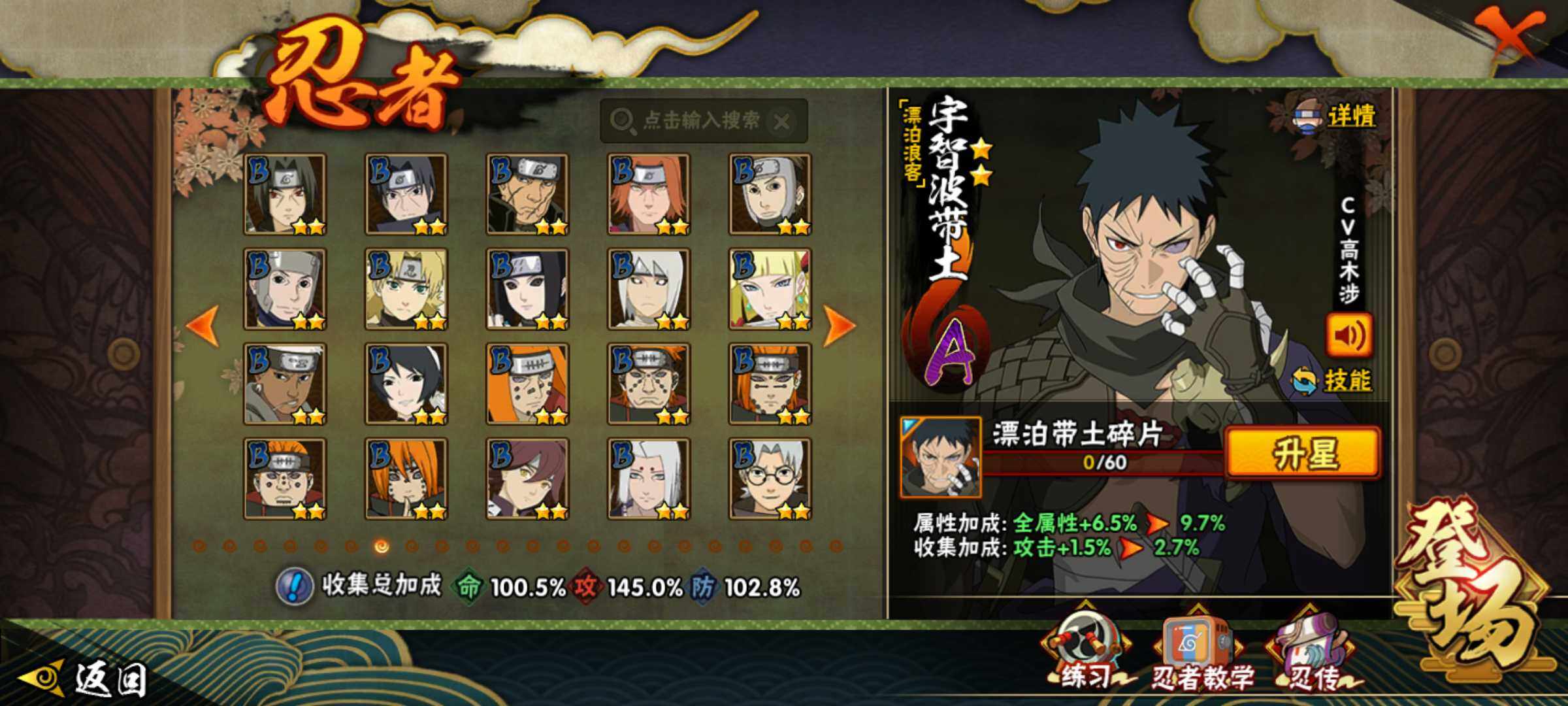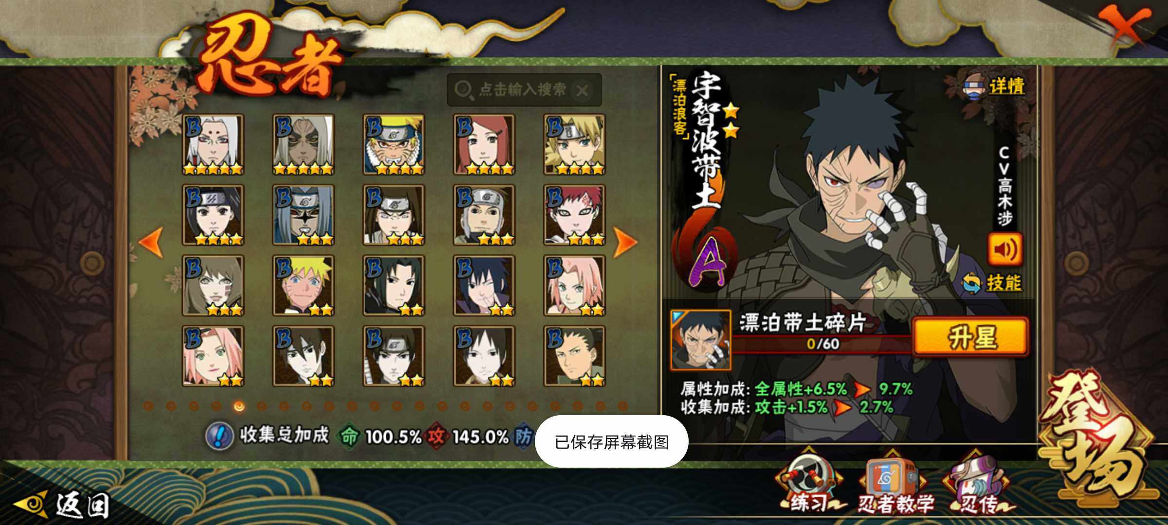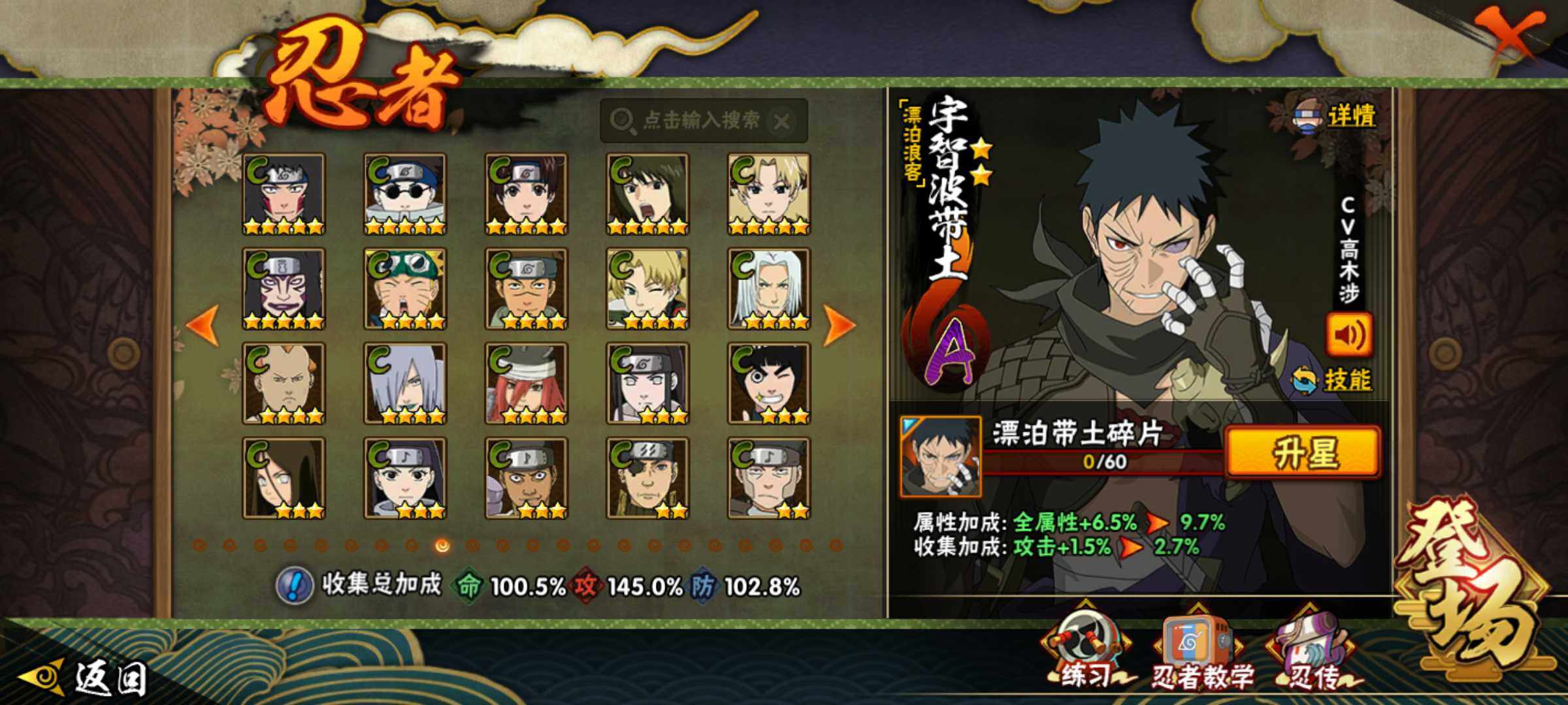 【S级忍者】:长门「秽土转生」(3星),宇智波斑「秽土转生·解」(3星),春野樱「忍界大战」(3星),宇智波带土「忍界大战」(3星),艾「忍界大战」(3星),宇智波鼬「须佐能乎」(3星),旗木卡卡西「须佐能乎」(3星),自来也「舞之豪杰」(3星),大蛇丸(3星),纲手(3星),猿飞日斩(4星),波风水门(3星),药师兜「仙人模式」(3星),神秘面具男「红夜