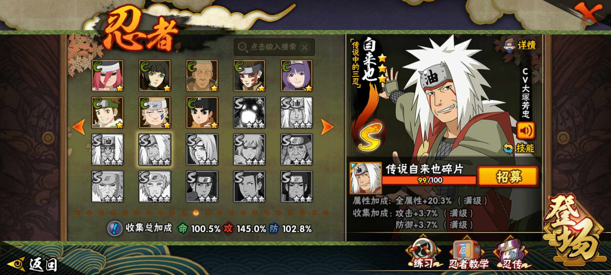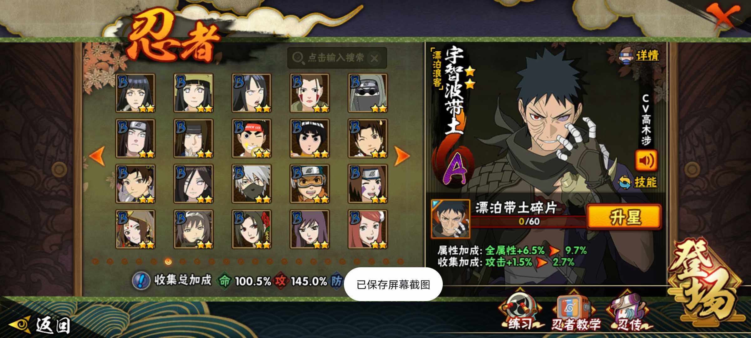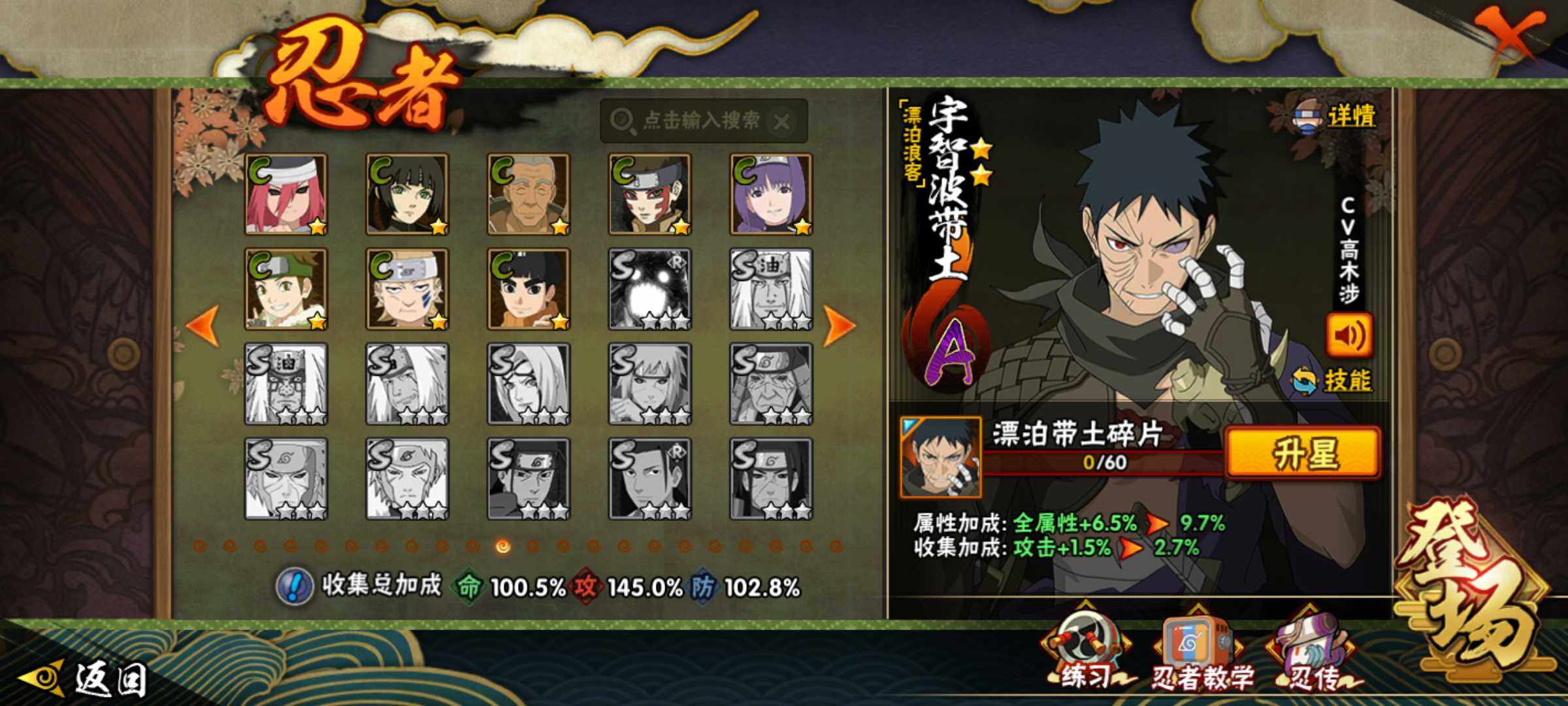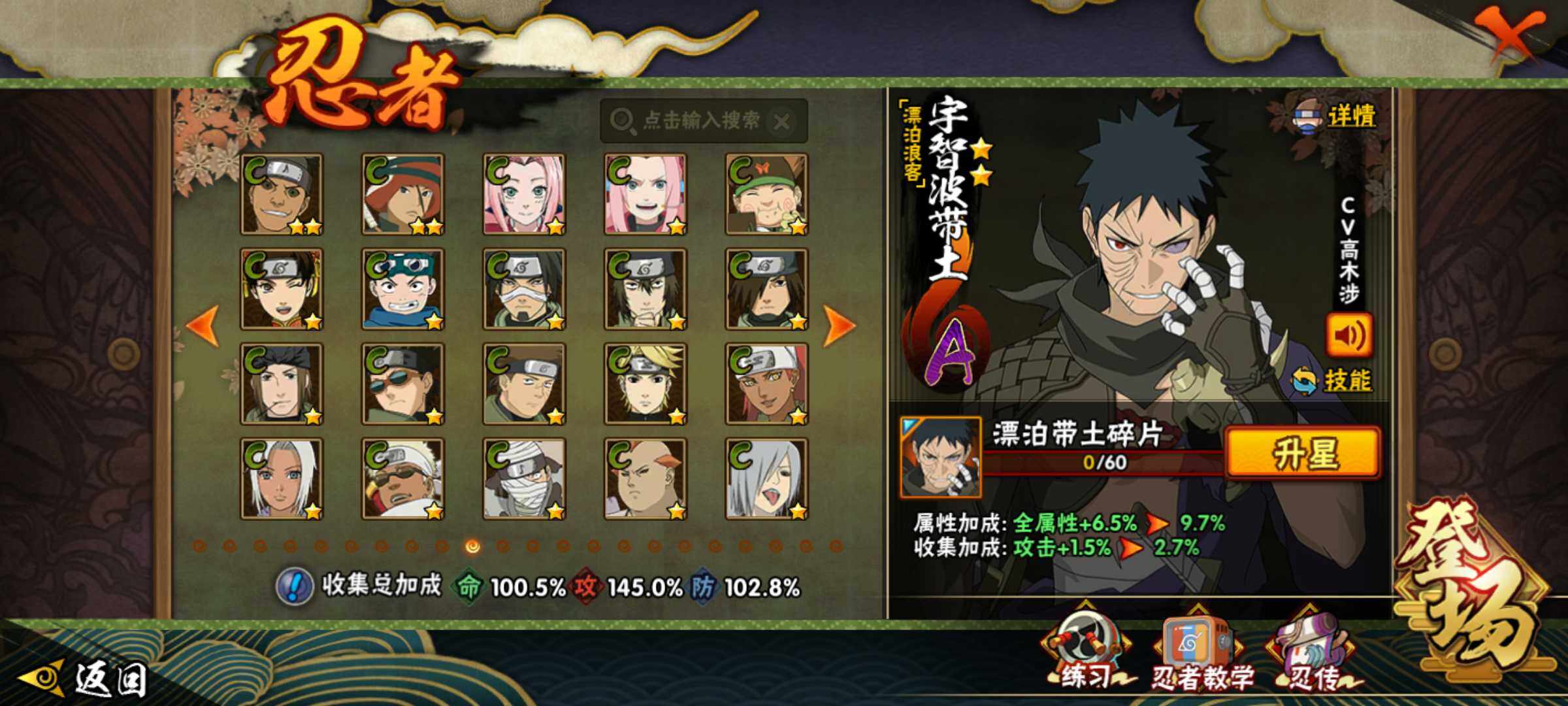 【S级忍者】:长门「秽土转生」(3星),宇智波斑「秽土转生·解」(3星),春野樱「忍界大战」(3星),宇智波带土「忍界大战」(3星),艾「忍界大战」(3星),宇智波鼬「须佐能乎」(3星),旗木卡卡西「须佐能乎」(3星),自来也「舞之豪杰」(3星),大蛇丸(3星),纲手(3星),猿飞日斩(4星),波风水门(3星),药师兜「仙人模式」(3星),神秘面具男「红夜
