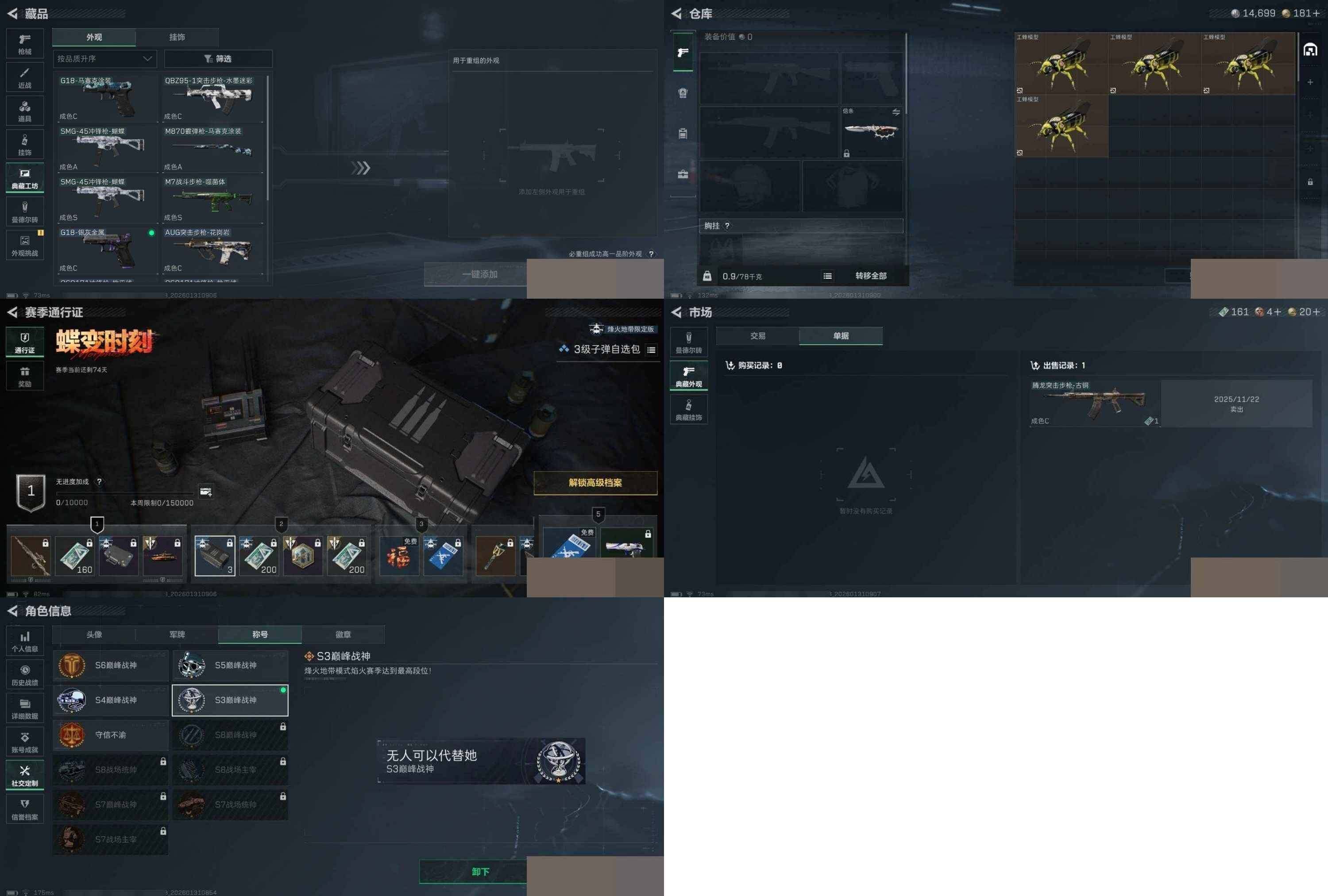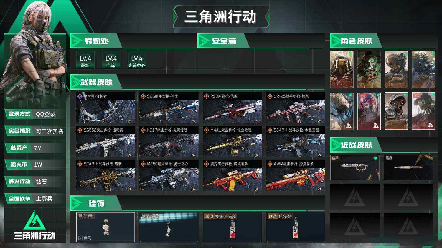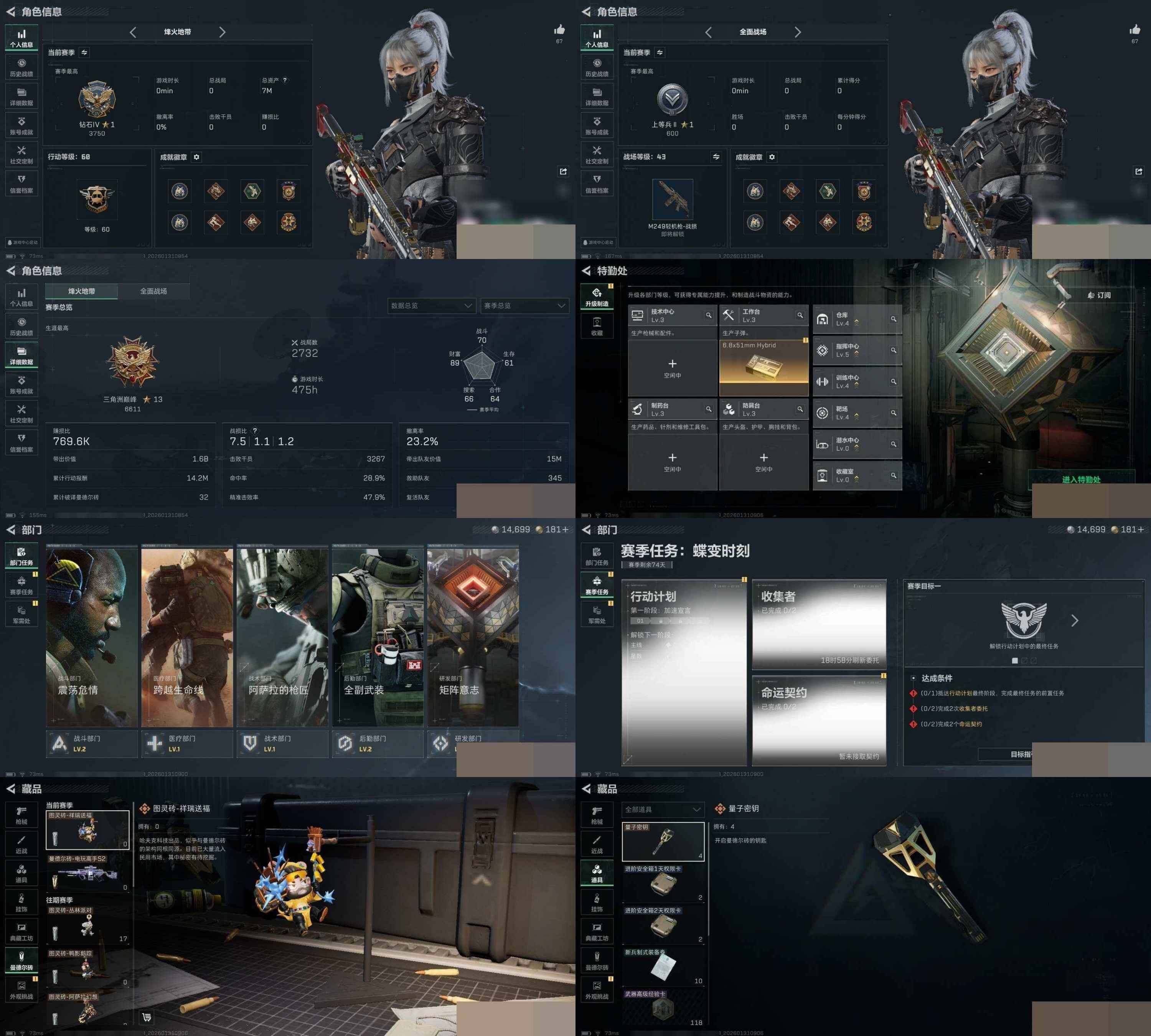 总资产6m 红狼 露娜 水墨 午夜邮差 信条 烽火地带段位: 钻石 全面战场段位: 上等兵 总资产: 6000000 哈夫币: 14000