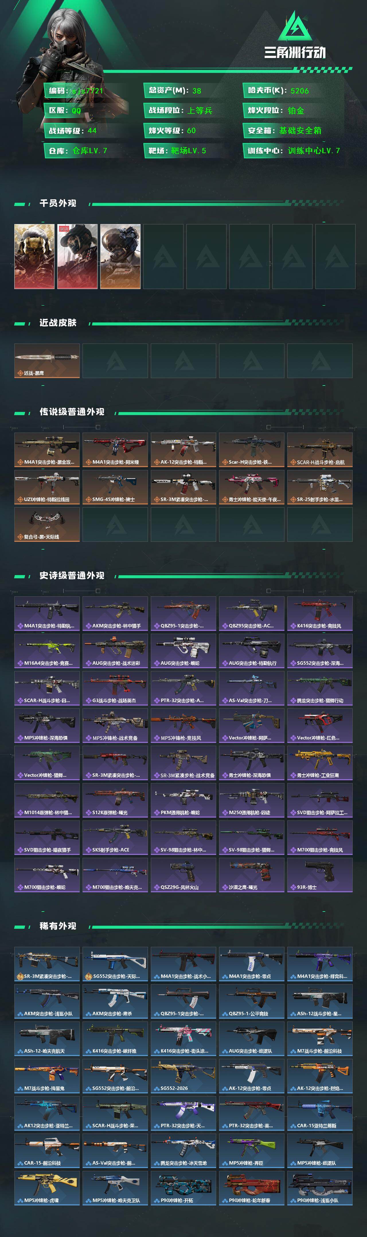 【sjs7721】总资产30m 红狼 露娜 烽火地带段位: 铂金 全面战场段位: 上等兵 总资产: 38000000 哈夫币: 5206000 sjs7721 干员外观: 红狼-蚀金玫瑰,威龙-壮志凌云(S3),露娜-黑·天际线 传说武器皮肤: M4A1突击步枪-蚀金玫瑰,SCAR-H战斗步枪-铁艺苍穹,SR-25射手步枪-水墨云图,SMG45冲锋枪-骑士,M4A1突击步枪-阿米娅,复合弓-黑-天际线,AK-12突击步枪-特斯拉线圈,SR-3M紧凑突击步枪-特斯拉线圈,UZI冲锋枪-特斯拉线圈