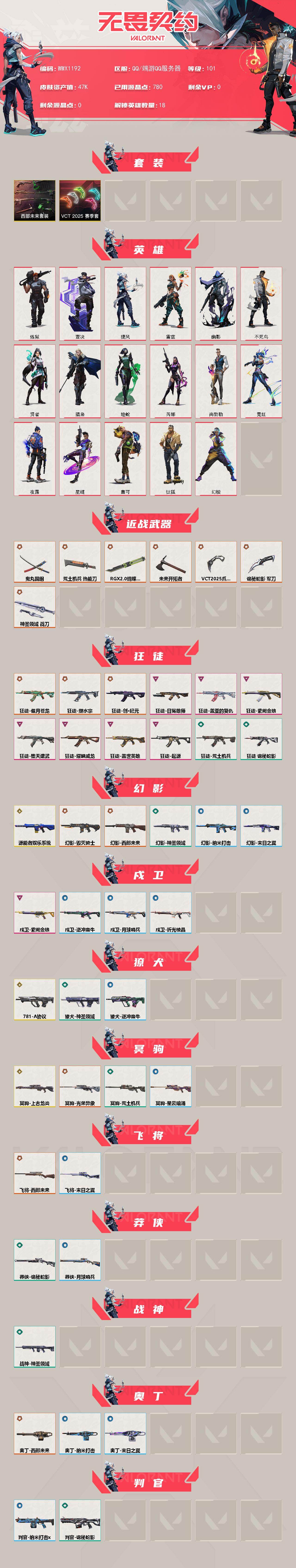 【WWX1192】终极*16/传奇*3/卓越*10/皮肤*71/等级*101/段位:未定级/VCT 2025 赛季套装/西部未来套装/幻棱/炼狱/钛狐/壹决/捷风/雷兹/幽影/不死鸟/贤者/猎枭/蝰蛇/芮娜/尚勃勒/霓虹/夜露/星礈/盖可/近战武器-RGX 11z Pro//2.0 蝴蝶刀/近战武器-VCT 2025 爪刀/近战武器-鬼丸国纲/近战武器-未来开拓者/近战武器-荒土机兵 热能刀/近战武器-诡秘蛇影 军刀/近战武器-神圣领域 战刀/狂徒-塑水宗/狂徒-偃月苍龙/狂徒-创·纪元/狂徒-