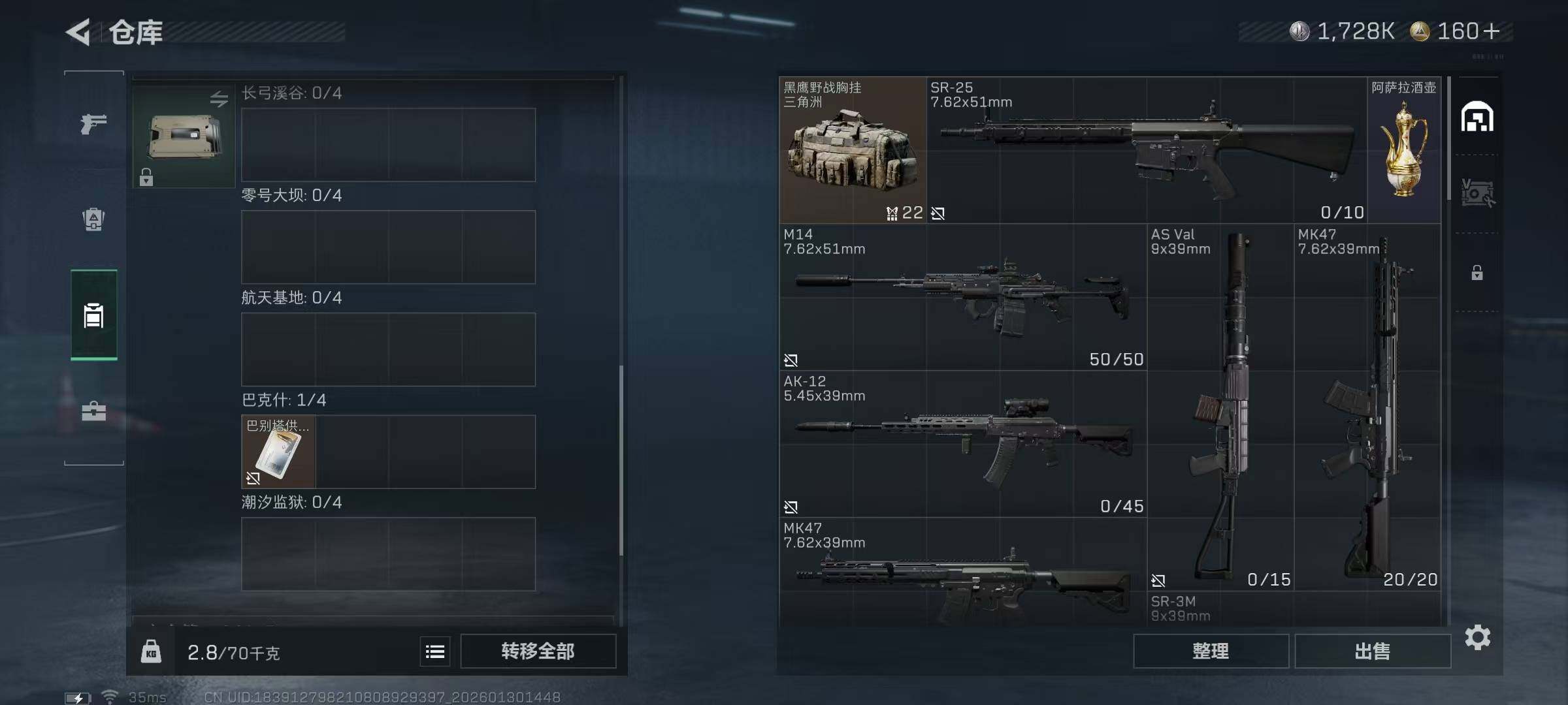 总资产(M):19M/哈夫币(K):1728K/传说枪皮数:6/全面战场等级:5_段位:无段位/烽火地带等级:36_段位:青铜
