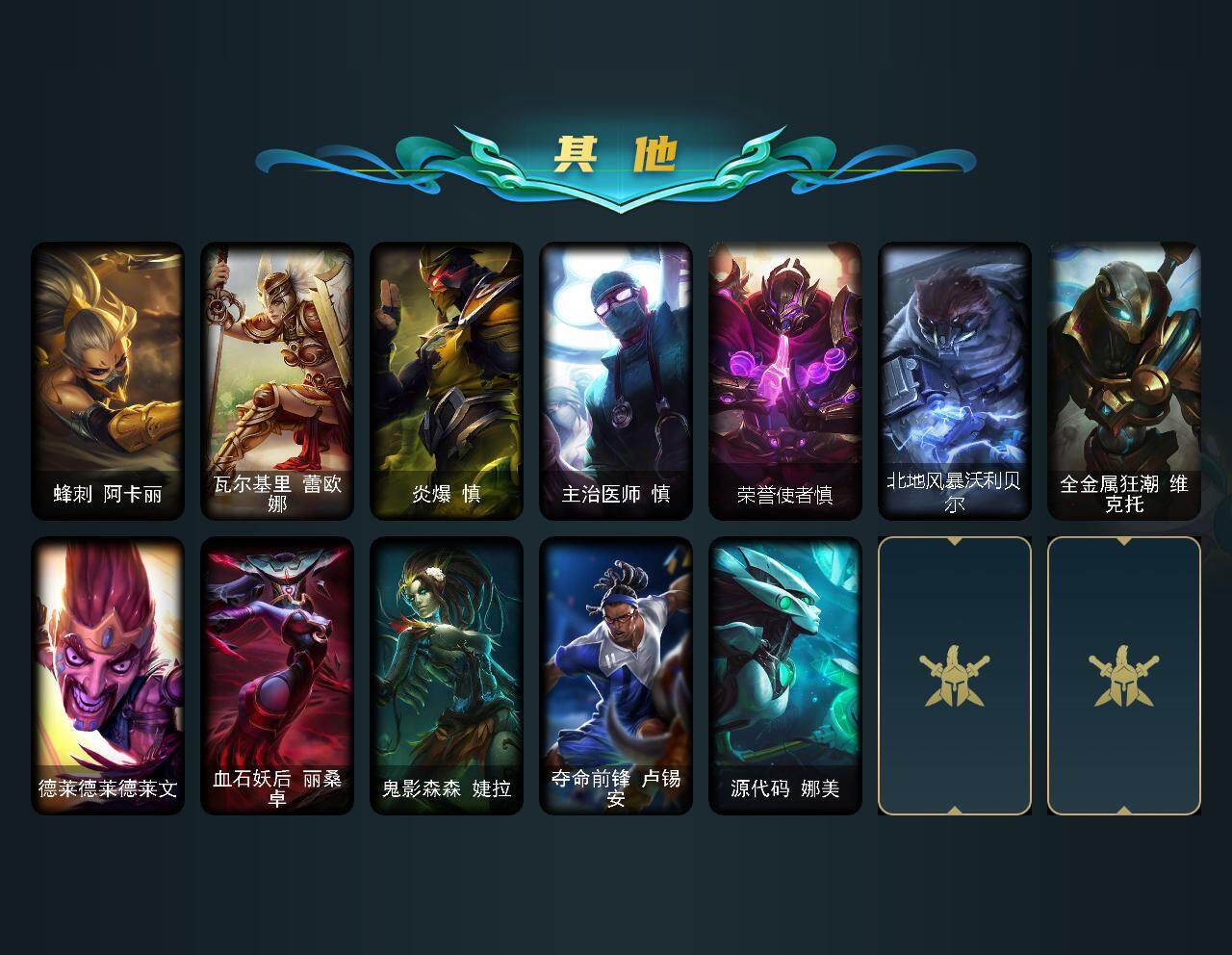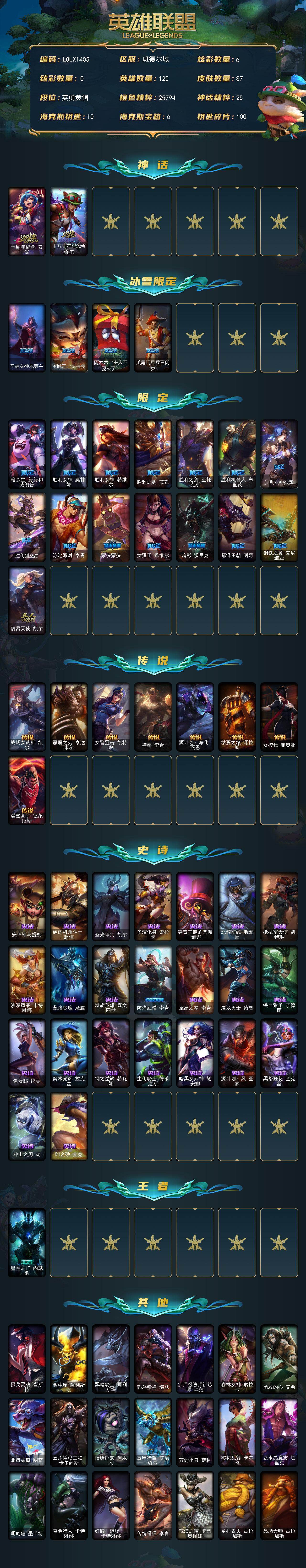【LOLX1405】125英雄/87皮肤/2神话/20限定/6炫彩/8传说/23史诗/青铜/幸福女神乐芙兰/圣诞开心鬼提莫/阿木木“主人不要我了”/英勇玩具兵普朗克/十周年纪念安妮/十五周年纪念希维尔/暗杀星努努和威朗普/胜利女神莫甘娜/胜利女神希维尔/胜利之树茂凯/胜利之剑亚托克斯/胜利机器人布里茨/胜利女神娑娜/胜利剑圣易/泳池派对李青/蒙多蒙多/女猎手希维尔/暗影沃里克/都铎王朝图奇/钢铁之翼艾尼维亚/防暴天使凯尔/战场女武神凯尔/恶魔之刃泰达米尔/女警狙击凯特琳/神拳李青/源计划净化薇恩