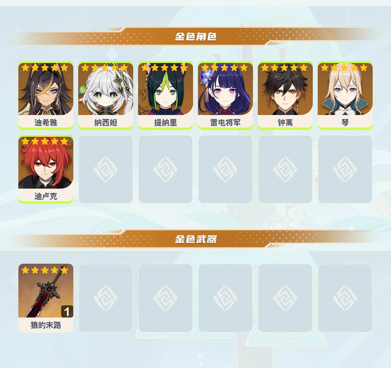 【YSX1604】42级/8黄/女主/7个五星角色/1个五星武器/钟离/雷电将军/纳西妲/提纳里/迪卢克/琴/迪希雅/狼的末路