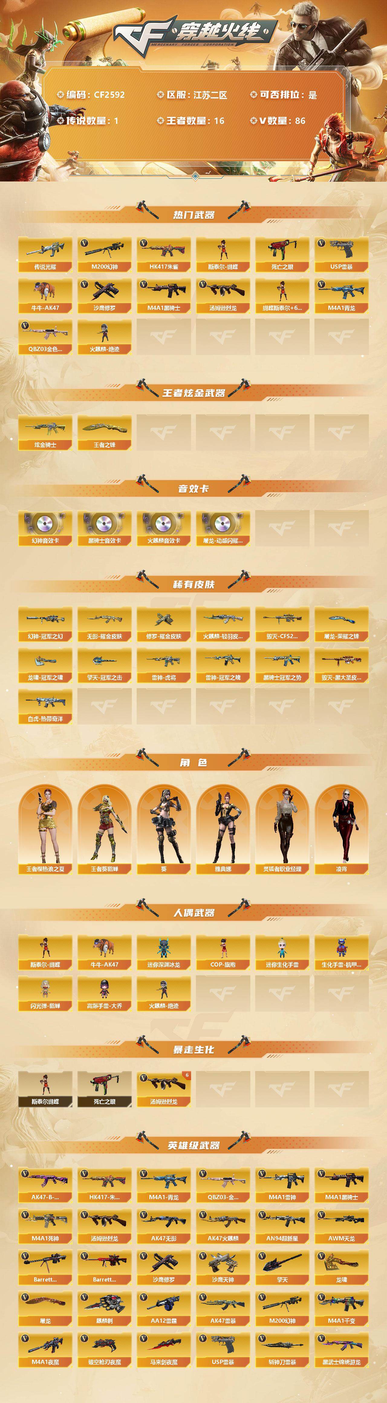 【CF2592】【商品标题】:江苏二区-86V-16王者-2炫金【幻神1皮】【6烈龙】【斯泰尔-蝴蝶】【死亡之眼】【传说光耀】【M200-幻神】【幻神-冠军之幻】【M200-幻神音效卡】【白虎-热带奇洋 皮肤】【QBZ03-金色蔷薇】【AK47-雷暴】【M4A1-青龙】【HK417-朱雀】【M4A1-夜魔】【USP-雷暴】【破空枪刃-夜魔】【魂·炼狱-玩具枪】【汤姆逊-烈龙】【斯泰尔-蝴蝶】【死亡之眼】【葵】【凌霄】【奇洋探员】【蛇隐宗】【王者-葵-貂蝉】【王者樱-热浪之夏】【M4A1-雷神】【