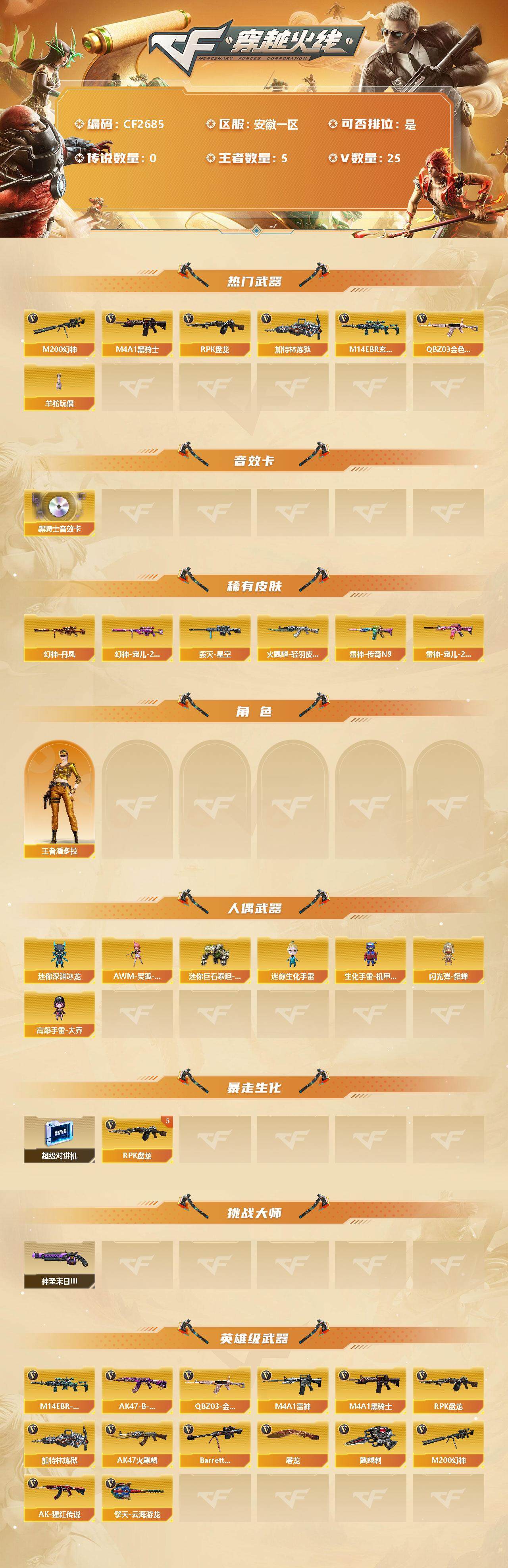 【CF2685】【商品标题】:安徽一区-25V-5王者-0炫金【幻神2皮】【M200-幻神】【幻神-宠儿-2021MVP】【幻神-丹凤】【QBZ03-金色蔷薇】【M14EBR-玄武】【加特林-炼狱】【RPK-盘龙】【烈龙-云海游龙】【王者潘多拉】【云海玲珑】【M4A1-雷神】【雷神-宠儿-2019MVP】【雷神-传奇N9】【M4A1-雷神-新春神龙皮肤】【雷神-烈虎皮肤】【AK47-火麒麟】【火麒麟-轻羽皮肤】【M4A1-黑骑士】【M4A1-黑骑士音效卡】【Barrett-毁灭】【巴雷特-毁灭-