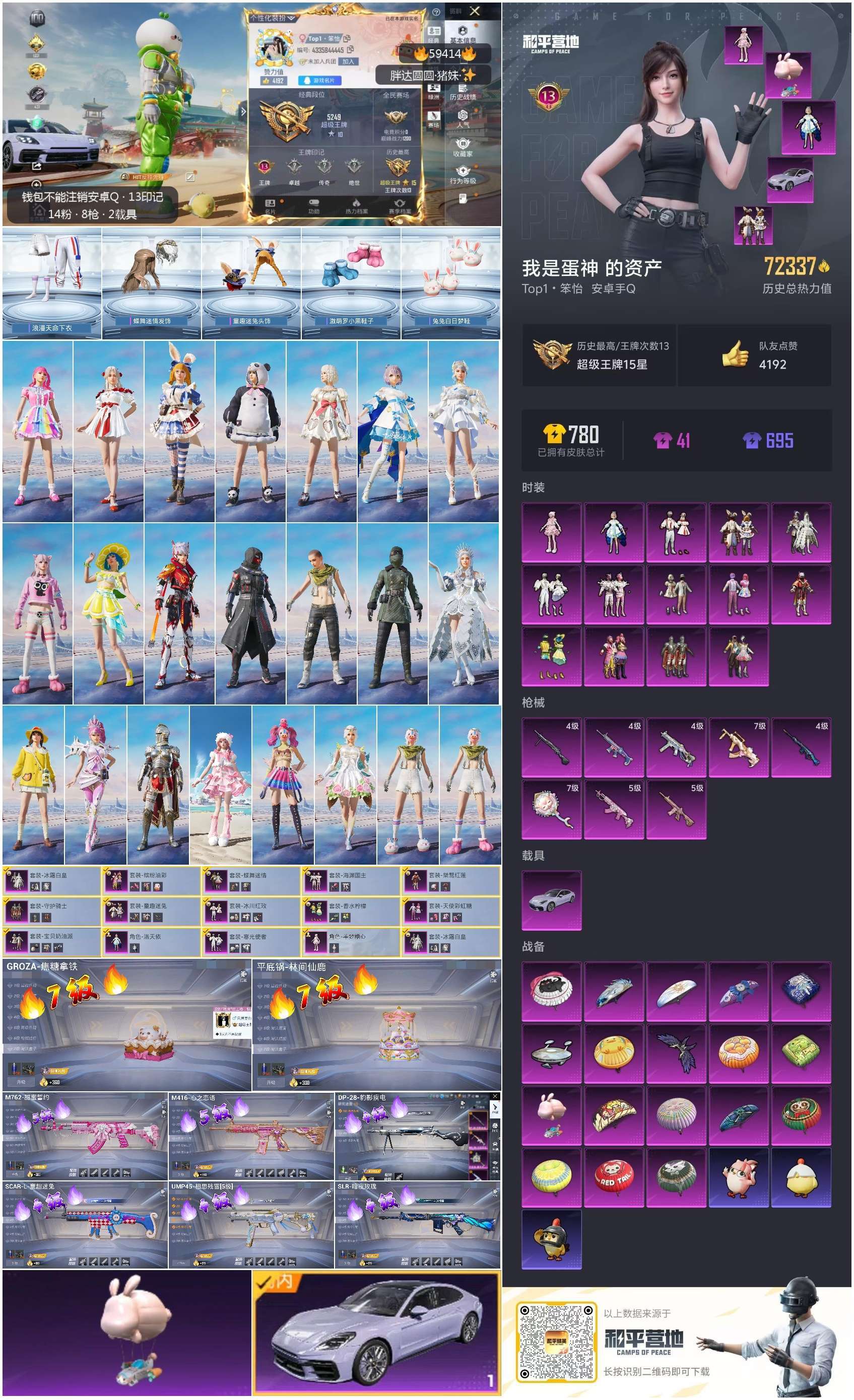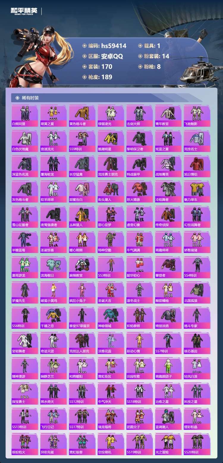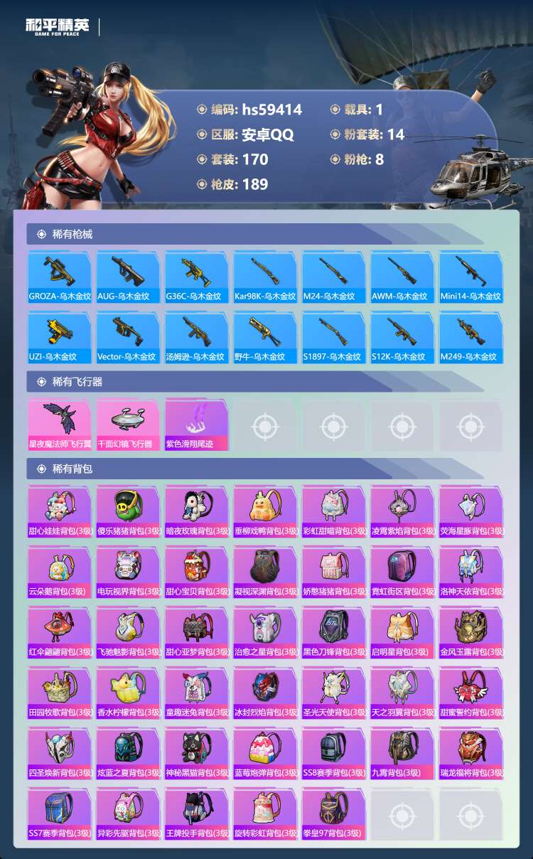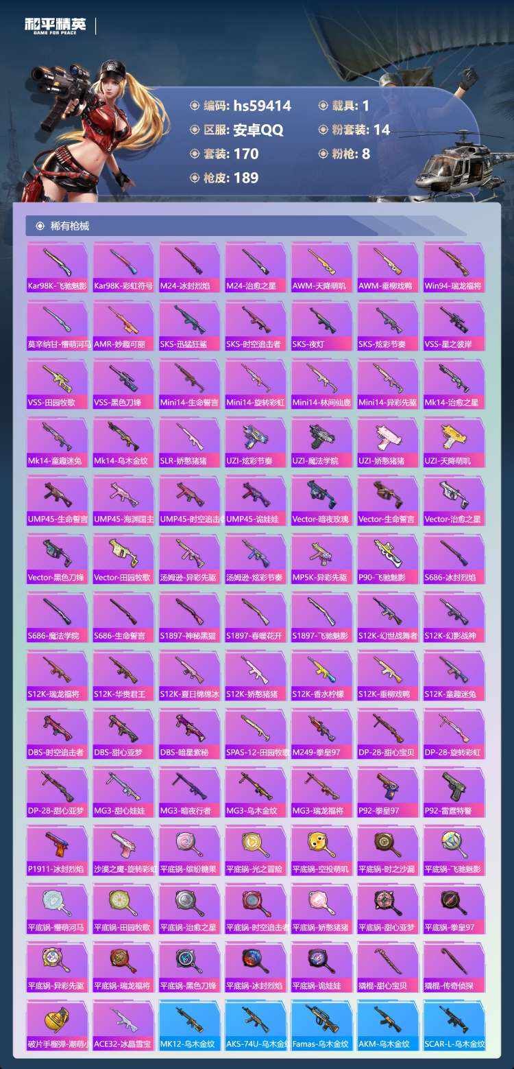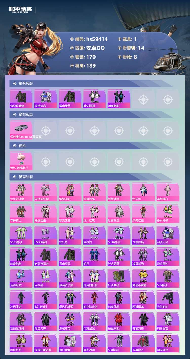 hs59414 安卓手Q-13王牌印记-14粉装-8特效枪-1载具-72337热力值-170套装-1