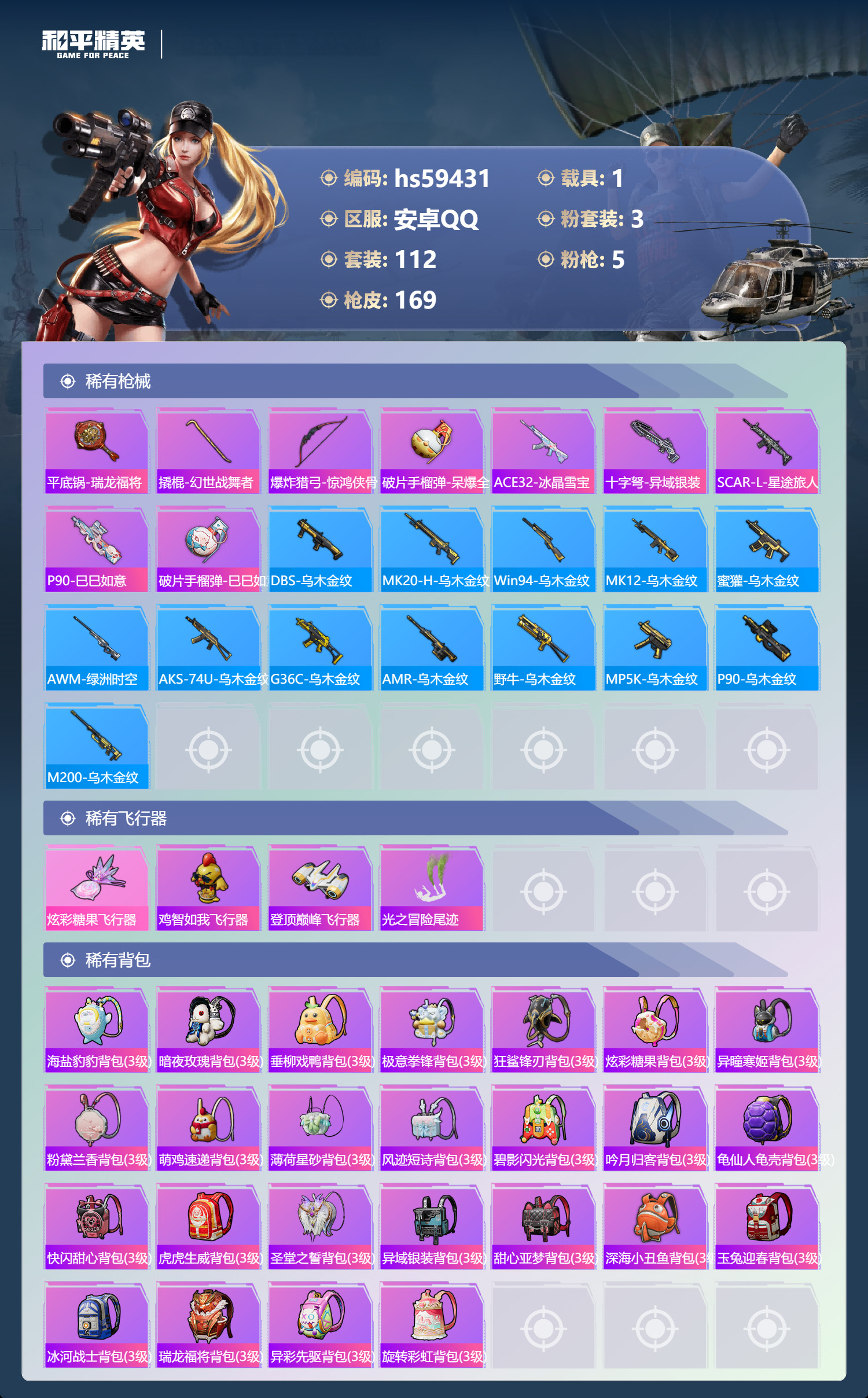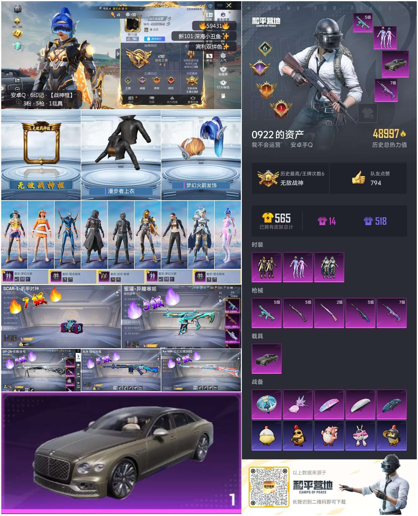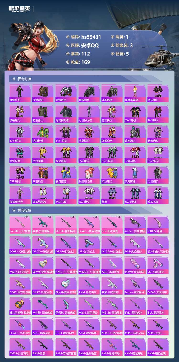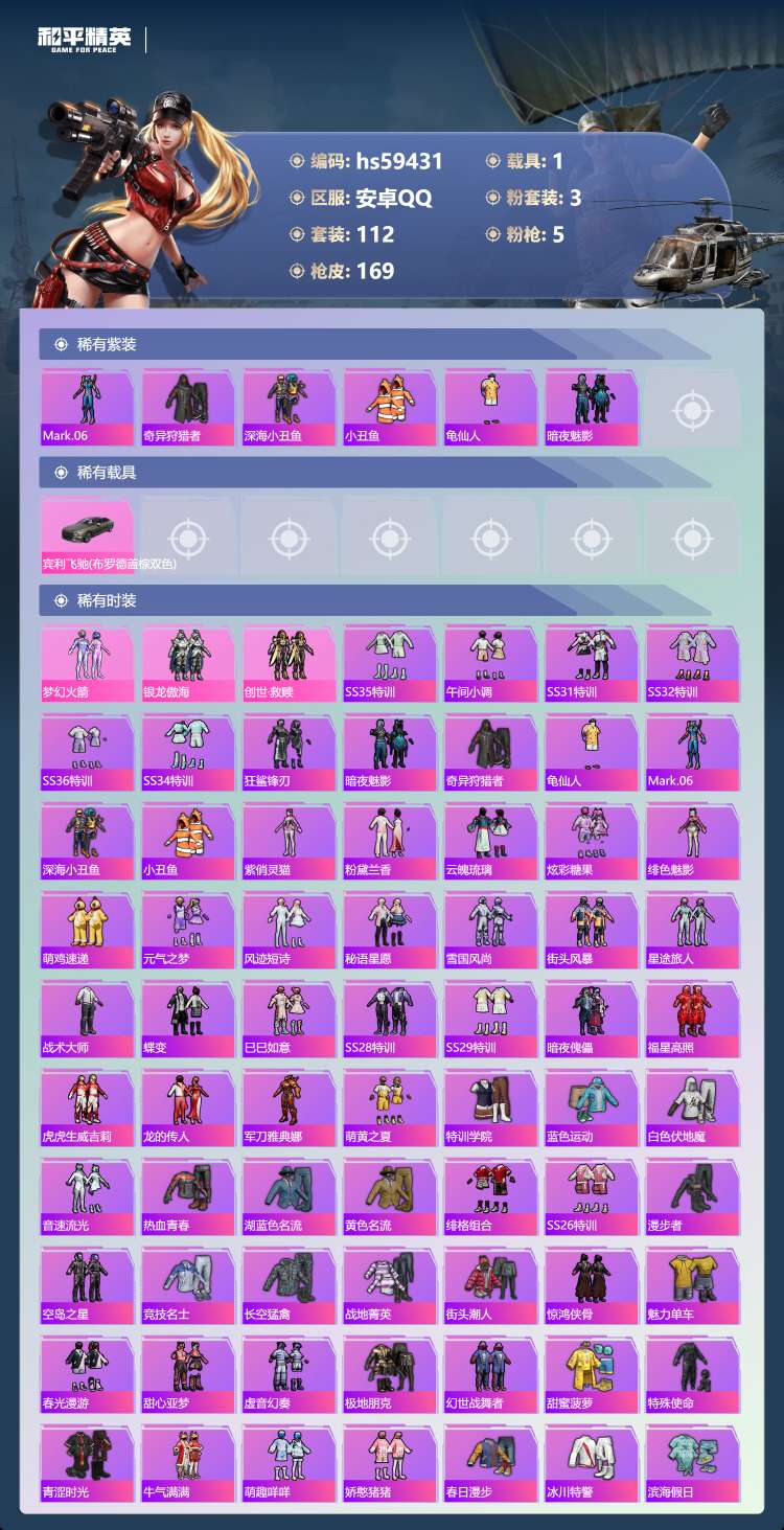 hs59431 安卓手Q-6王牌印记-有战神框-3粉装-5特效枪-1载具-48997热力值-112套
