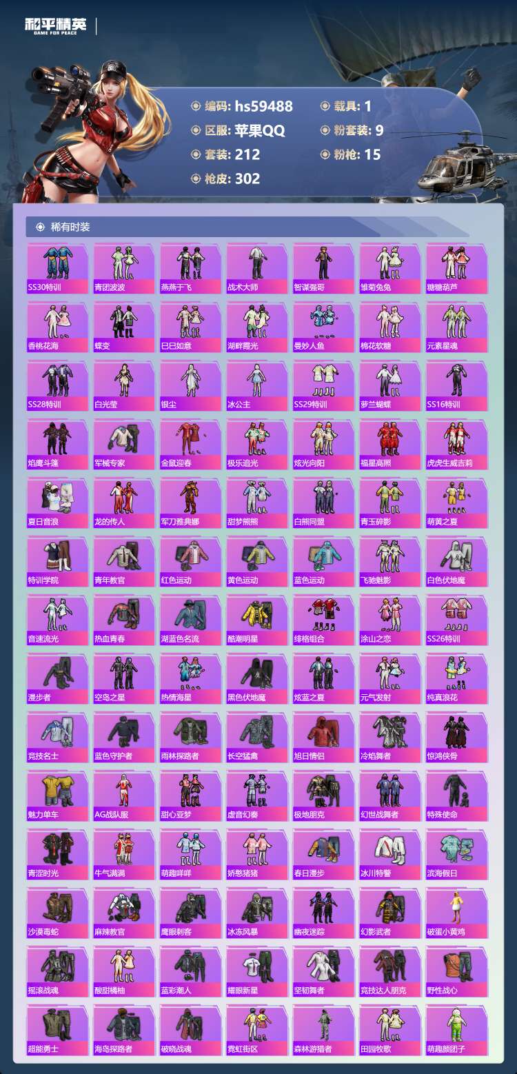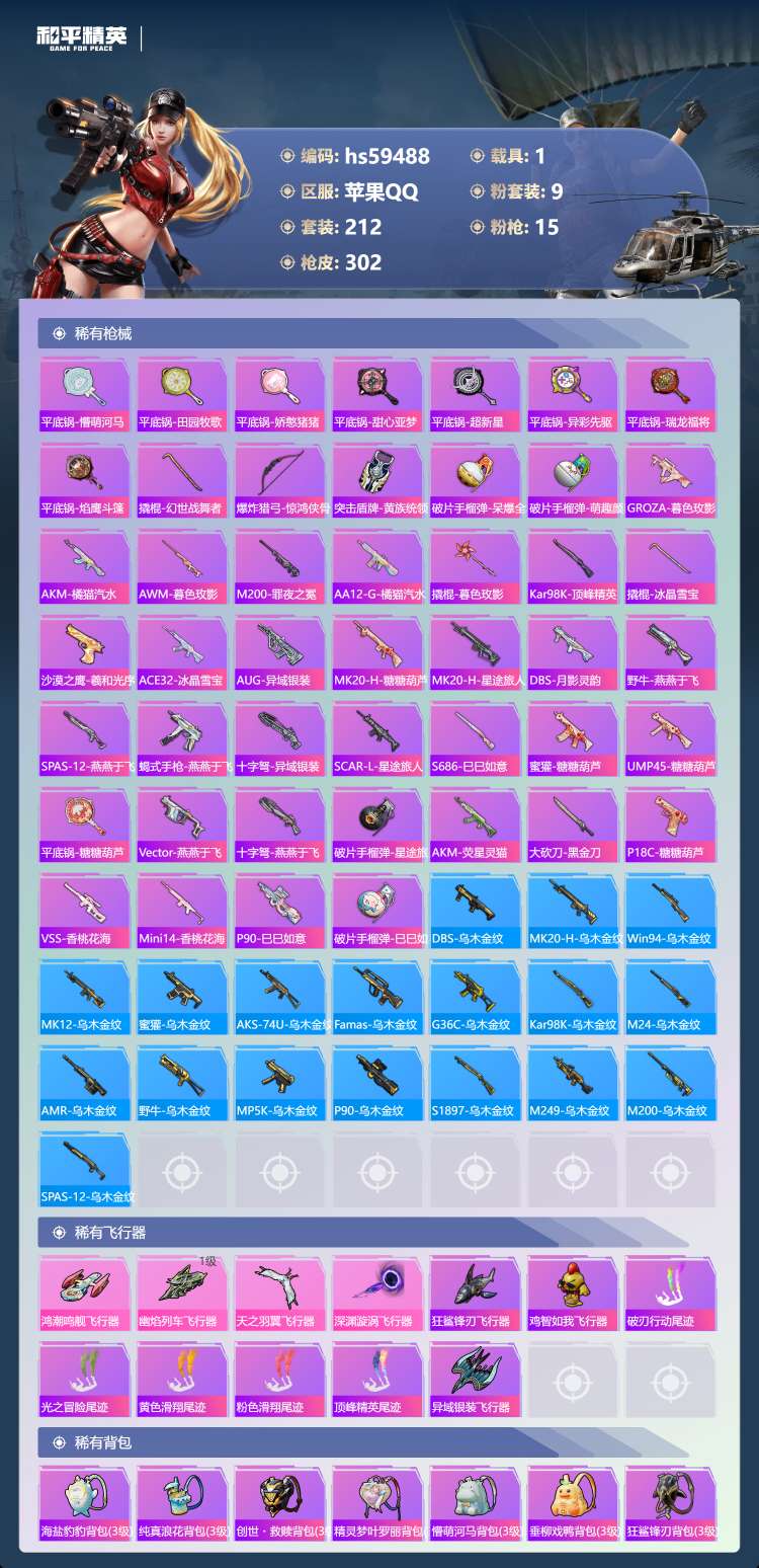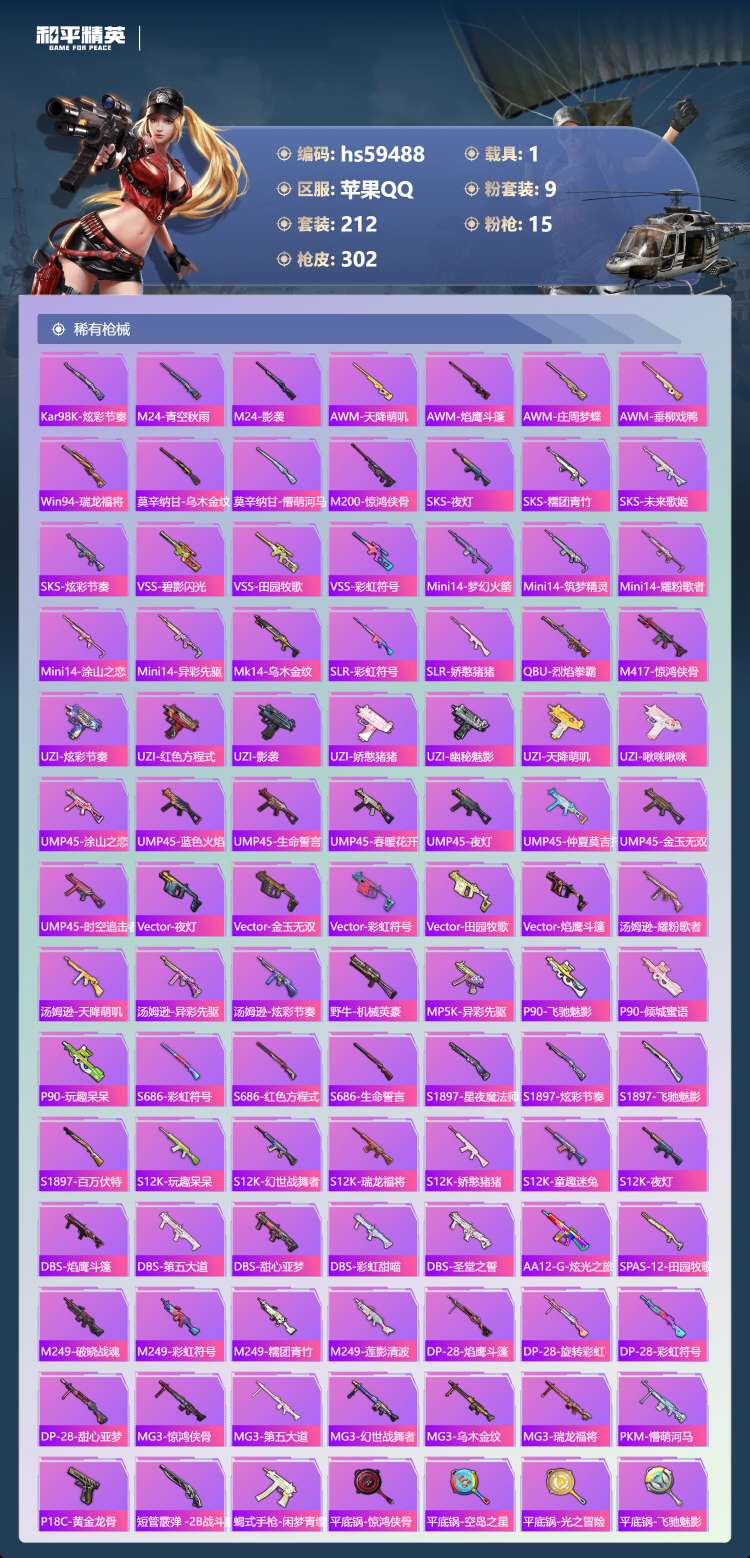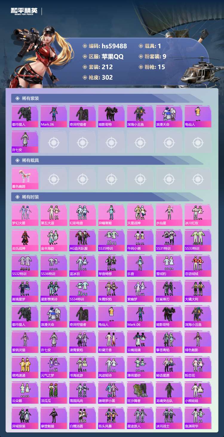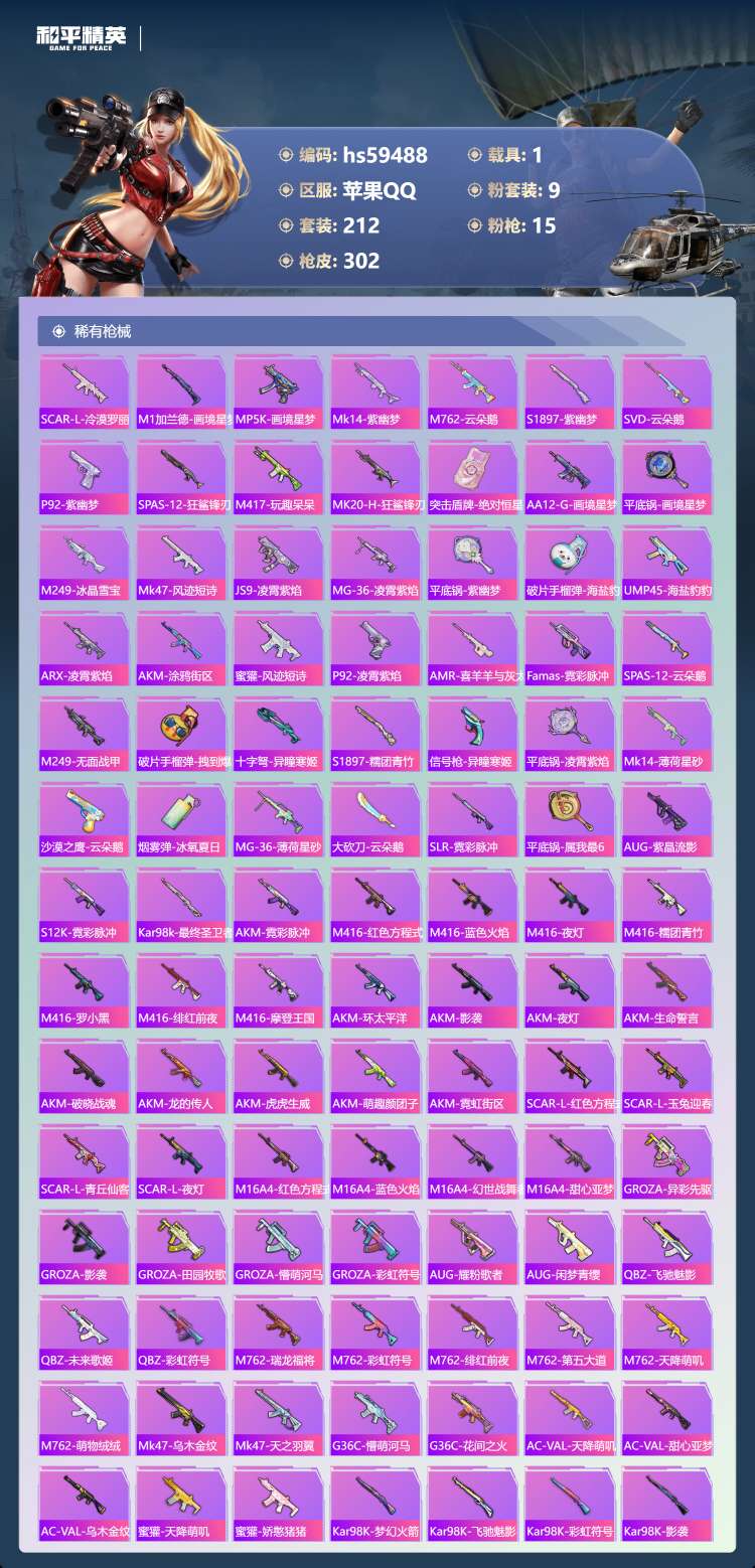 hs59488 苹果手Q-19王牌印记-9粉装-15特效枪-1载具-97449热力值-212套装-3