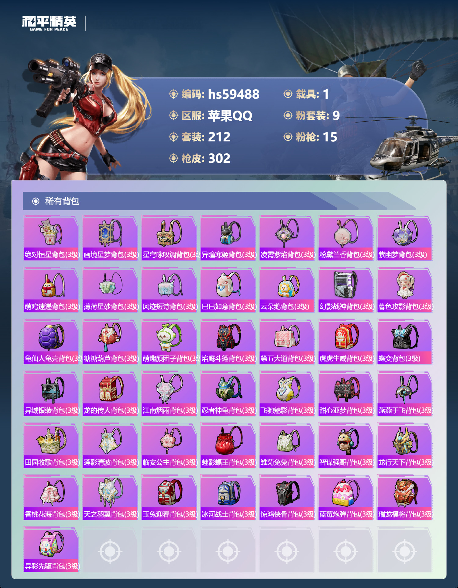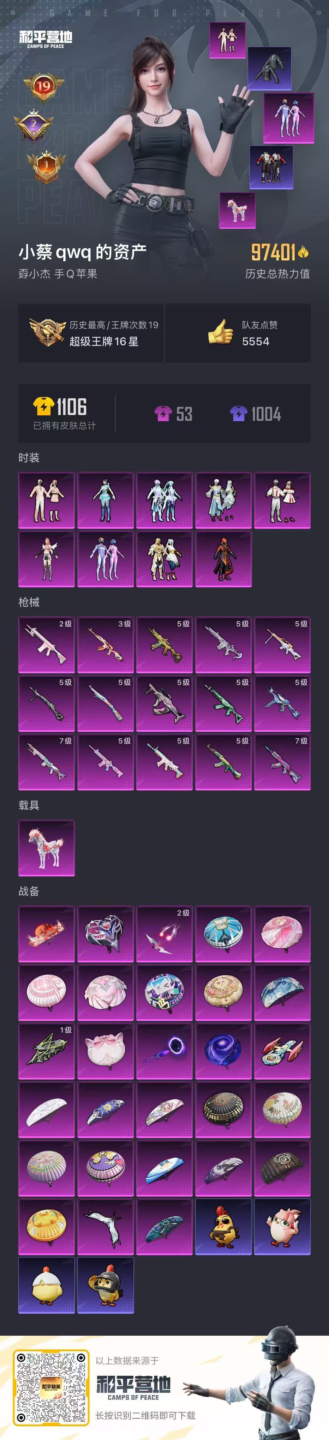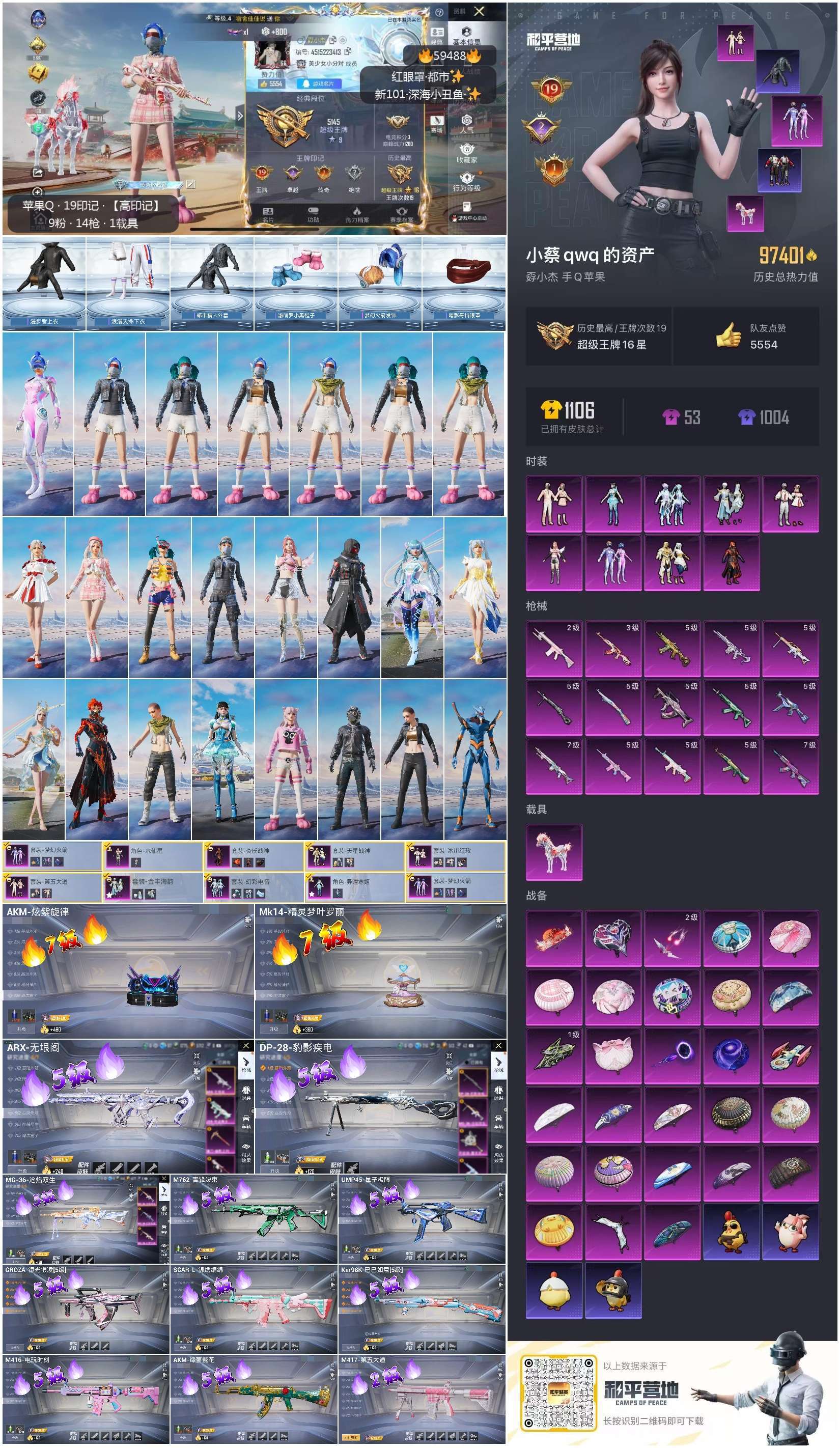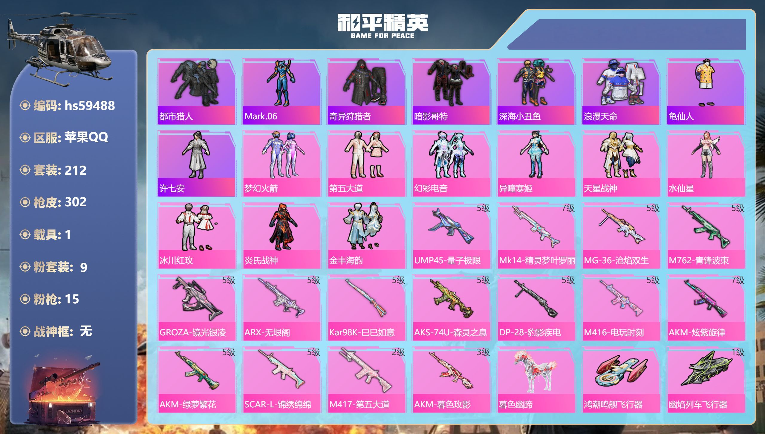 hs59488 苹果手Q-19王牌印记-9粉装-15特效枪-1载具-97449热力值-212套装-3