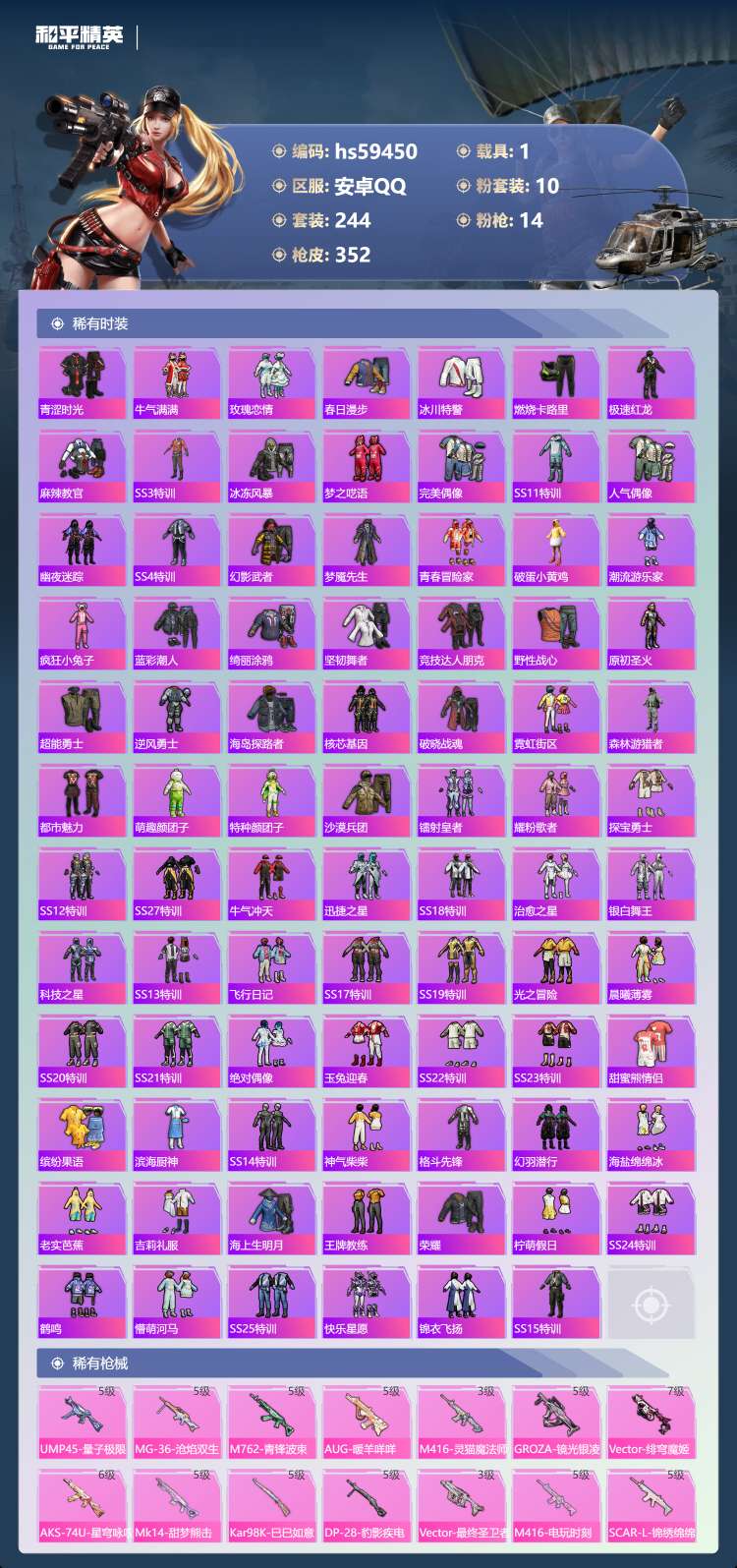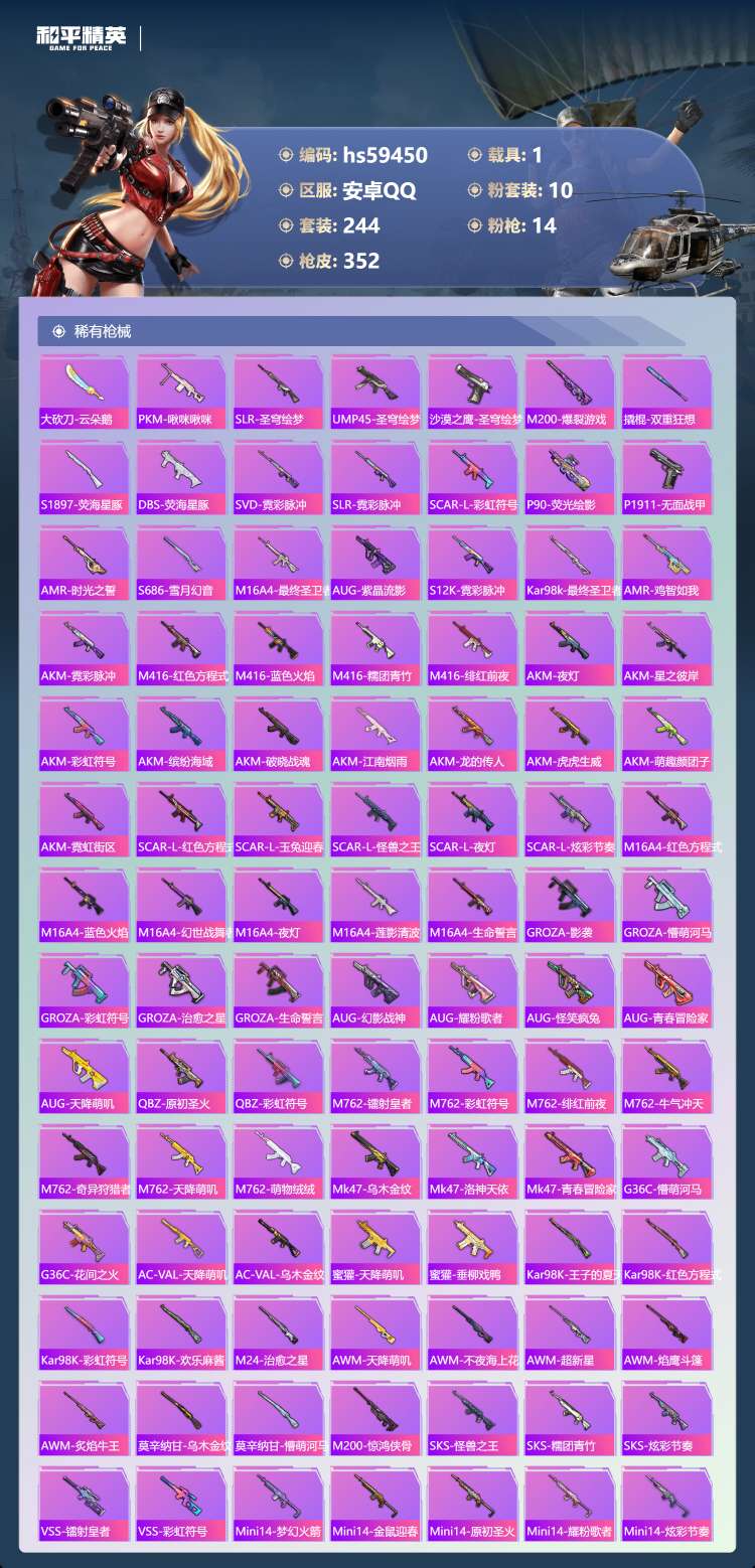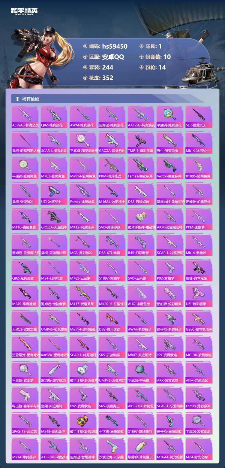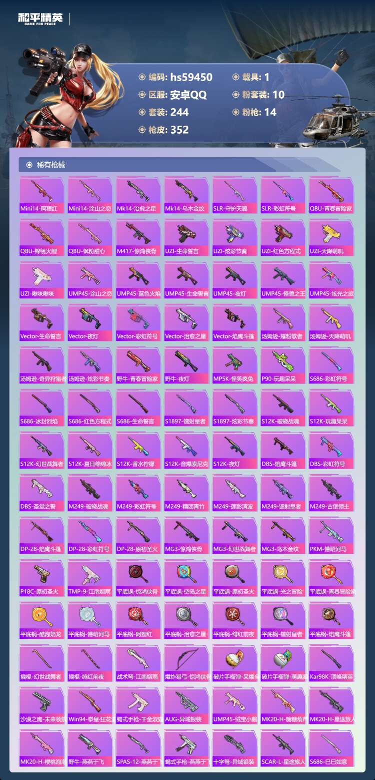 hs59450 安卓手Q-16王牌印记-10粉装-14特效枪-1载具-118815热力值-244套装