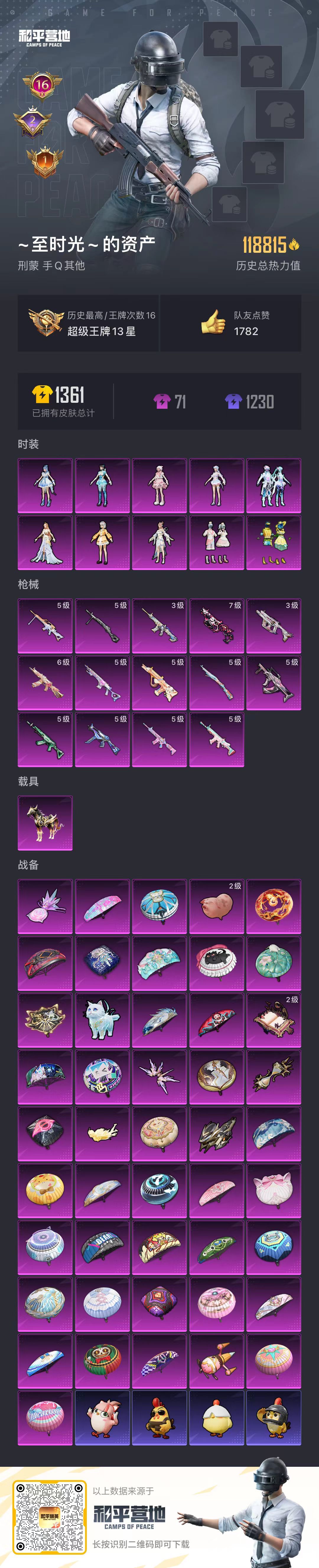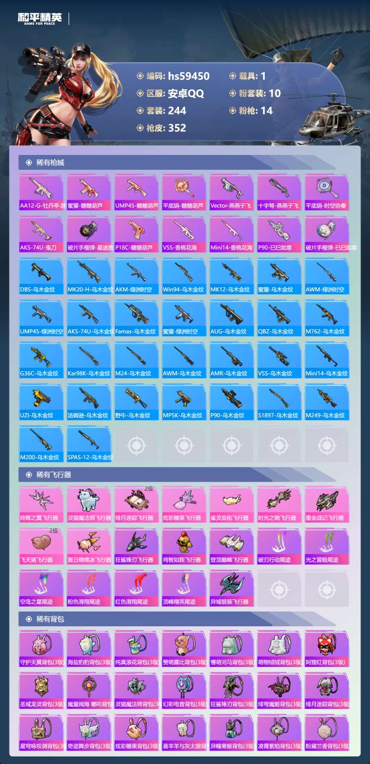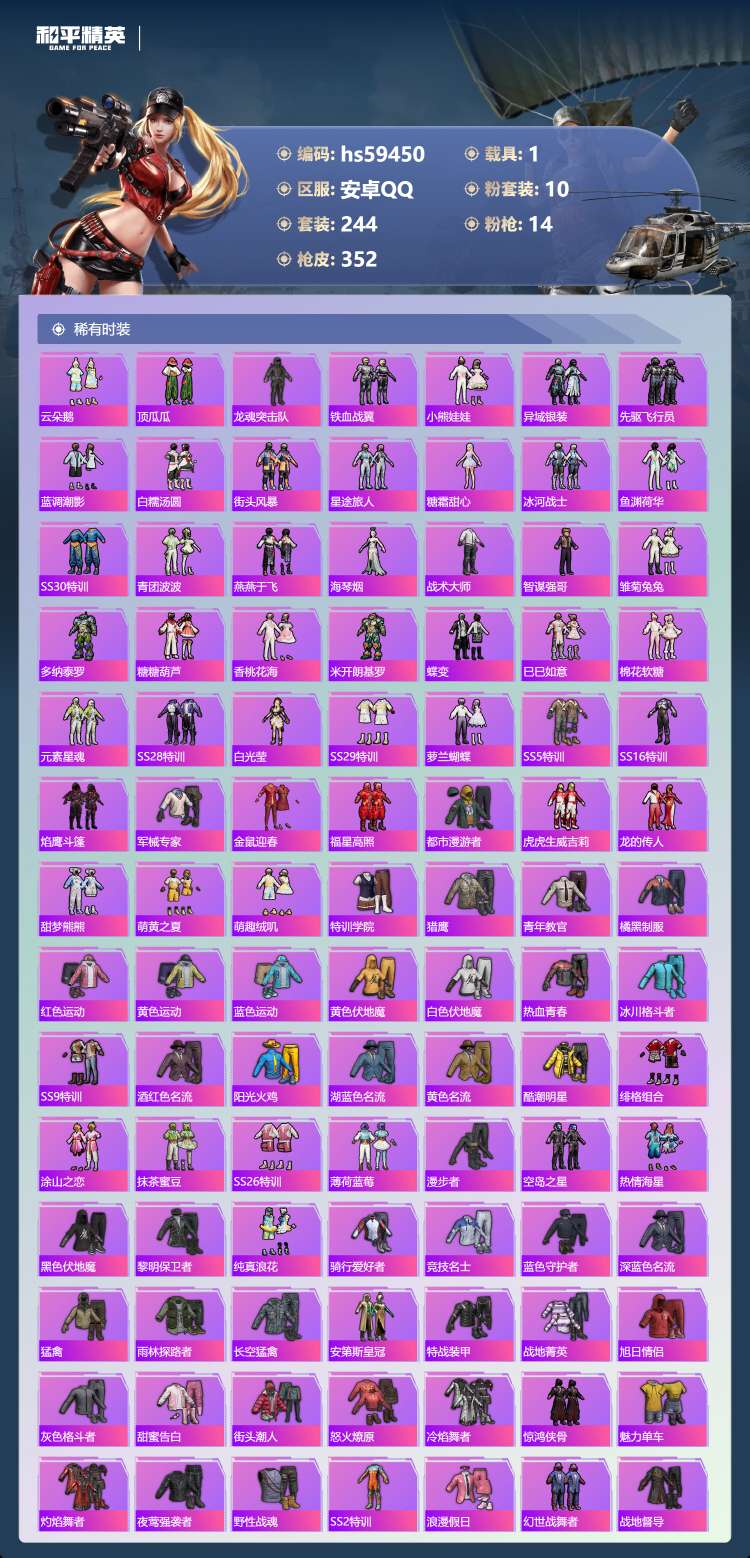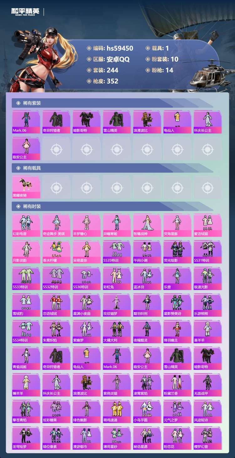 hs59450 安卓手Q-16王牌印记-10粉装-14特效枪-1载具-118815热力值-244套装
