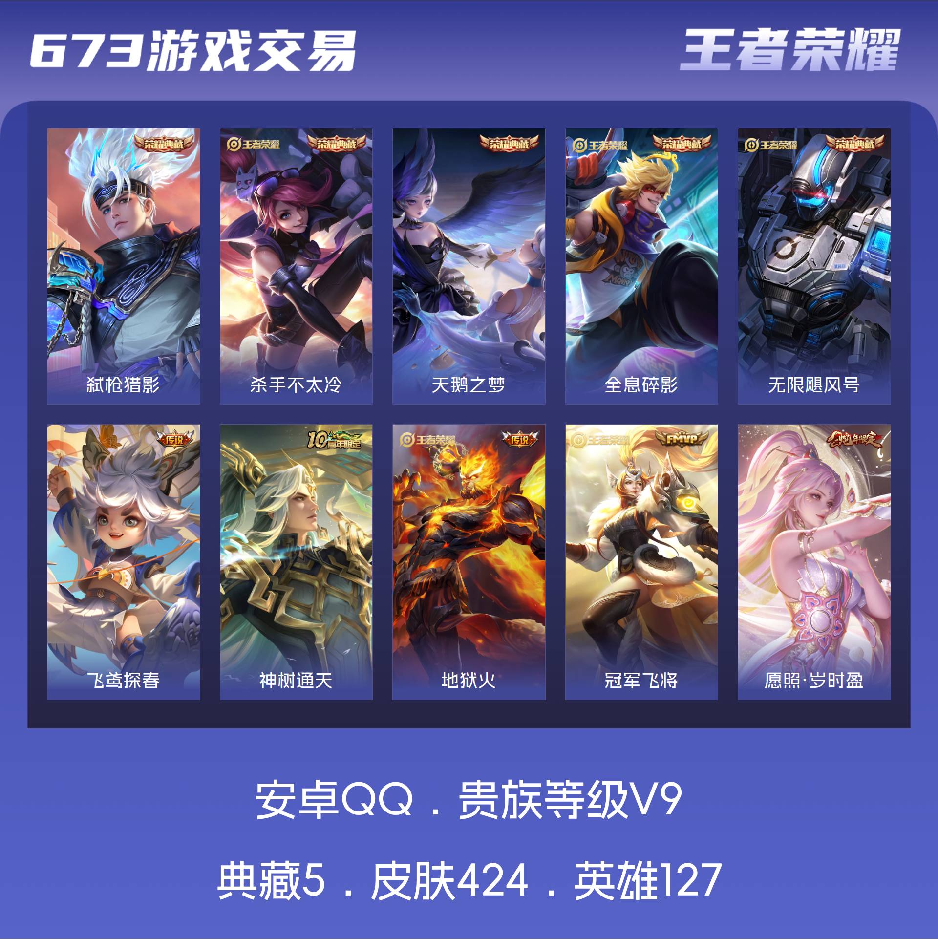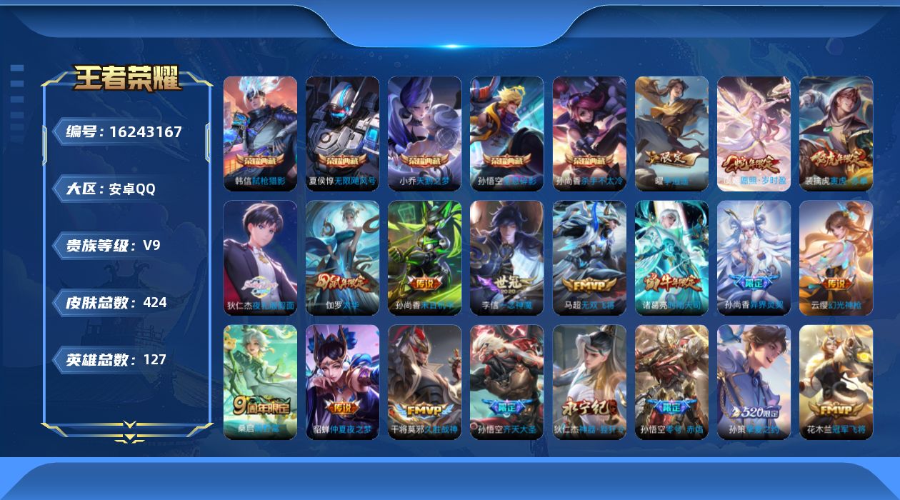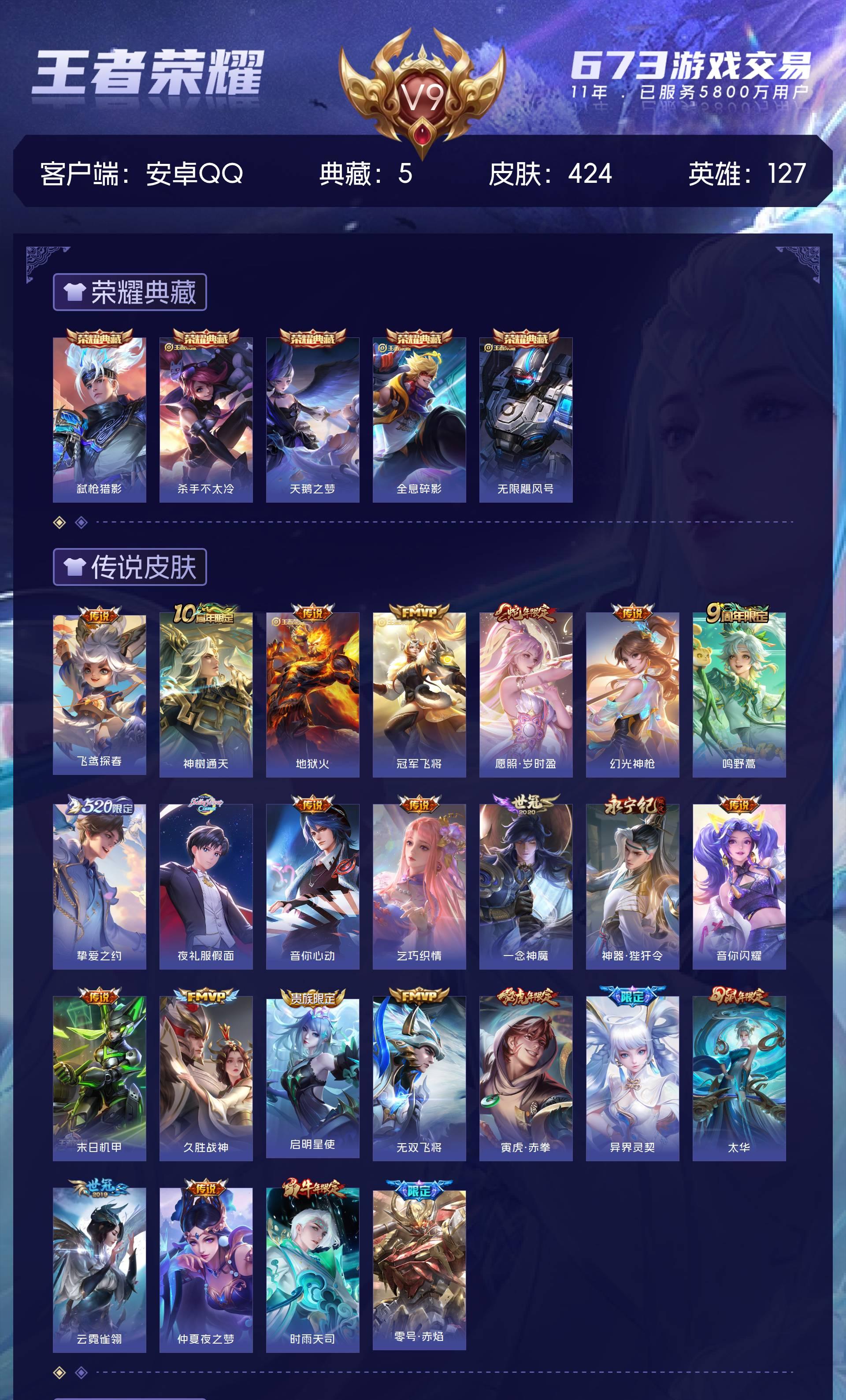V9 皮肤424 英雄127 至尊星耀 荣耀典藏5 传说26 其他皮肤397